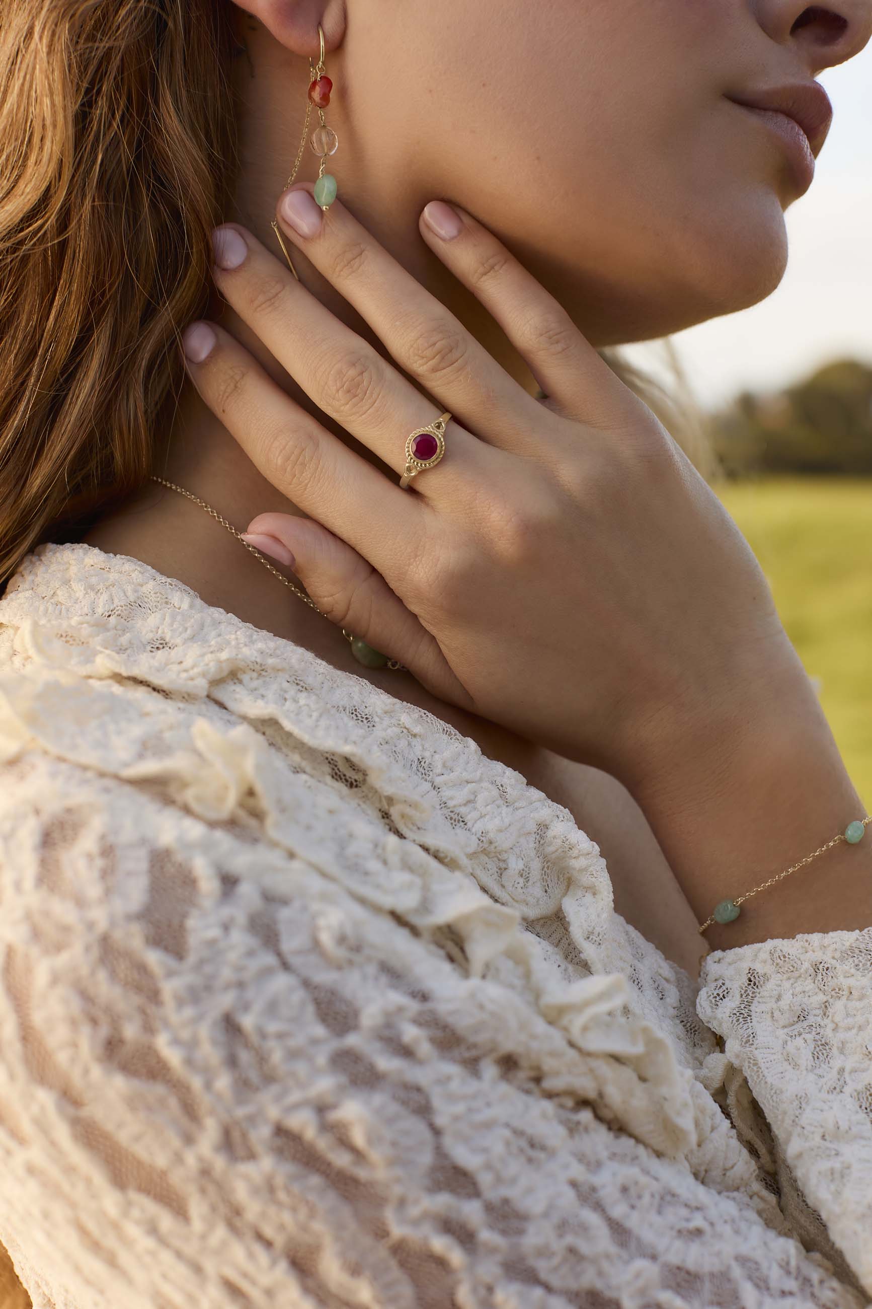 AMIT BAÑADO EN ORO esta hecho a mano con mucho amor. Su diseño destaca por tener un bonito y brillante Rubí en forma circular enmarcado por un fino entrelazado.