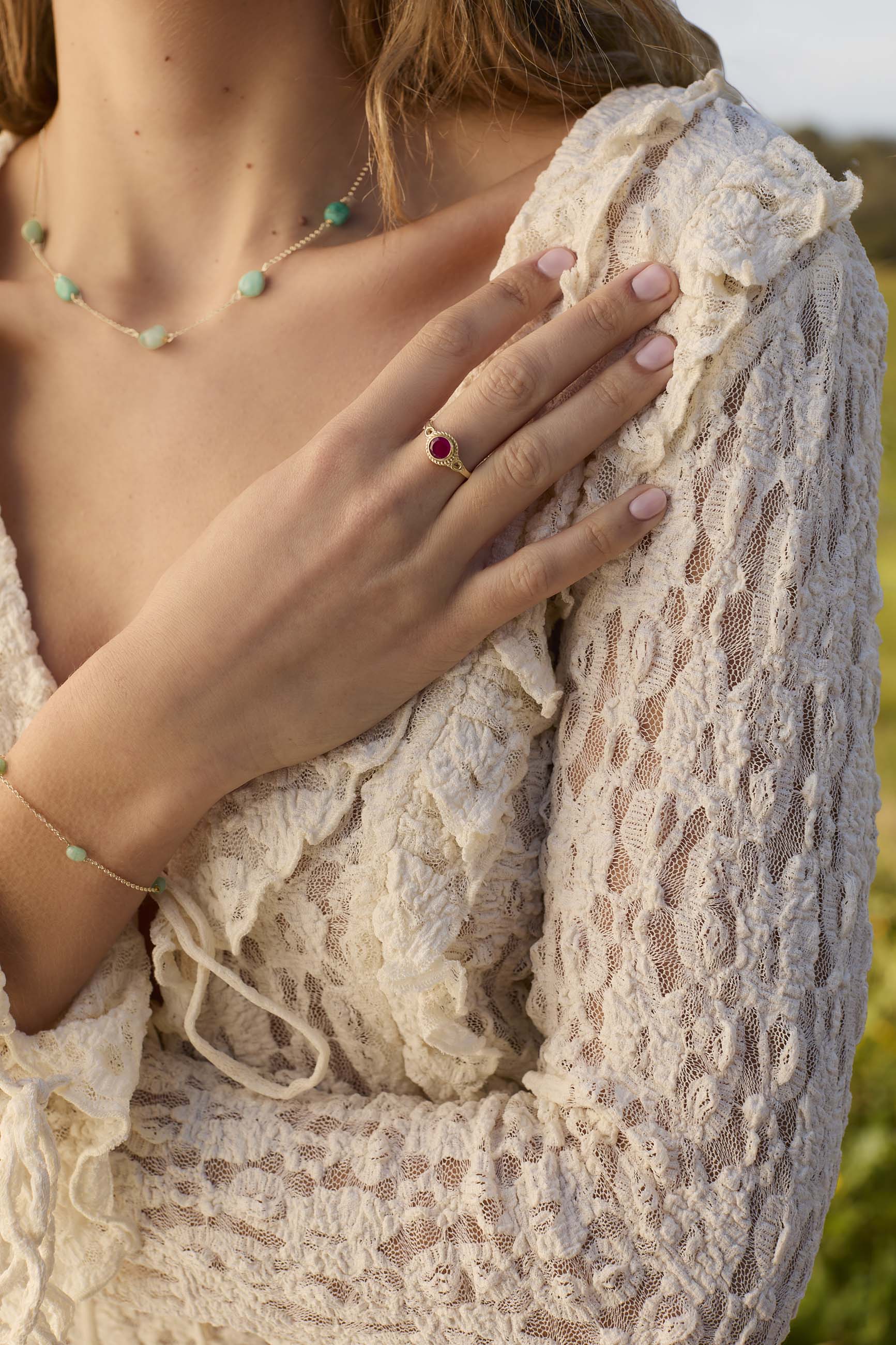 - Piedra: Rubí. Cada piedra es única, por eso puede ser ligeramente diferente a las fotos y cambiar de una joya a otra.