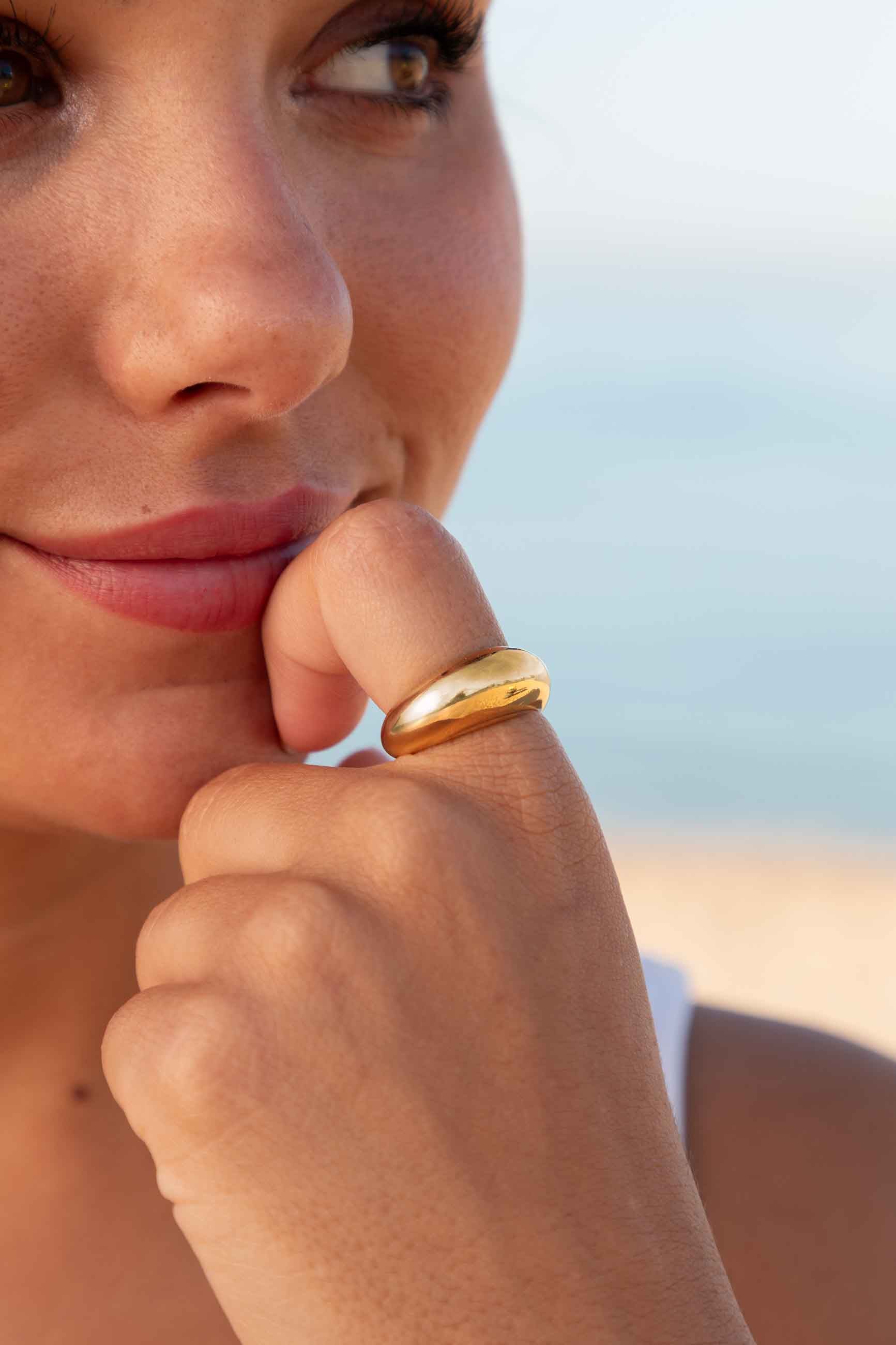 Este anillo chapado en oro es la definición de elegancia clásica. Su diseño ancho y pulido brillante lo convierten en una pieza minimalista que destaca por su simplicidad sofisticada y versatilidad.