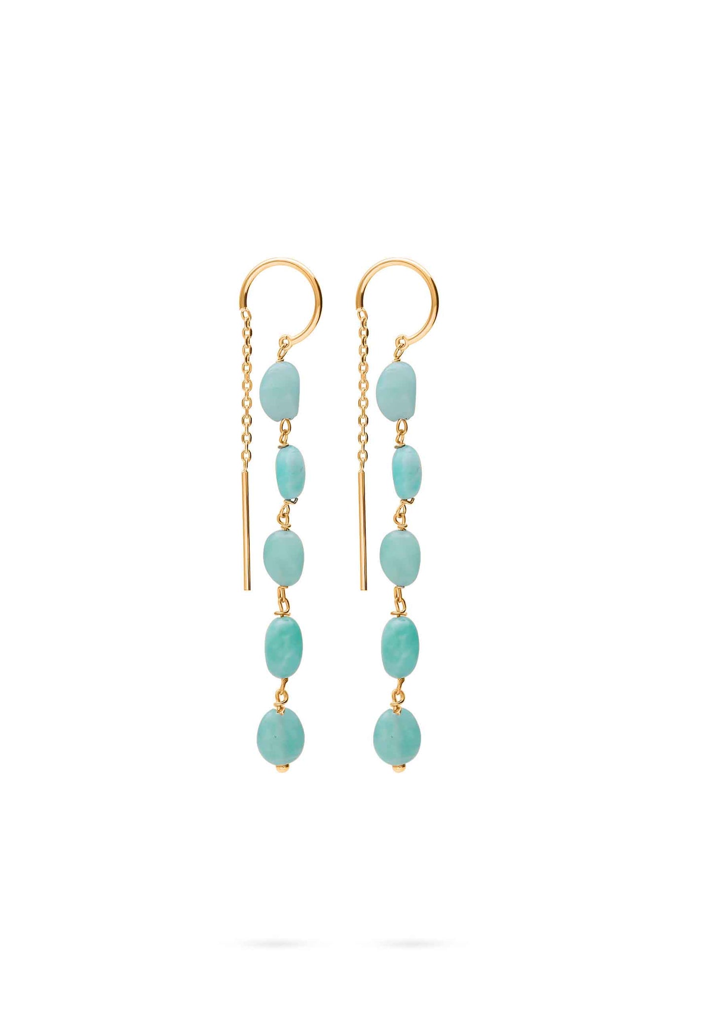 Estos pendientes, elaborados con plata de ley 925 y bañados en oro, fusionan la naturalidad con la simplicidad. Presenta una fina cadena que une seis cautivadoras amazonitas de un tono verde brillante.