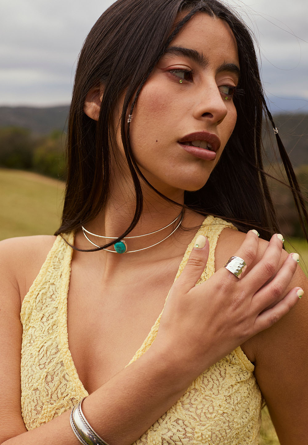 El BHUMEET es un choker rígido de doble tira hecho de Plata de Ley 925, que no solo le da un toque de elegancia a tu look, sino que también cuenta con una preciosa piedra turquesa en el centro que aporta un toque de color y personalidad a la joya.