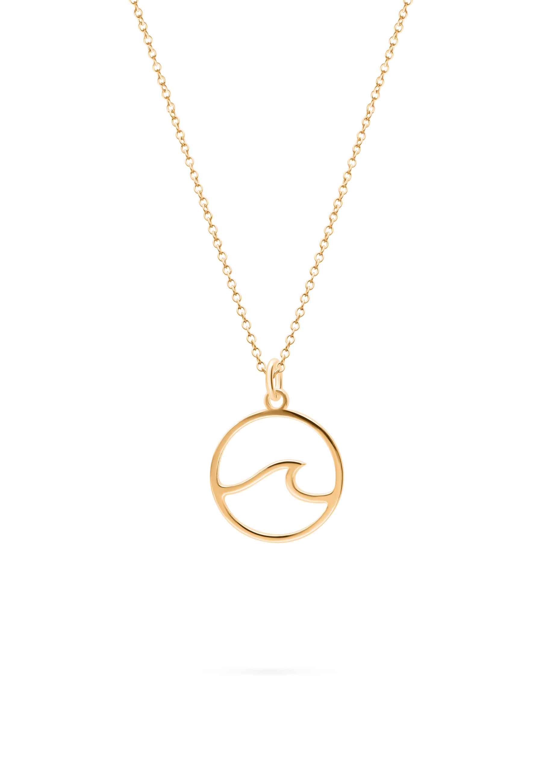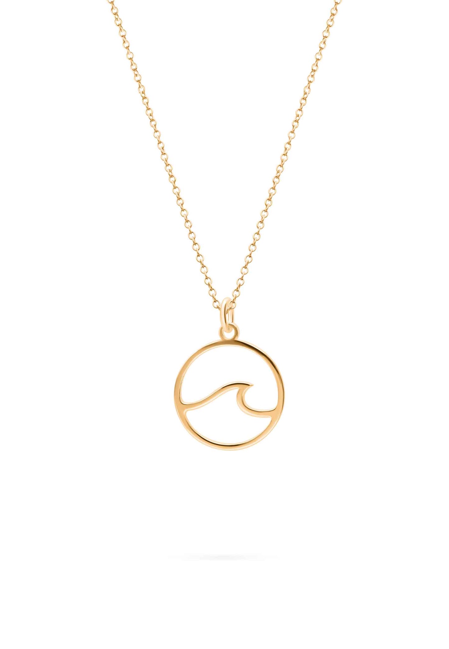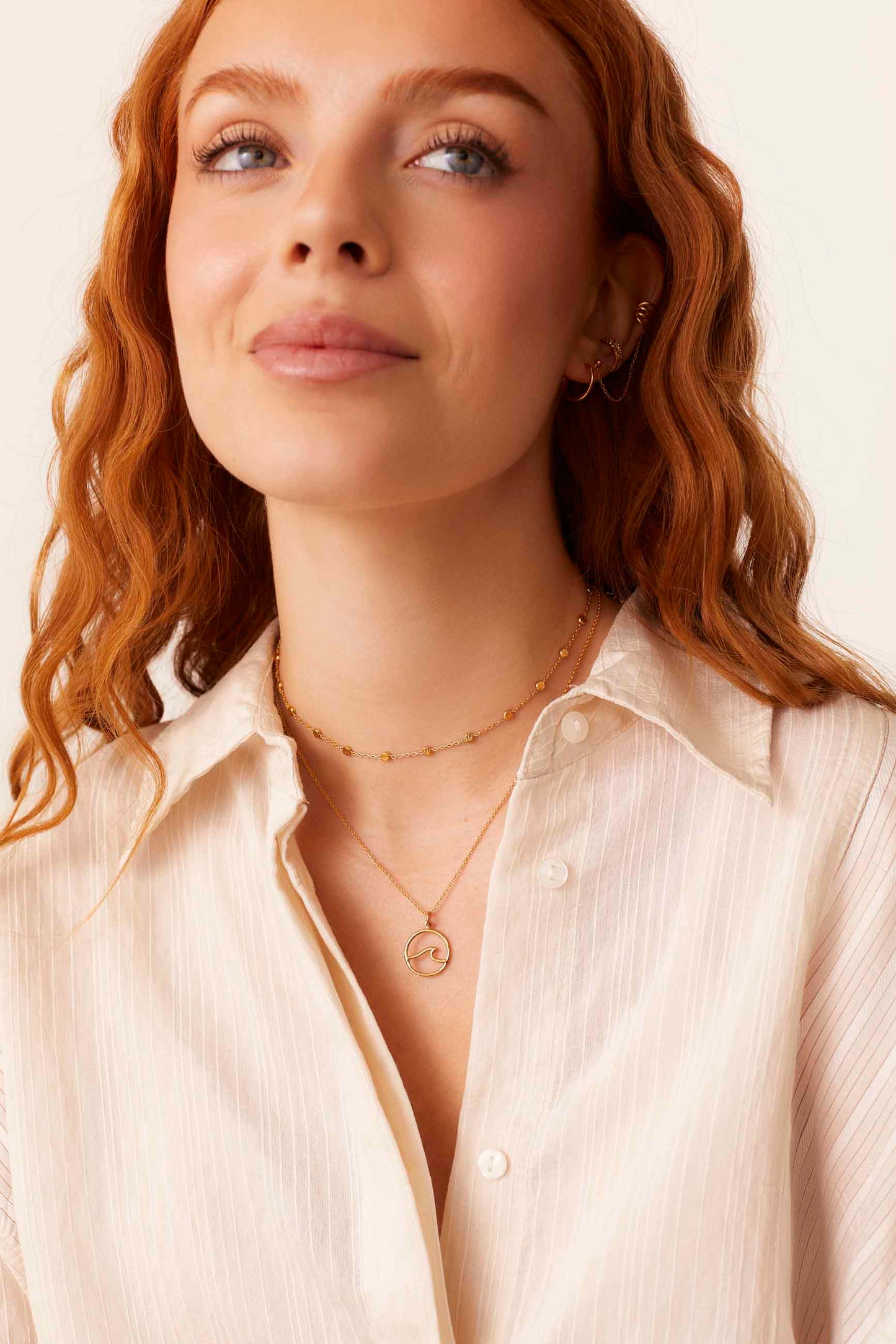 El collar AKHA BAÑADO EN ORO está formado por una fina cadena con un colgante redondo que tiene en su interior el dibujo de una bonita ola. Este collar está completamente hecho en Plata de Ley 925 bañada en oro de 22 quilates con 2 micras de espesor, una técnica que permite que esta joyita sea superduradera.