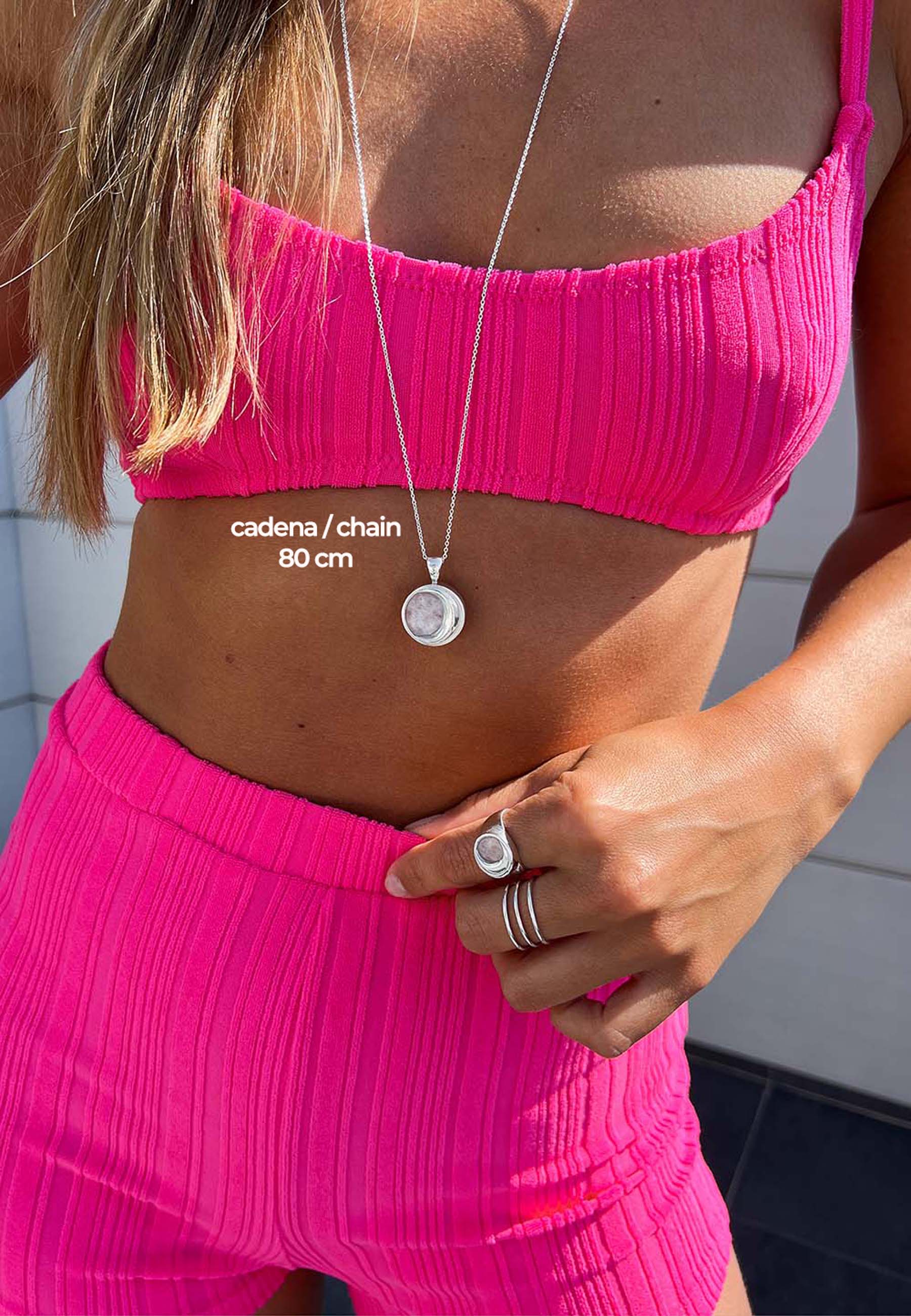 El collar VYOMA destaca por tener un colgante de luna llena con piedra luna y una luna creciente de plata encima. La cadena de este colgante es de rolo y mide 55 cm. ¡Es un colgante con un diseño único y mucha personalidad!