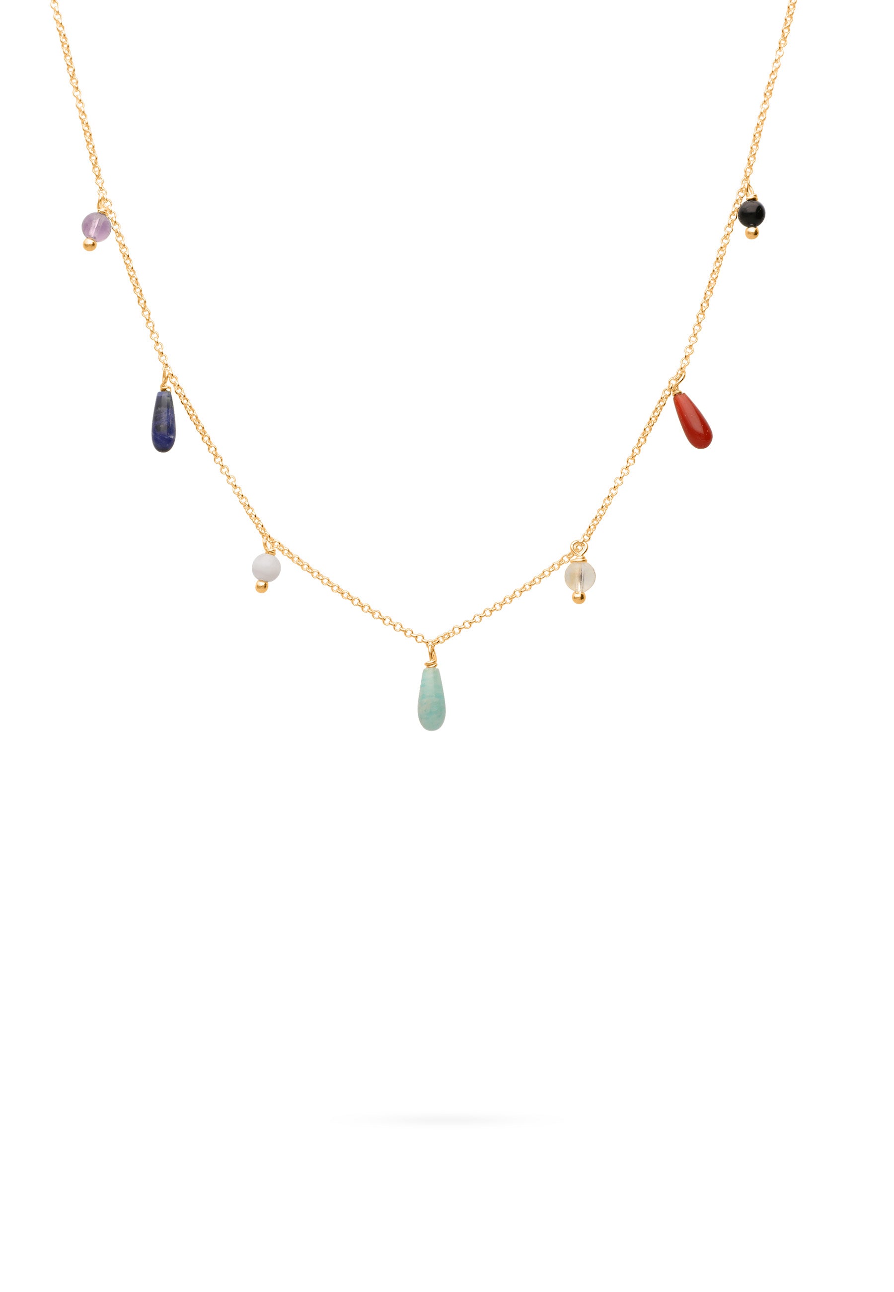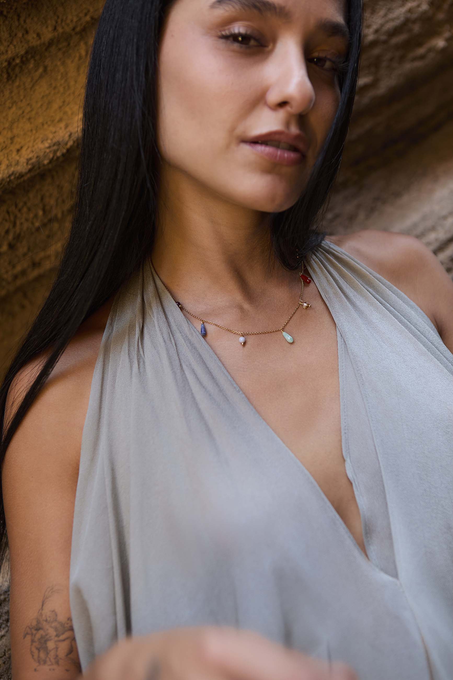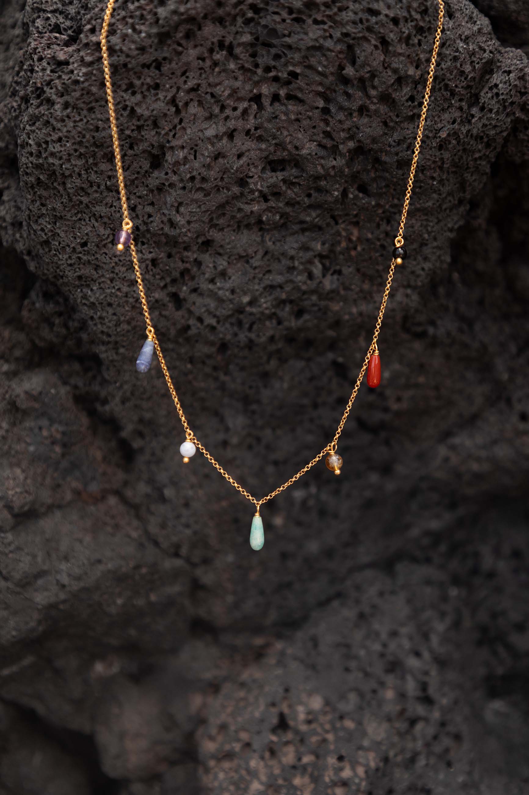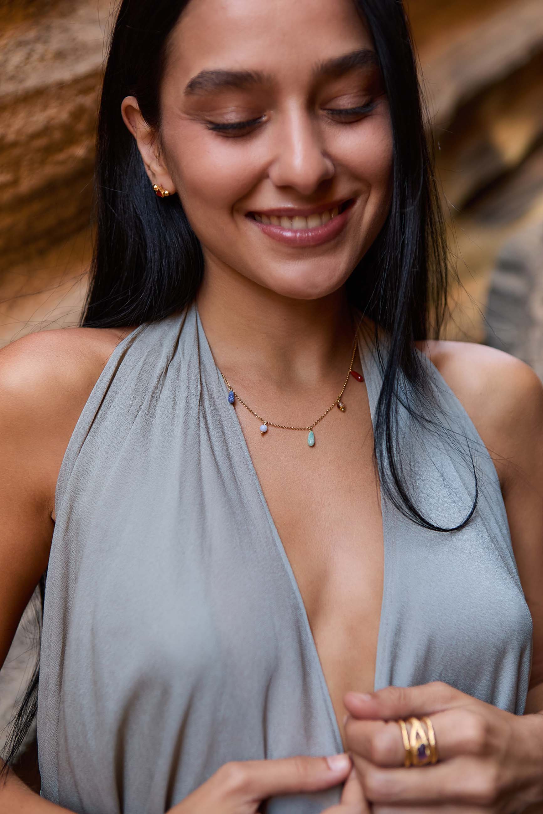 El Collar Sushumna está fabricado en plata de ley 925 bañada en oro de 22k y decorado con siete piedras naturales en forma de gota: amatista, sodalita, calcedonia, amazonita, citrino, cornalina y obsidiana. Su diseño delicado tipo choker, con cadena de 38 cm y extensor de 7 cm, lo convierte en un accesorio versátil y sofisticado, ideal para combinar con otras cadenas o llevar como pieza central.