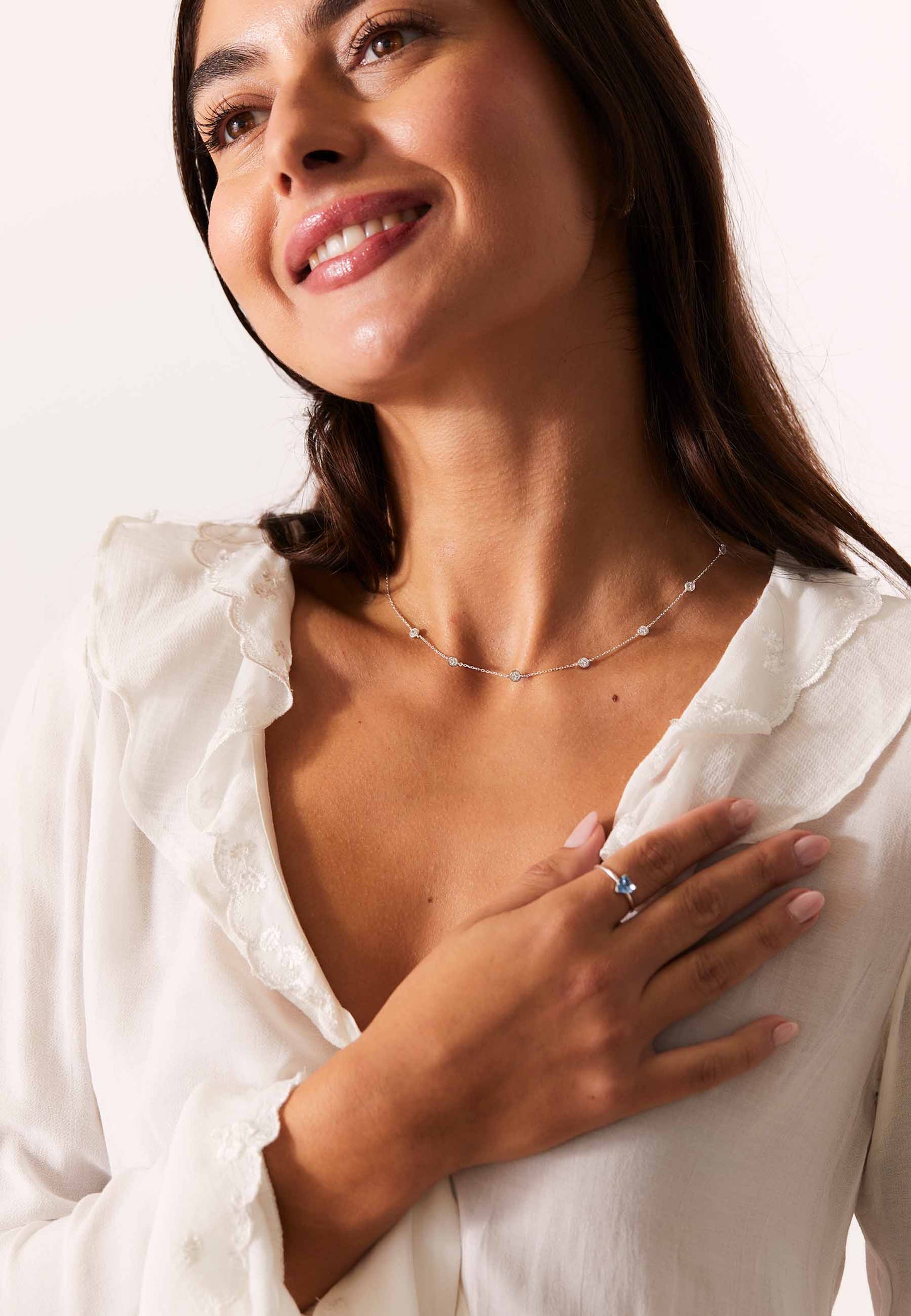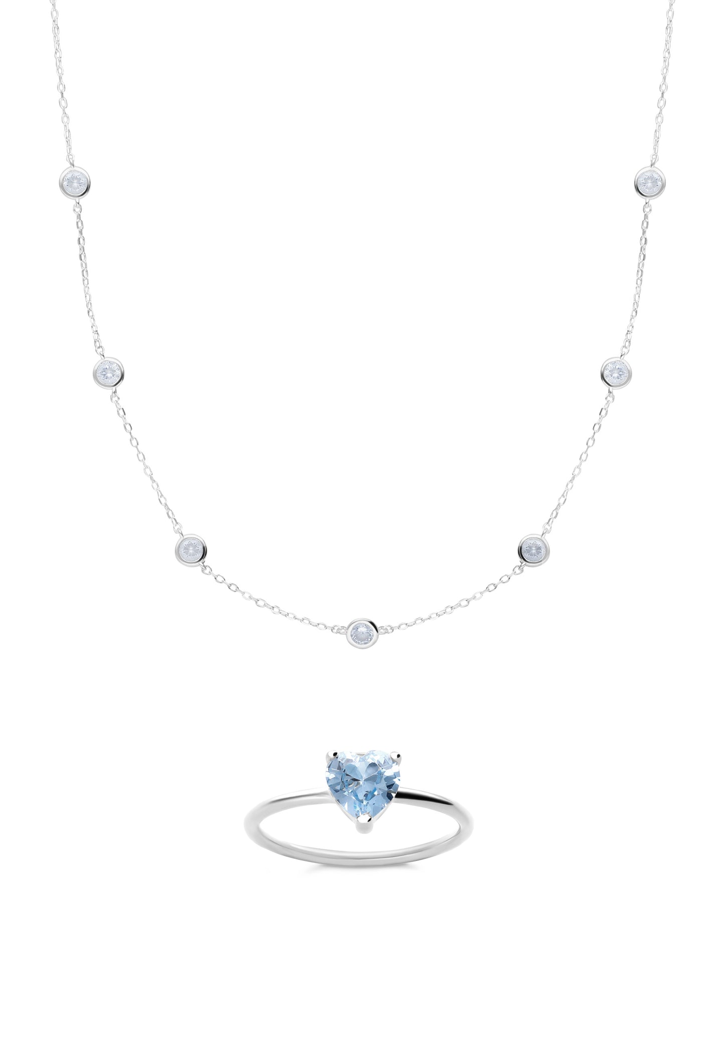 El pack Ayurveda incluye un delicado collar de plata de ley 925 con circonitas redondas distribuidas a lo largo de la cadena, diseñado para ajustarse elegantemente al cuello sin llegar a ser un choker, y el sofisticado anillo Abhijit con una circonita azul en forma de corazón. Este conjunto combina brillo y estilo, perfecto para destacar en cualquier ocasión.