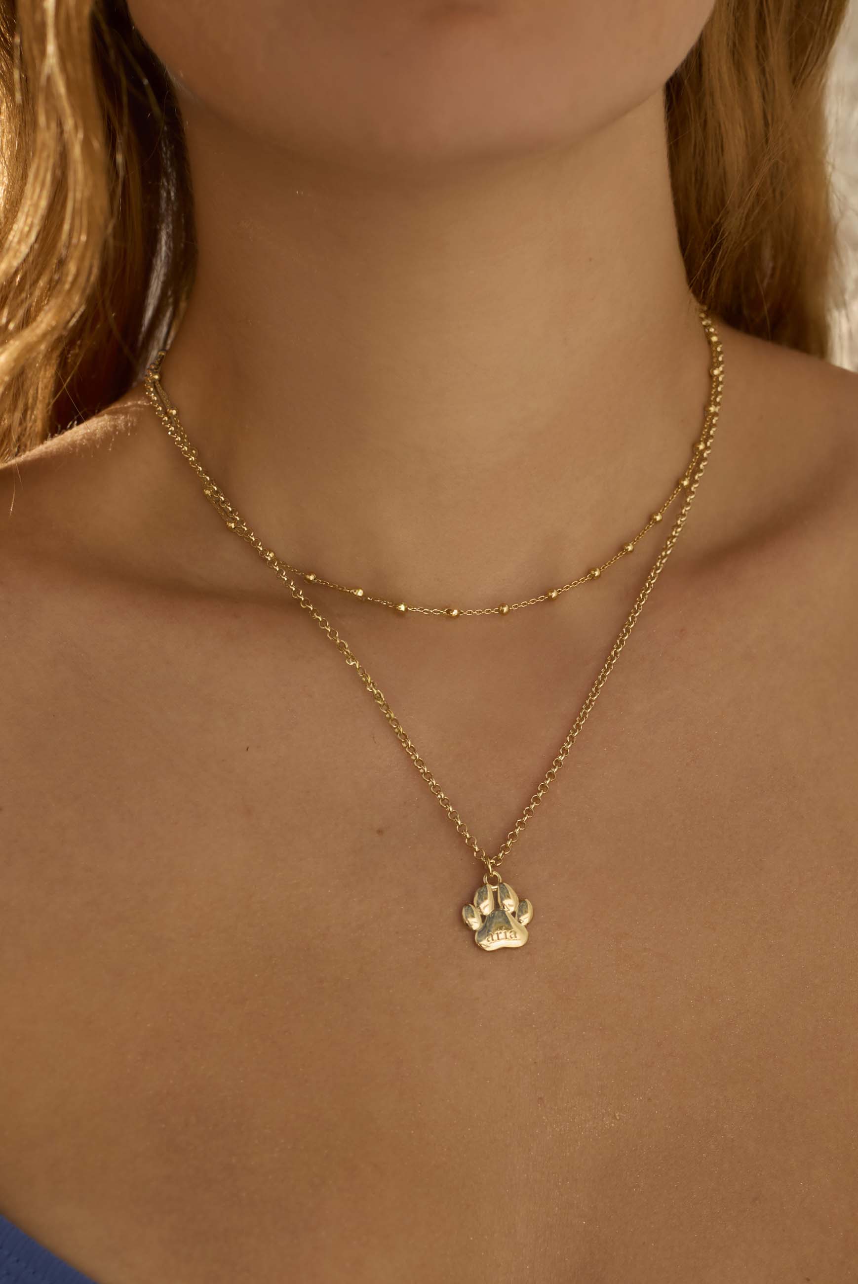 Personaliza tu joyería con nuestro collar de huella de animal de plata de ley 925 y bañado en oro, grabado con el nombre de tu mascota. Este colgante en forma de huella es una manera significativa de mantener a tu querido compañero siempre cerca.