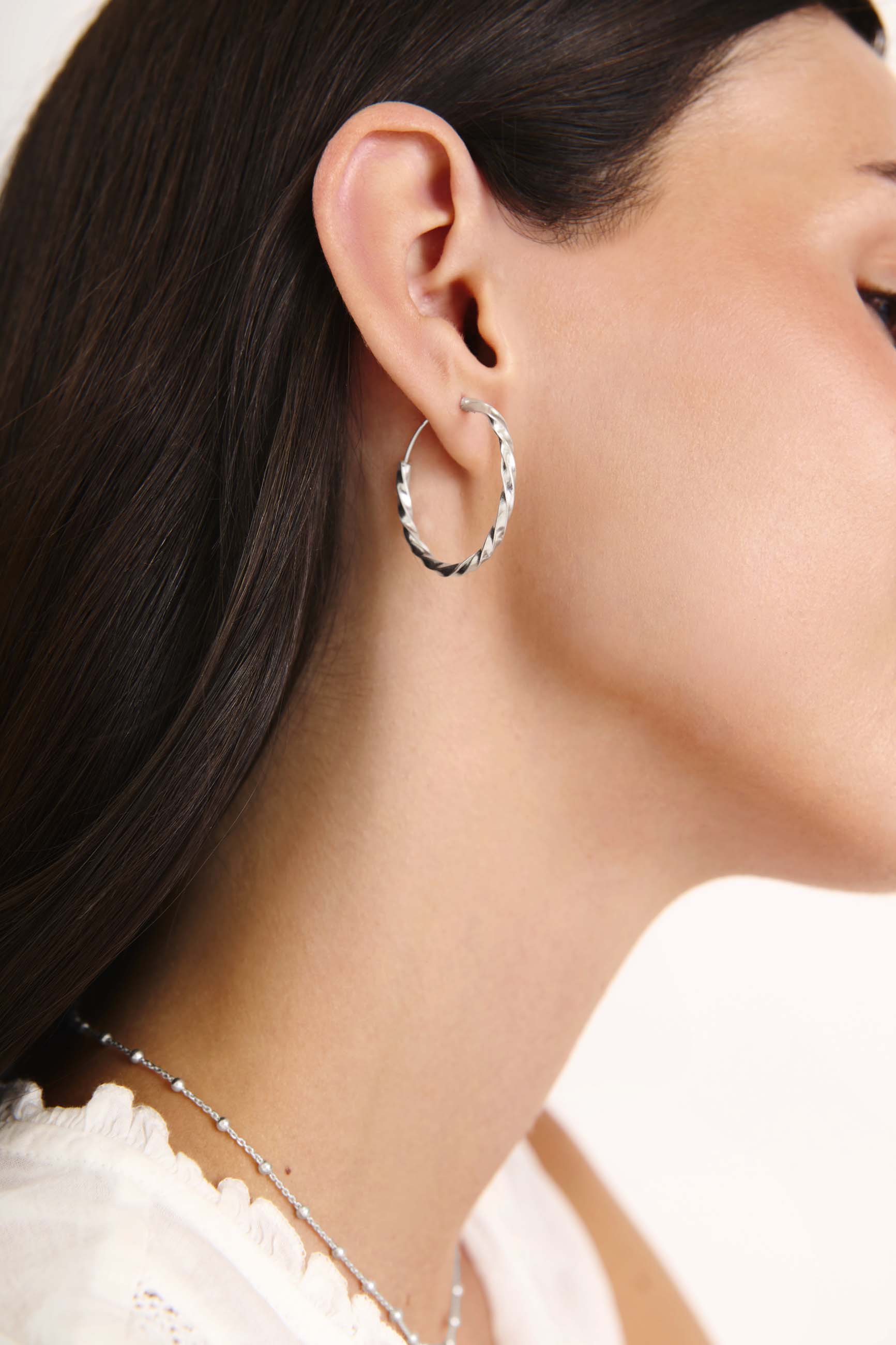 Los pendientes ANOOP (30mm) son unos aros de Plata de Ley 925 con tamaño mediano-grande. Tienen un relieve muy sugerente alrededor de toda la superficie del arito.