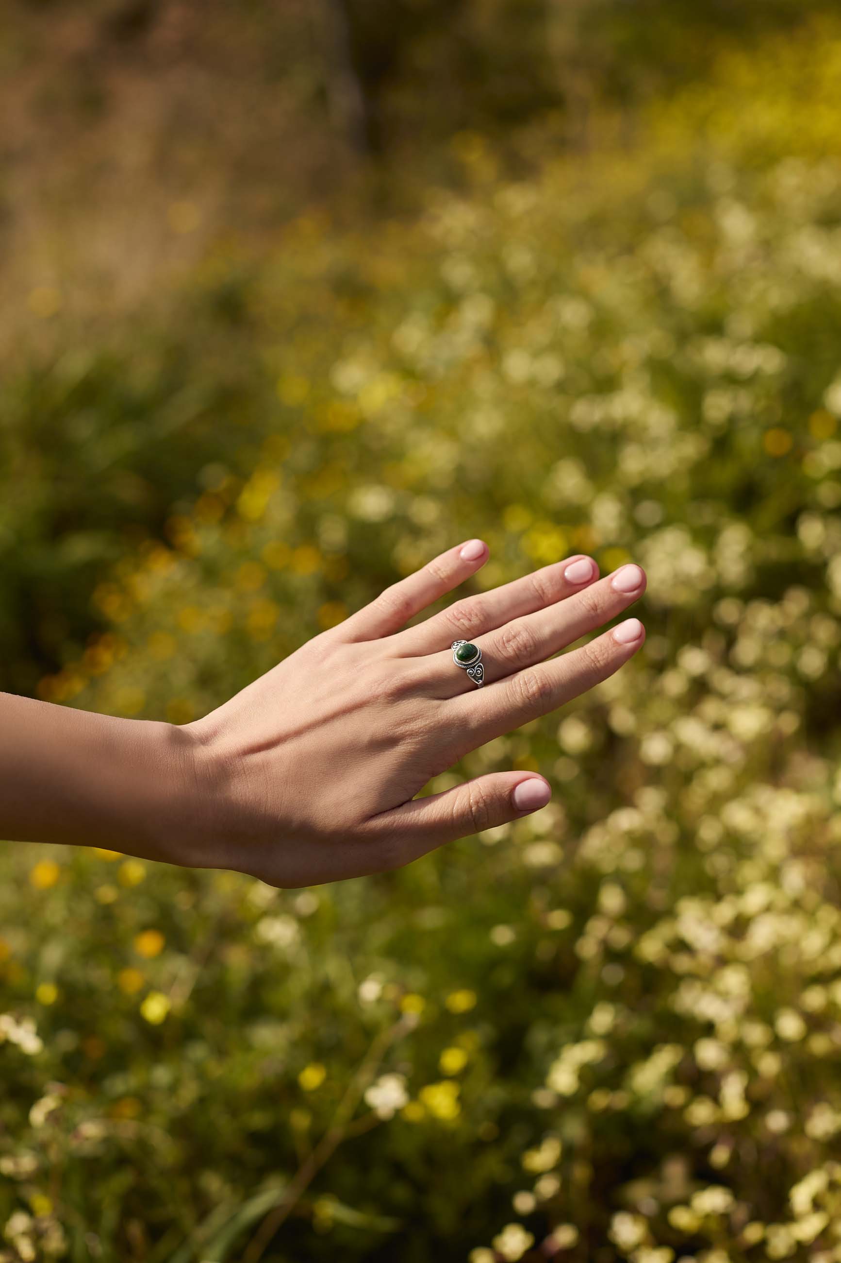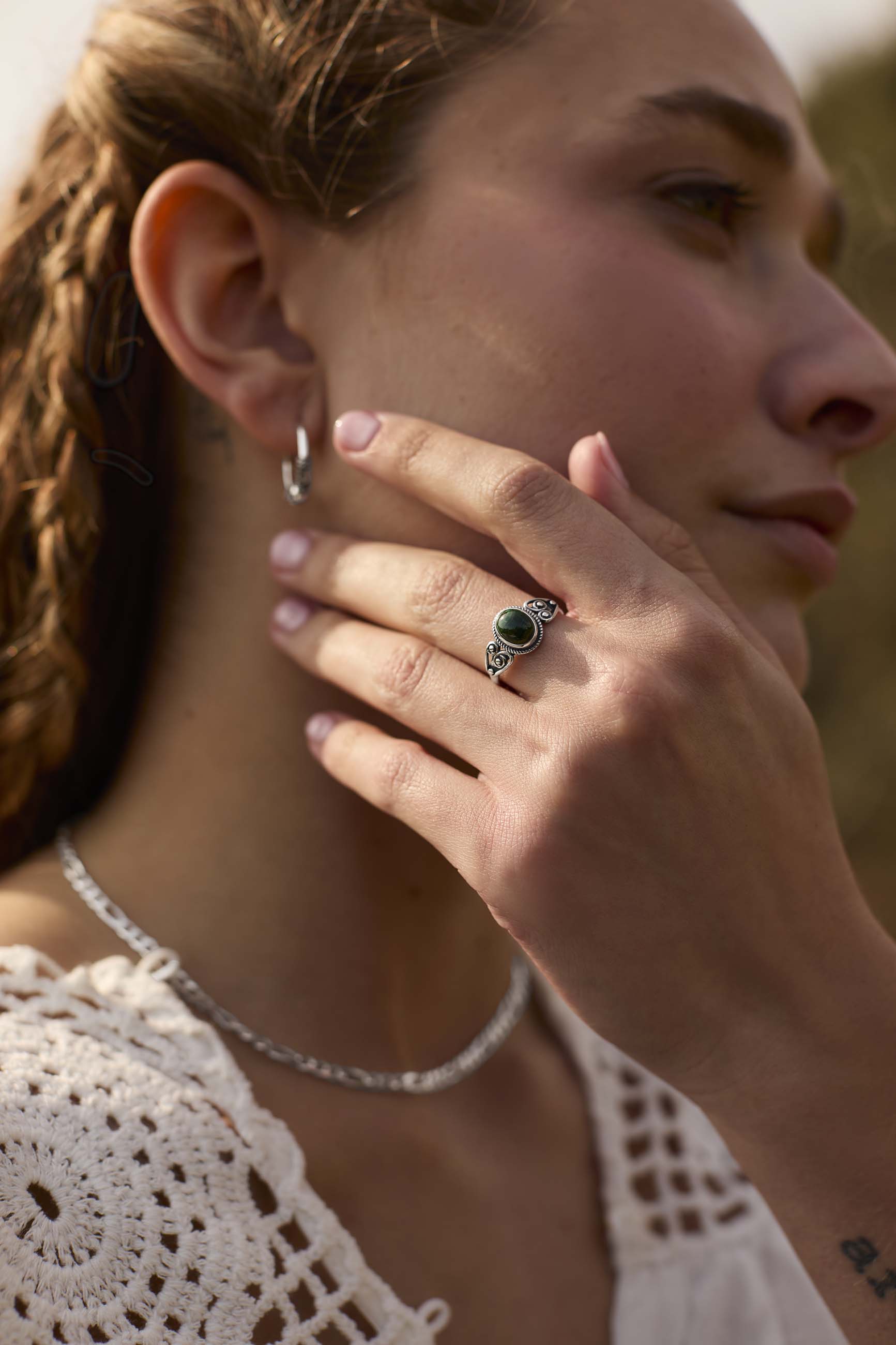 El anillo SARAYU es un anillo de Piedra Malaquita, caracterizada por su color verde intenso superllamativo. Está hecho a mano y en Plata de Ley 925.
