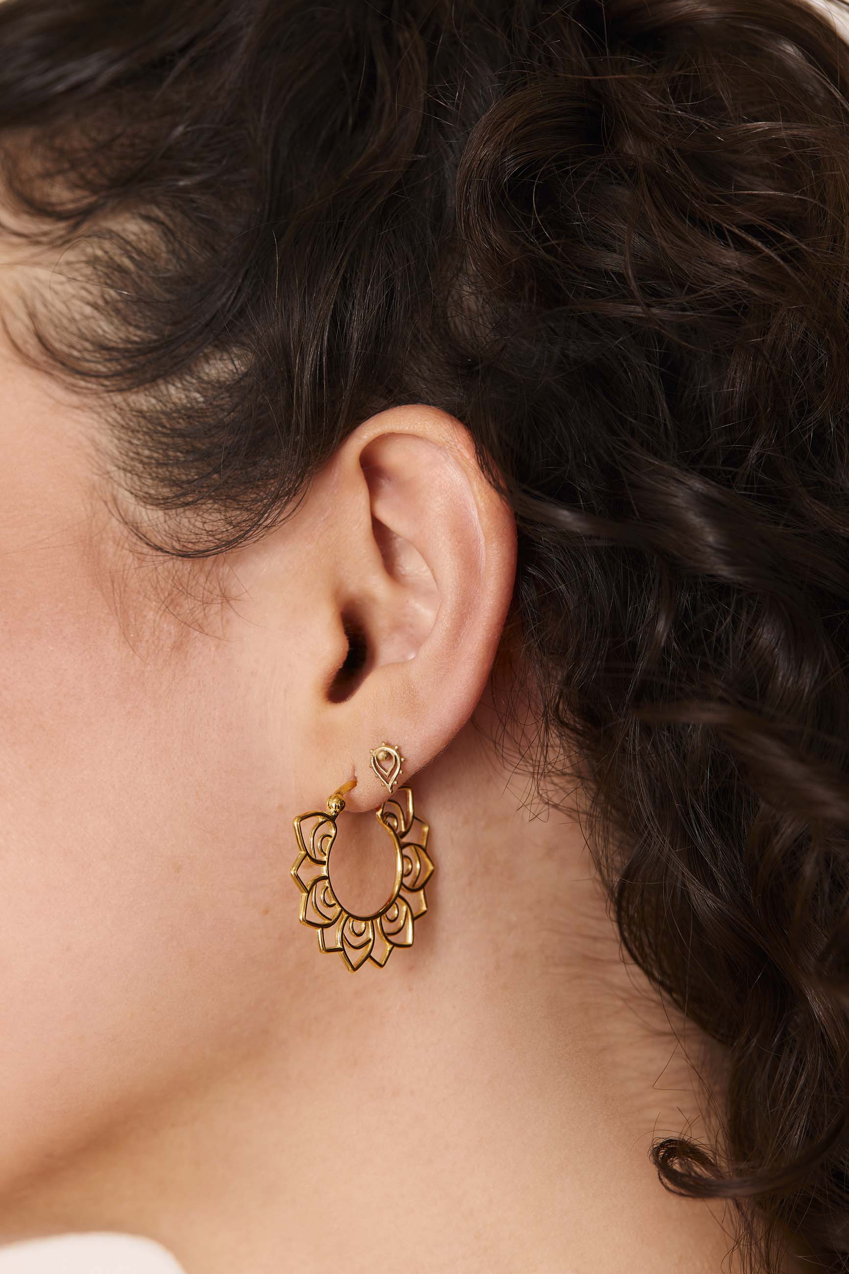 Los pendientes MAYUR bañados en ORO tienen un diseño superbonito y original con la silueta del mandala. Están hechos a mano, cuidados y elaborados al detalle en Plata de Ley 925 y bañados en oro de 22 quilates.