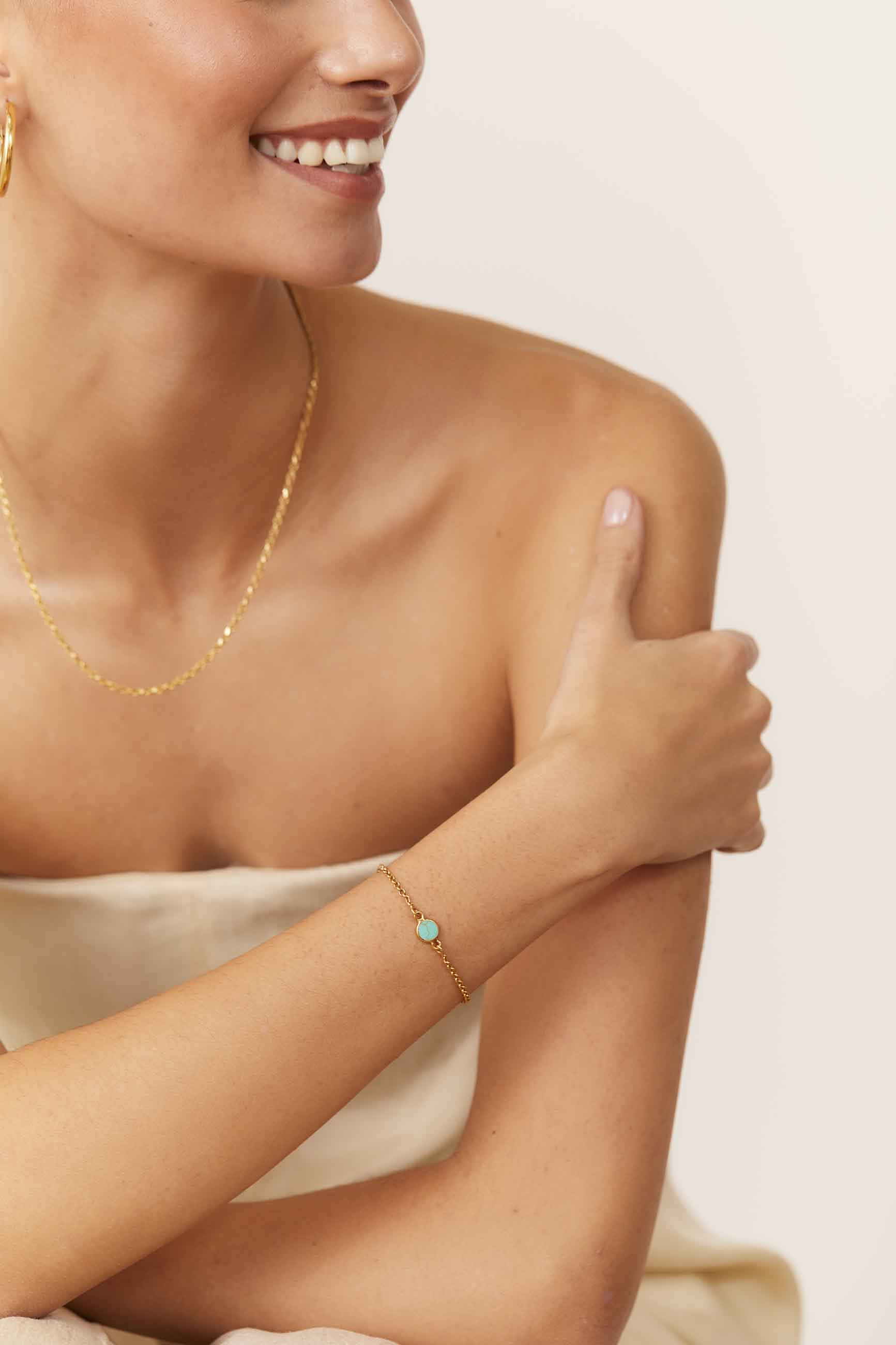 La pulsera INDUMA ORO es una pulsera superfina y elegante. Destaca por su Piedra Kingman Turquesa, que luce como protagonista en el centro de la pieza.