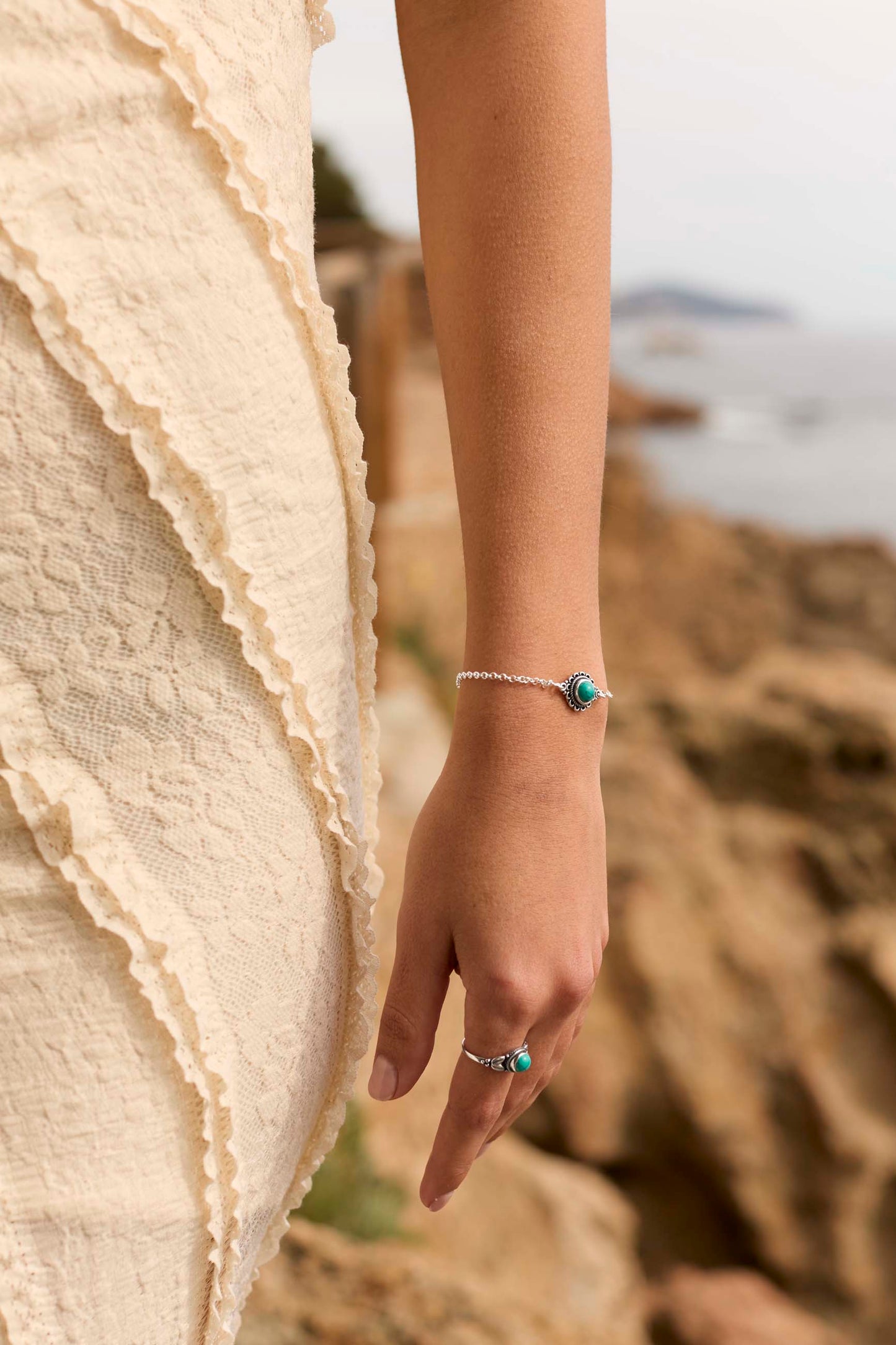 La pulsera NILA es una pulserita fina de plata muy sencillita con la piedra turquesa como elemento principal. Alrededor de la piedra encontramos un recubrimiento de plata con tres diseños diferenciados.