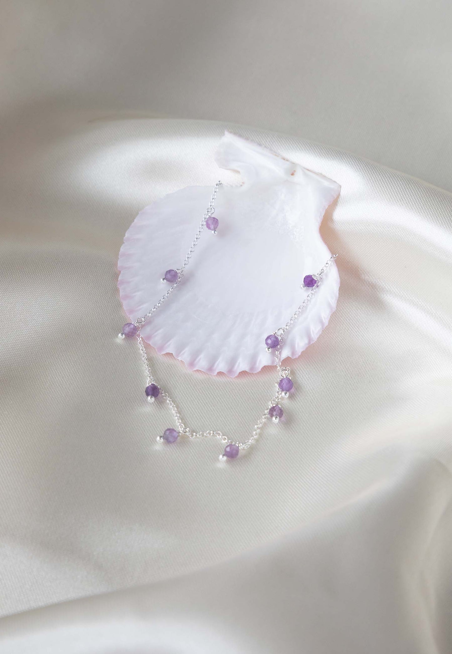 Sumérgete en la elegancia sutil y el encanto veraniego con nuestra exquisita tobillera Vanisha de plata de ley 925. Esta delicada pieza de joyería está diseñada para resaltar tu estilo con un toque de frescura y sofisticación. La cadena fina de plata se entrelaza con una serie de diminutas piedras de amatista en tonos lila, que añaden un toque de color y brillo suave a tu look.