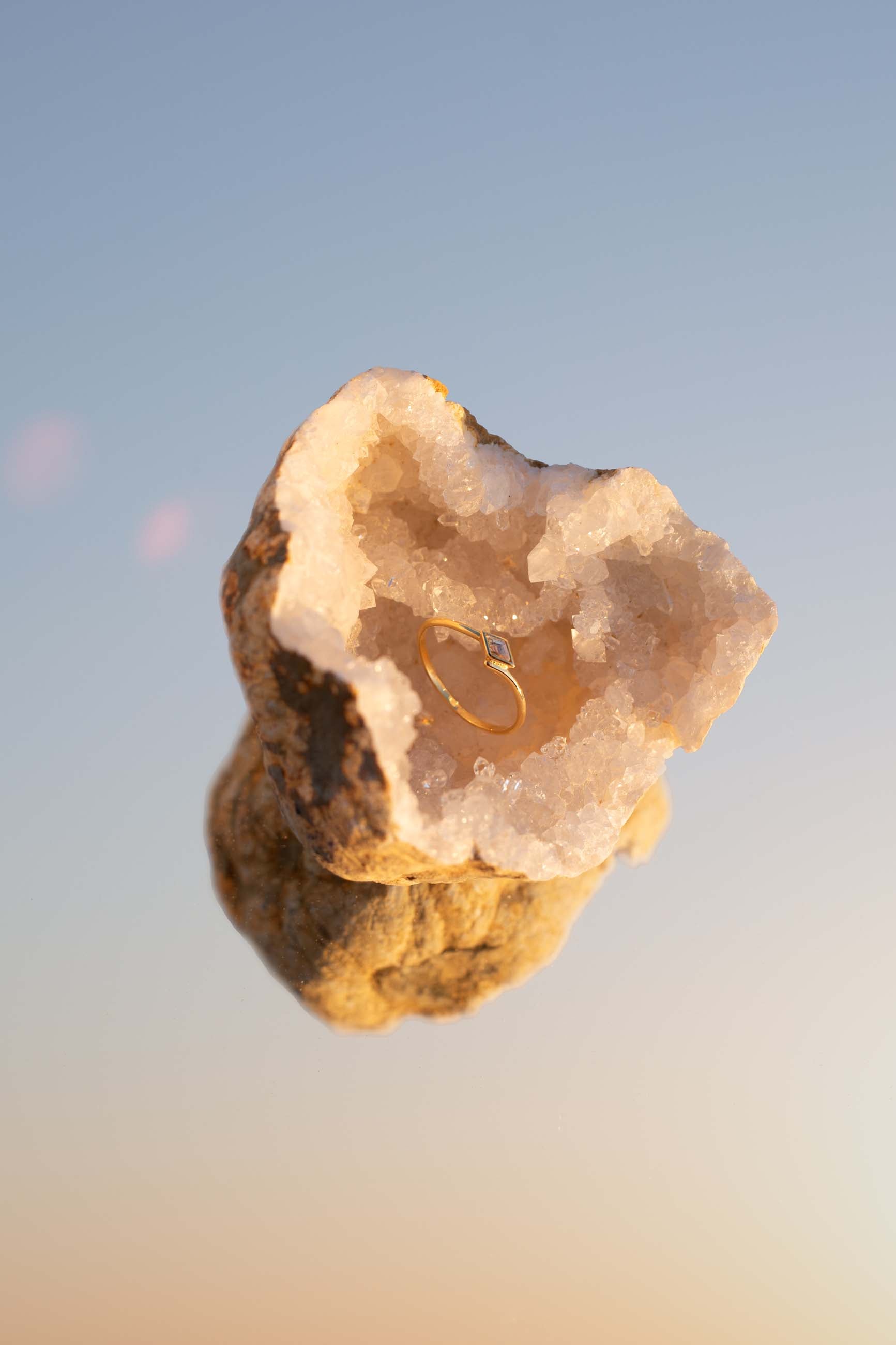 Der VEGA Ring aus 18 Karat Gold entsteht als Symbol der Verbindung, inspiriert vom Licht der Sterne und von allem, was uns zum Wesentlichen führt. Sein Mondstein in Rautenform und hoher Qualität reflektiert einen sanften bläulichen Schimmer, der ihn einzigartig macht.