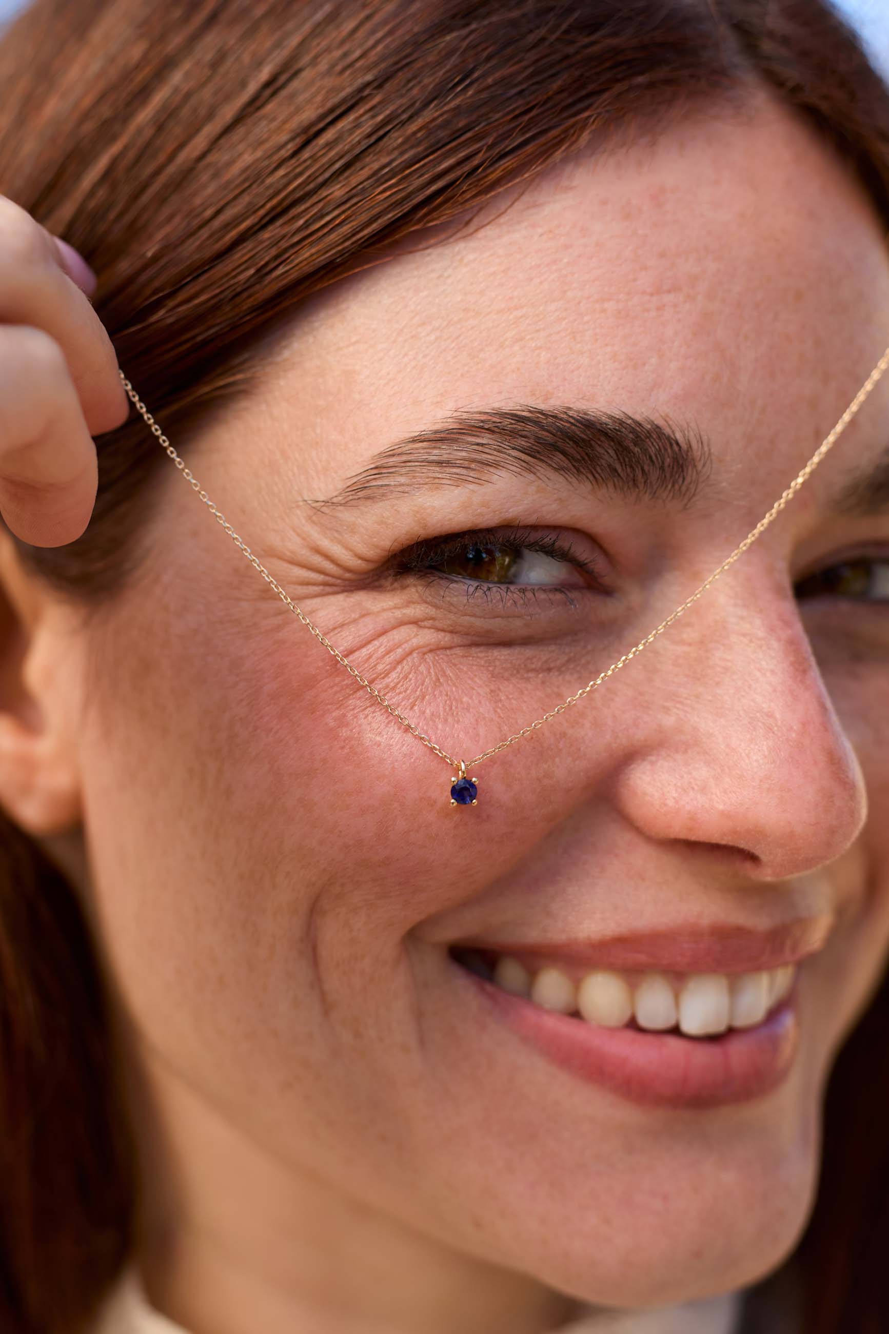 Diese wunderschöne Halskette aus 9 Karat Gelbgold strahlt in ihrer Schlichtheit Eleganz und Raffinesse aus. Die Reinheit des Gelbgoldes erstrahlt in einem warmen und einladenden Glanz und bildet eine perfekte Leinwand für das Detail, das es einzigartig macht: einen kleinen, bezaubernden Saphir.