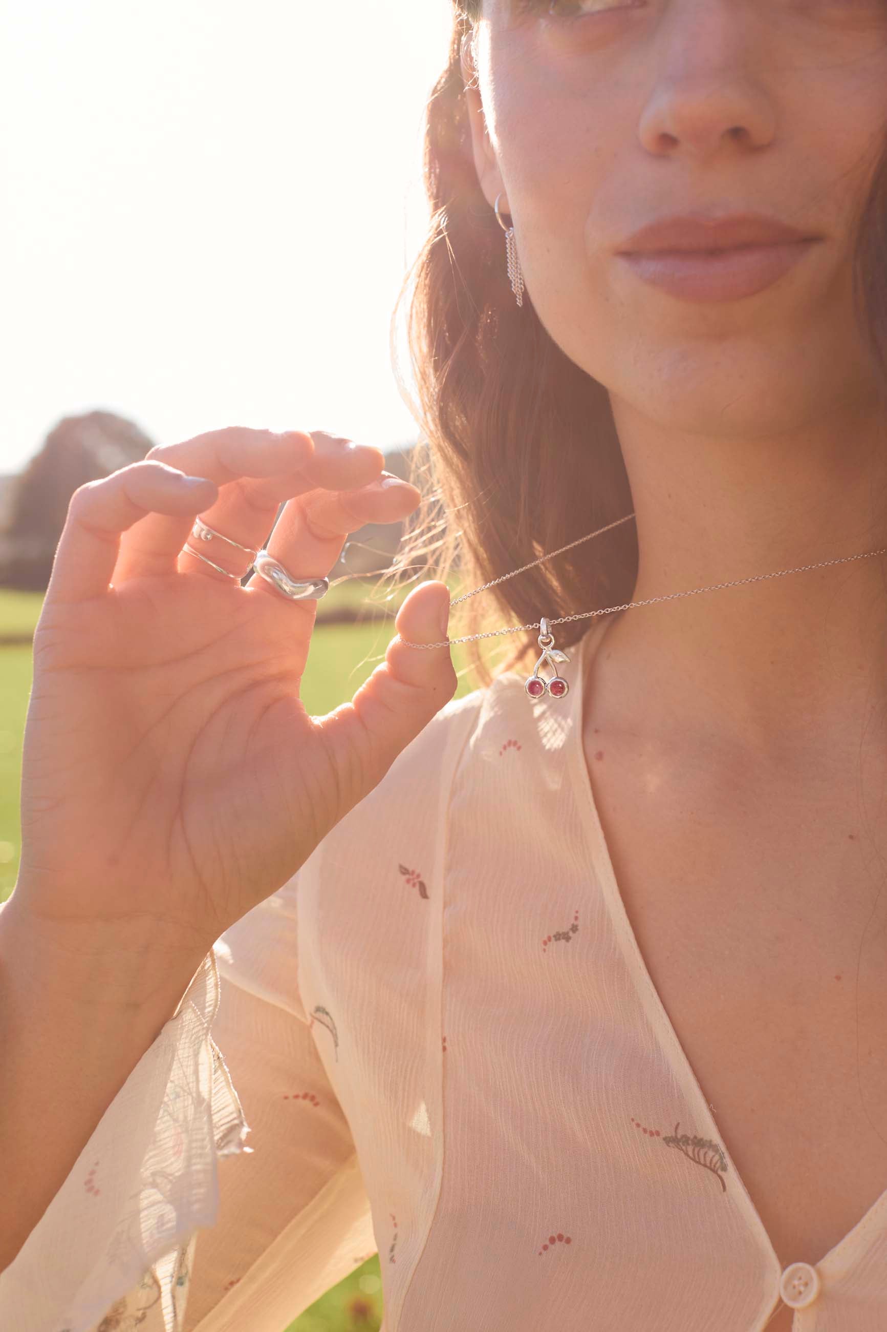 Der Charm Cheri ist ein verspieltes Schmuckstück, das jeder Kombination einen Hauch von Farbe und Frische verleiht. Seine zwei kleinen Kirschen mit rosafarbenem Stein schaffen einen zarten und leuchtenden Kontrast, der sofort ins Auge fällt.