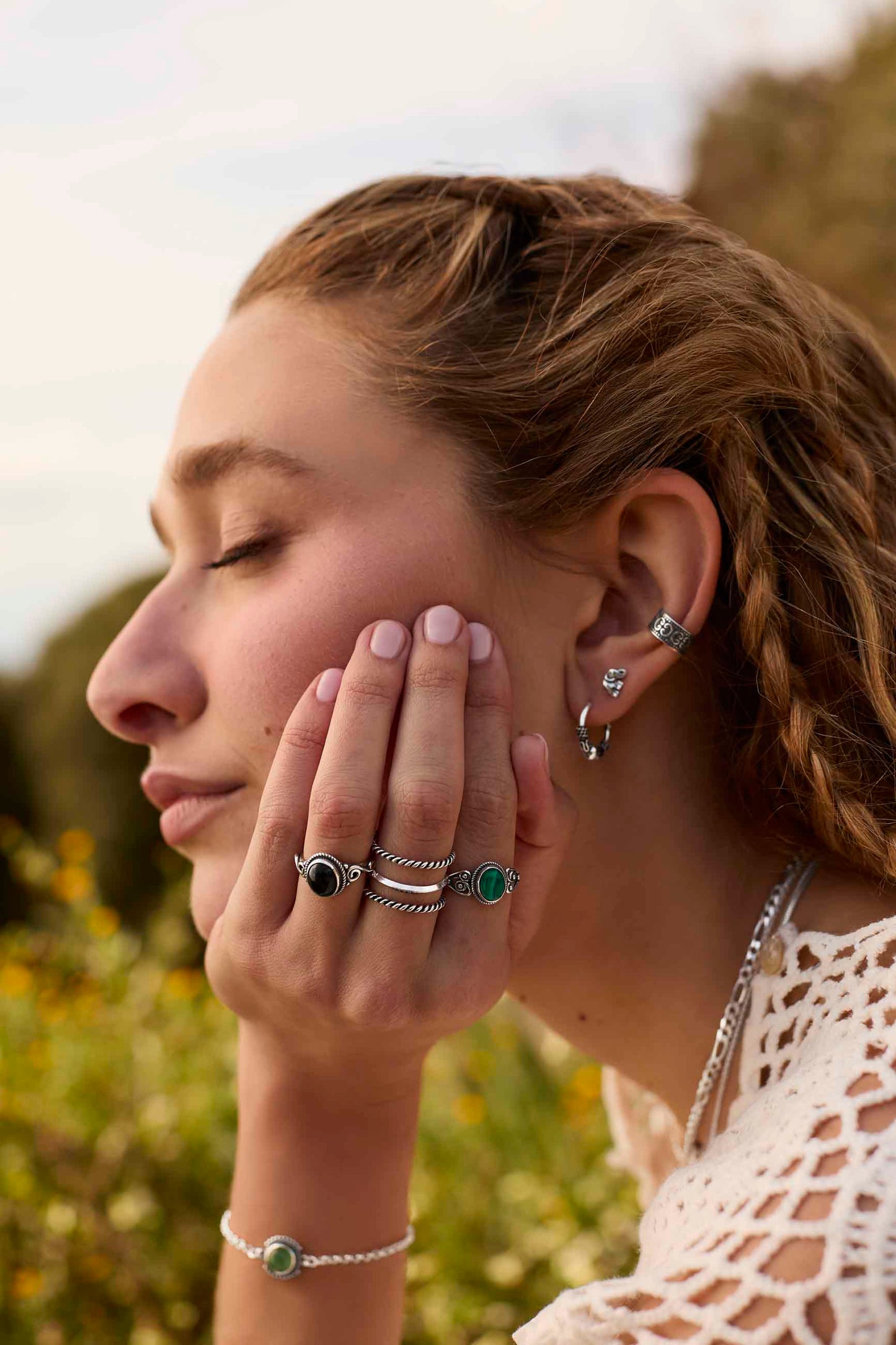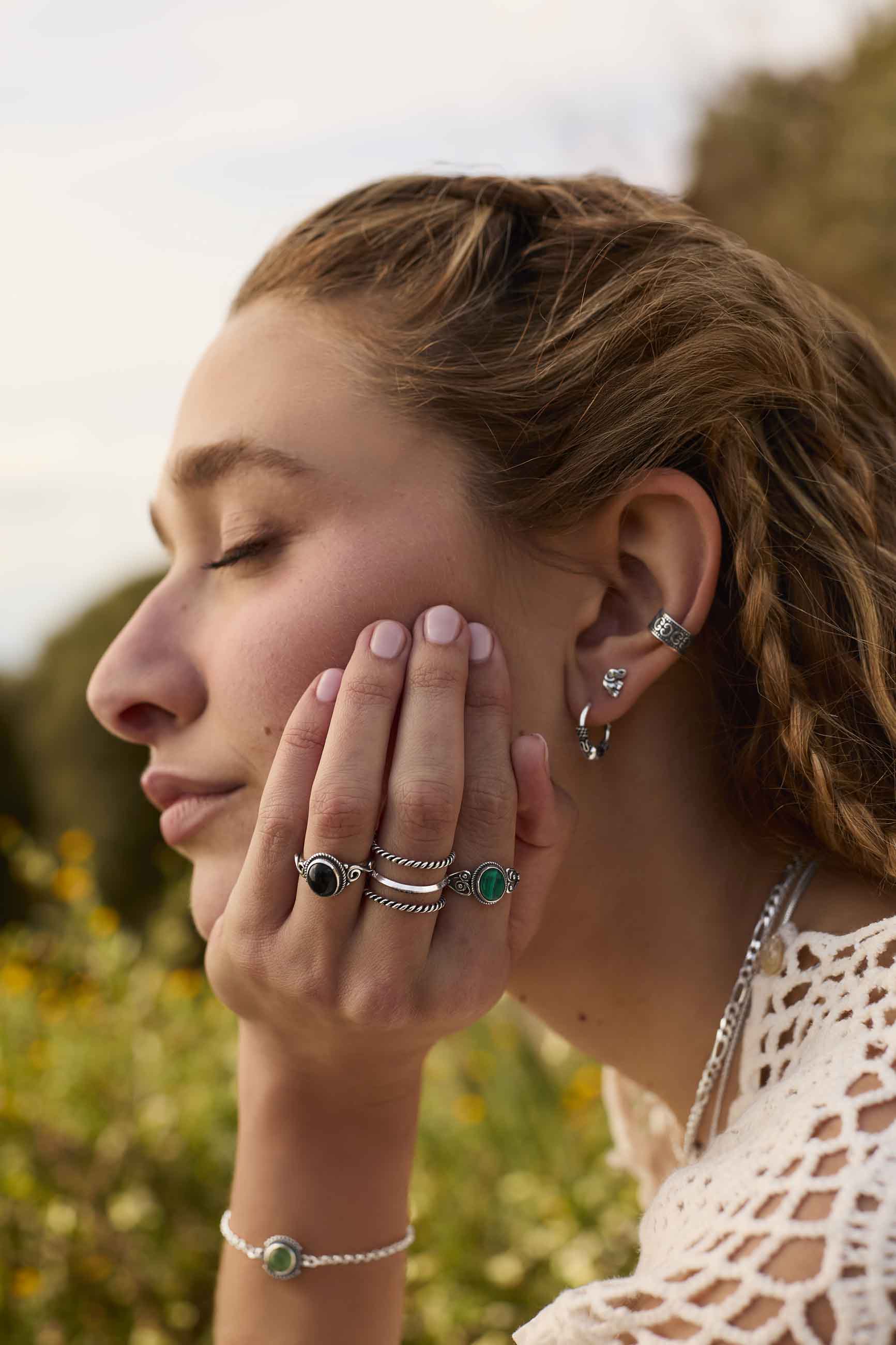 Der ANDHERA ist ein sehr schönes und originelles Stück. Der Onyx Stein hat eine ovale Form, mit einer verschlungenen Silberbasis und zwei feinen geflochtenen Linien um ihn herum.
