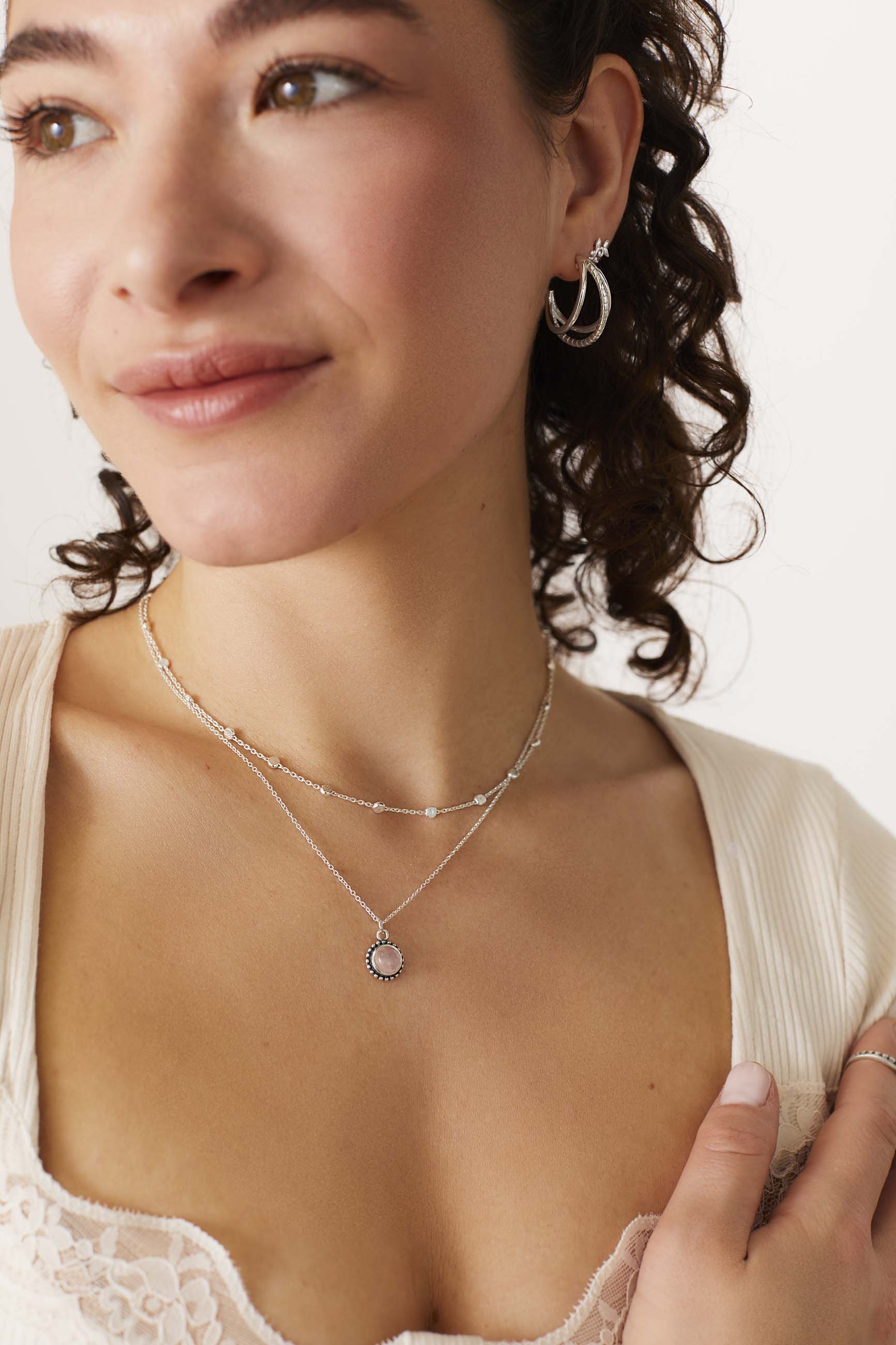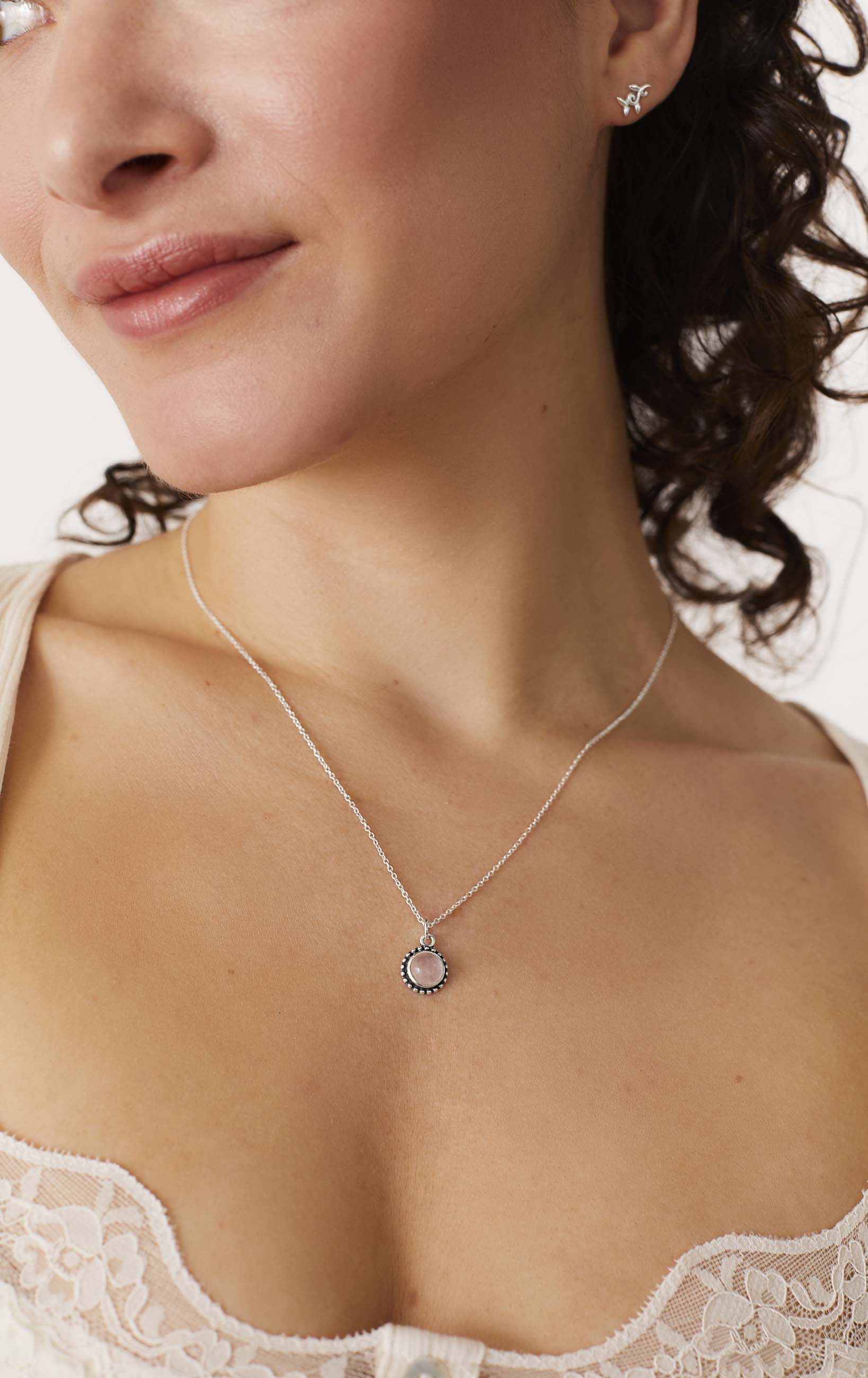 Die SAVATI ist eine schöne und auffällige Kette mit Rosenquarz. Der natürliche Edelstein ist das Hauptelement des Schmuckstücks, er ist rund und hat auf den Seiten kleine Silberkugeln aus 925er Sterling Silber.