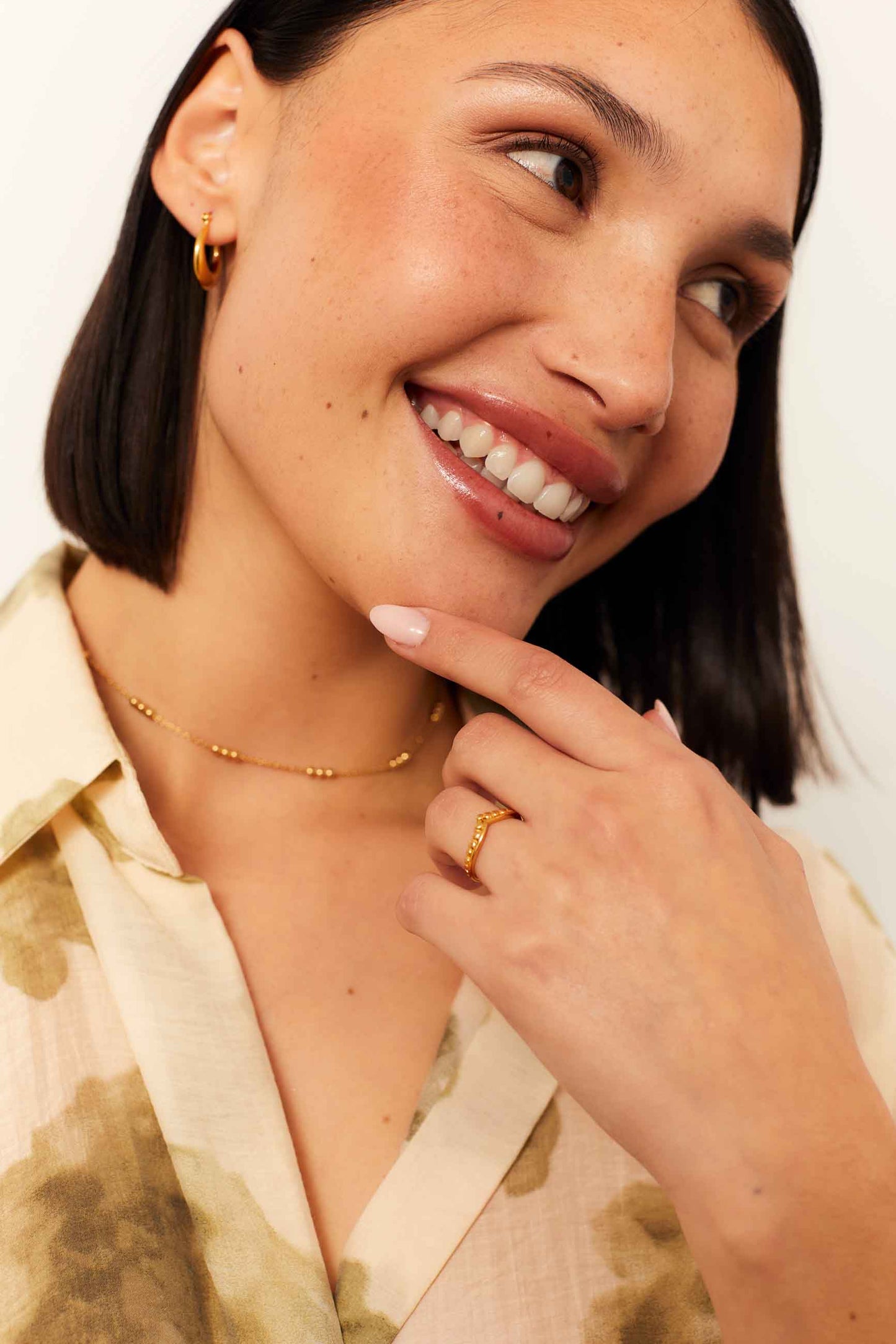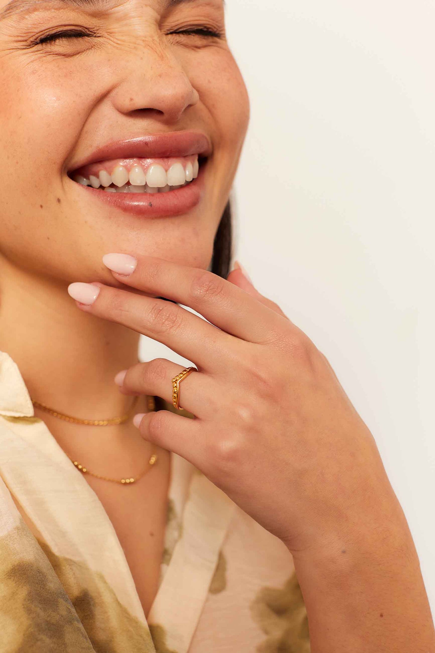 Der Ring SEVTI GOLD zeichnet sich durch sein ausgeprägtes Spitzendesign aus. Dieses kleine Schmuckstück besteht aus kleinen aufeinander folgenden Kugeln, die auf einer glatten Basis liegen.