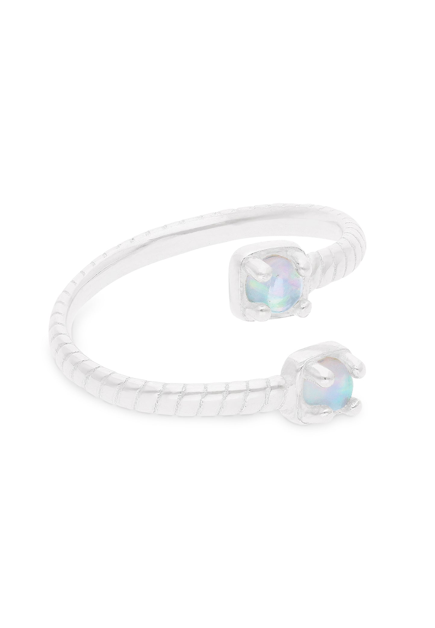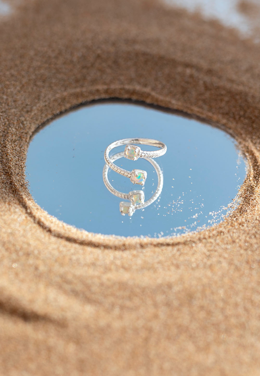 Der Ring Esvarupa aus 925er Sterling Silber zeichnet sich durch eine markante Öffnung aus, die an beiden Enden zwei beeindruckende quadratische Opalsteine hält.