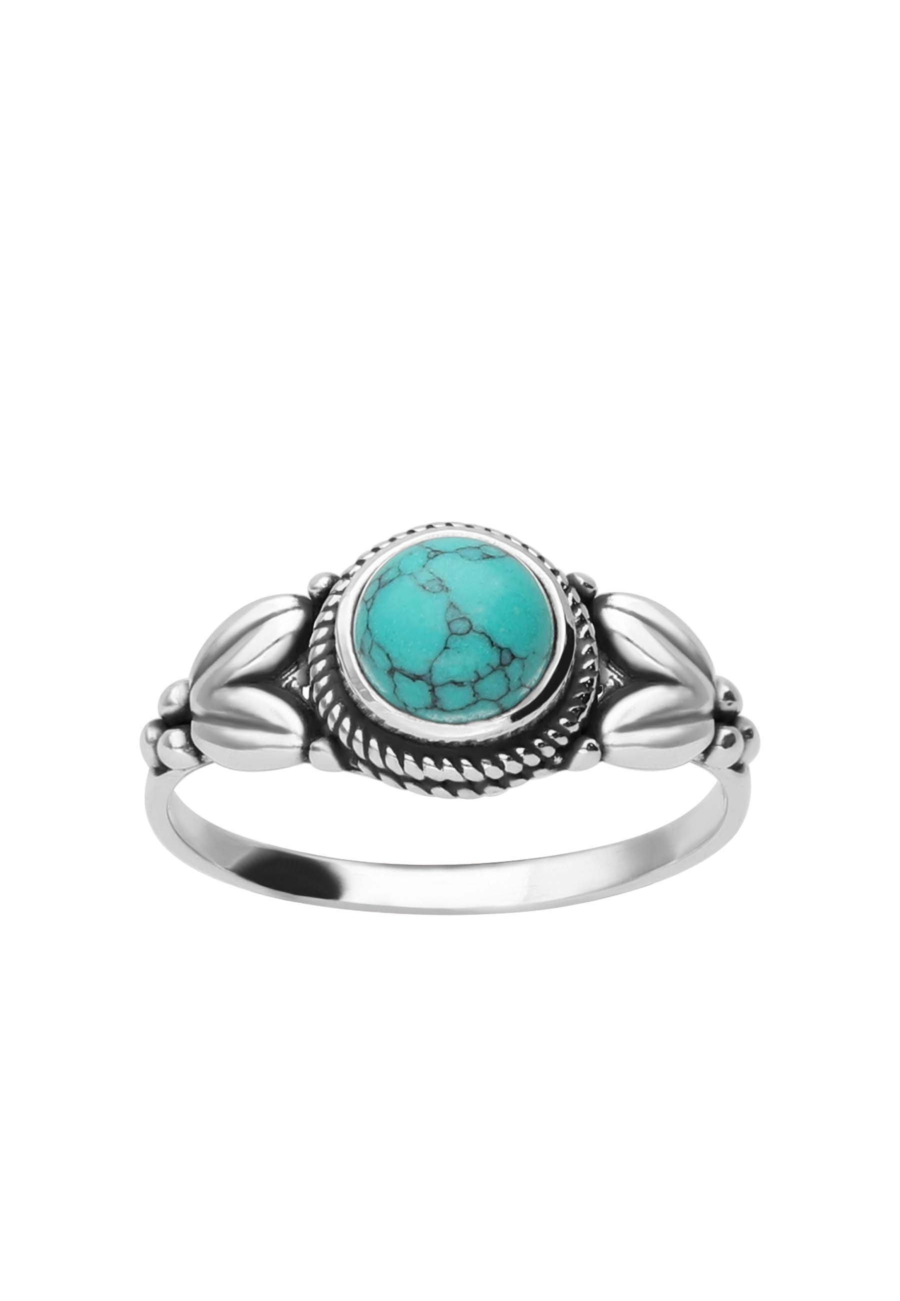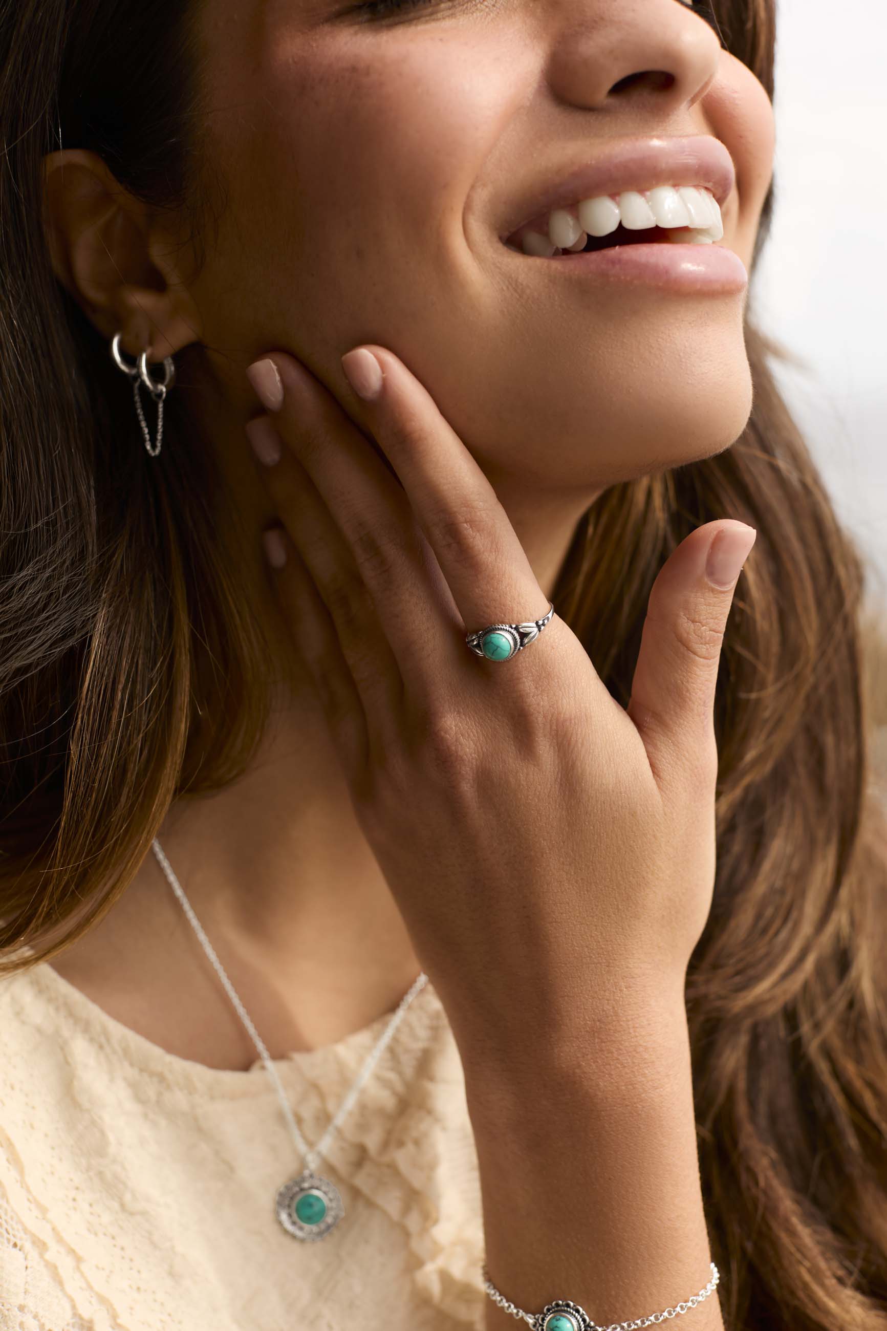 Das Design vom HARISH ist durch den Blau-Grün-Ton des Türkis-Steins gekennzeichnet. Dieses Mineral wird in der Mitte des Juwels gezeigt, eingerahmt von einem endlichen verflochtenen Silber und zwei feinen Details in Form von Blättern.
