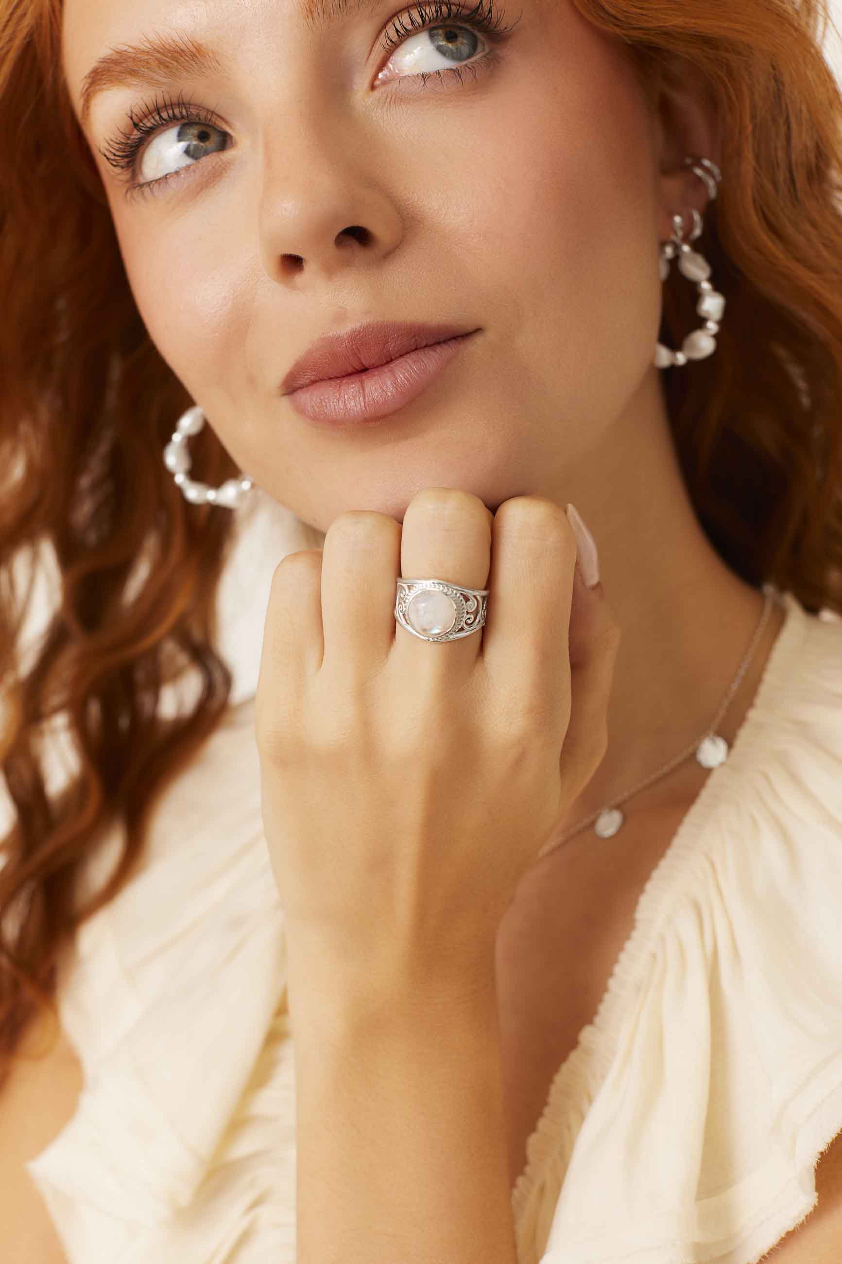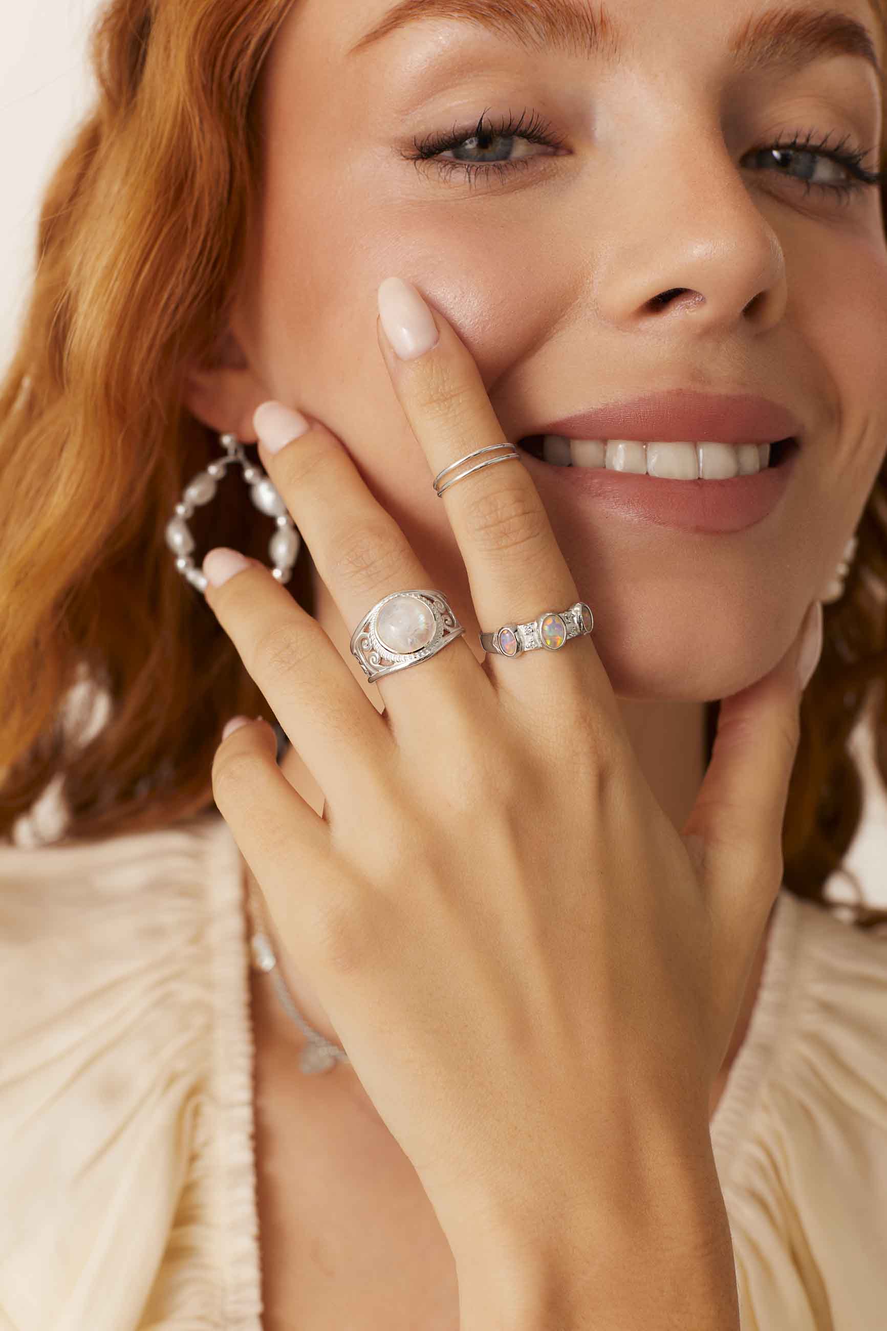 Der GANDHARI Ring hat ein wunderschönen runden Mondstein in der Mitte als Hauptdarsteller. Er ist umrandet von einer Grundfläche aus 925er Sterling-Silber mit Streifen- Silhouette.