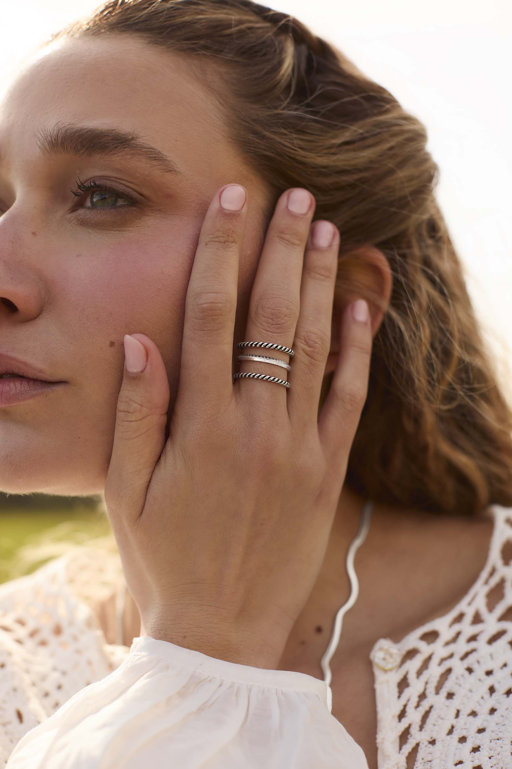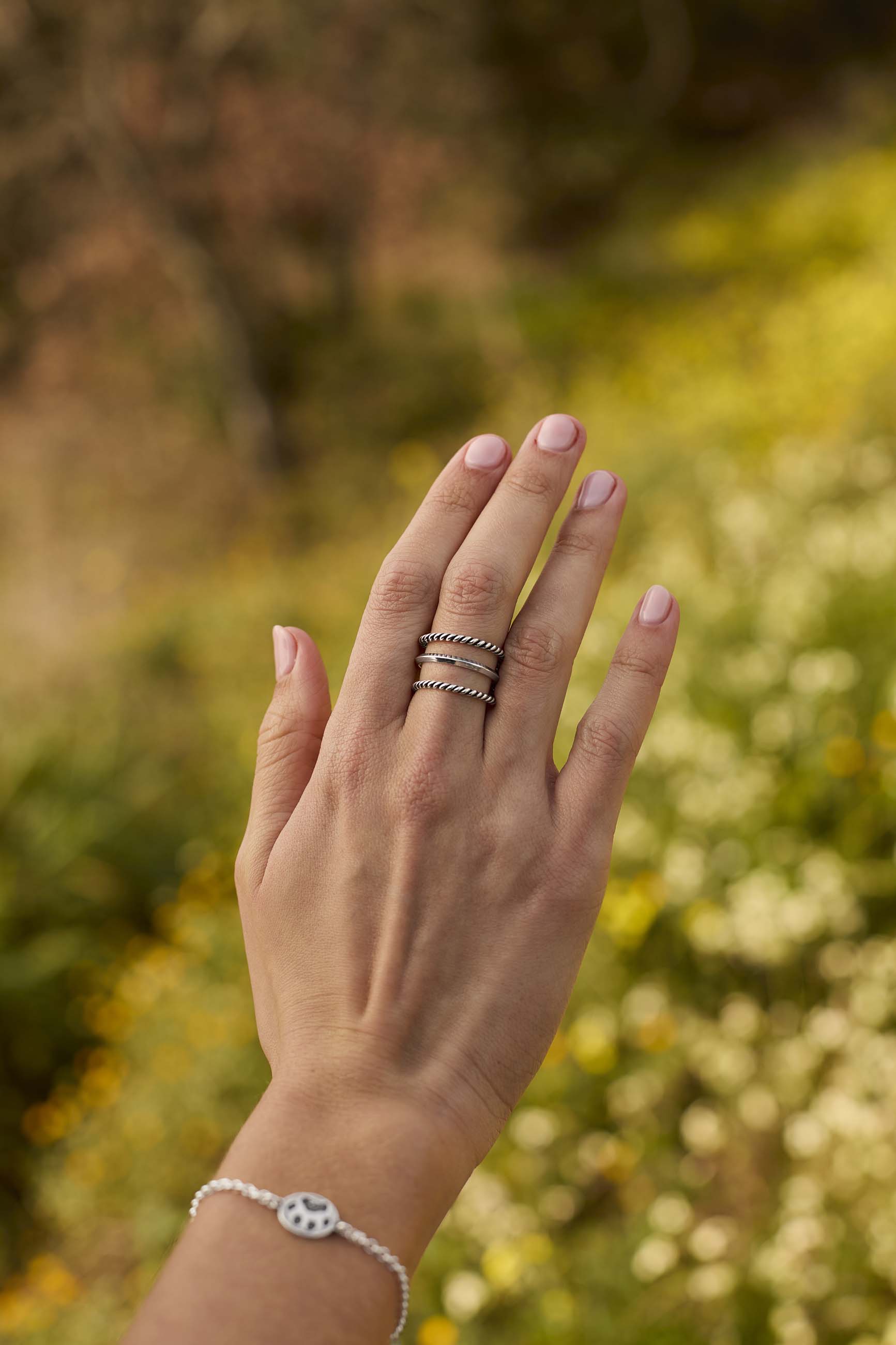 Der NERESH Ring besteht aus einem dreifachen Streifenmuster aus Silber. Die äußeren Streifen sind geflochten und der mittlere ist glatt. Dieser Ring ist sehr dünn und sieht besonders fein aus.