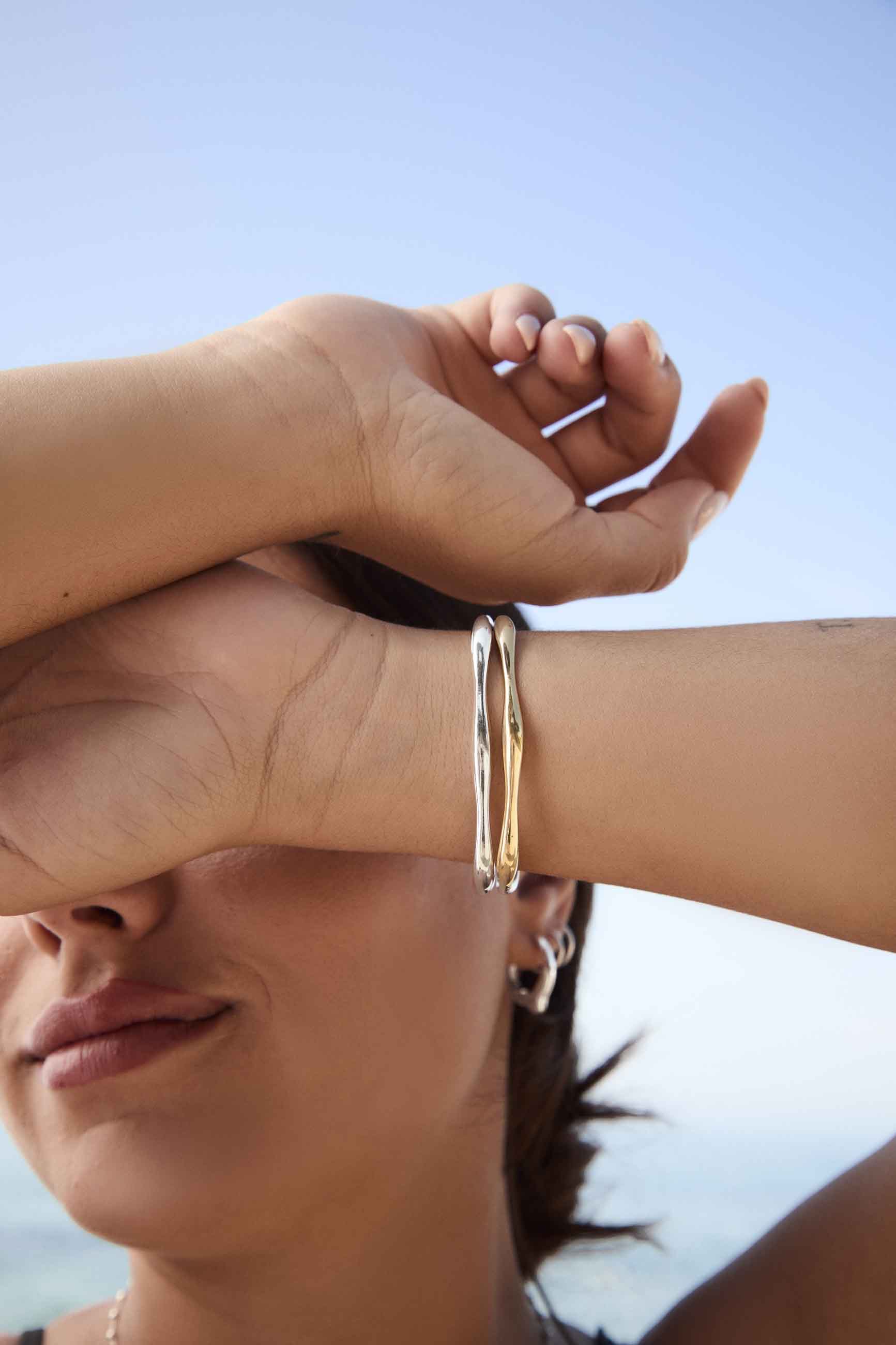 Dieses atemberaubende Armband aus versilbertem Sterling Silber ist eine außergewöhnliche Wahl, um deinen Stil mit Eleganz und Distinktion zu unterstreichen. Sein starres, massives Design zeichnet sich durch eine ungewöhnliche Kontur aus, bei der die verschiedenen Breiten harmonisch ineinander übergehen und einen fesselnden optischen Effekt erzeugen.