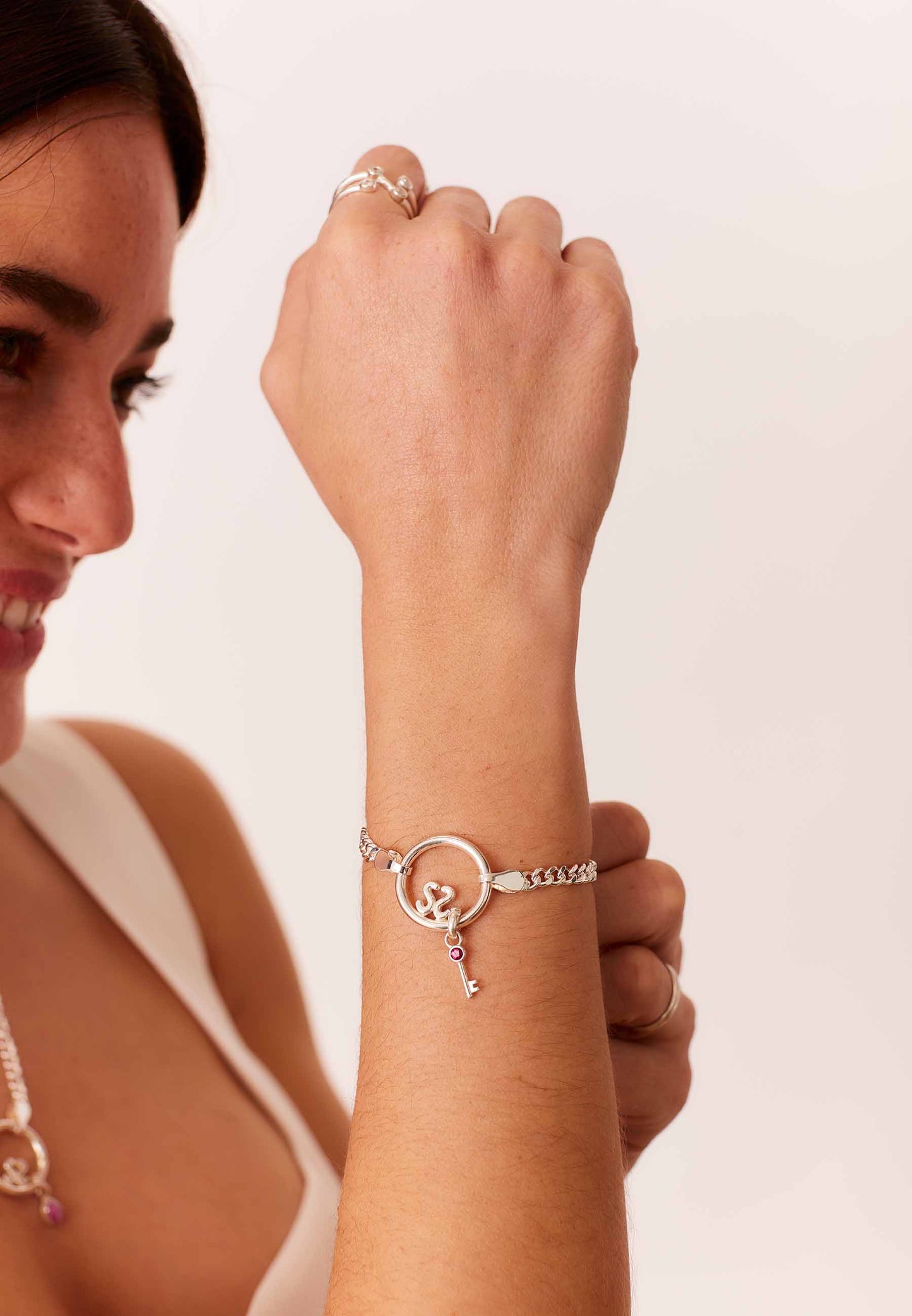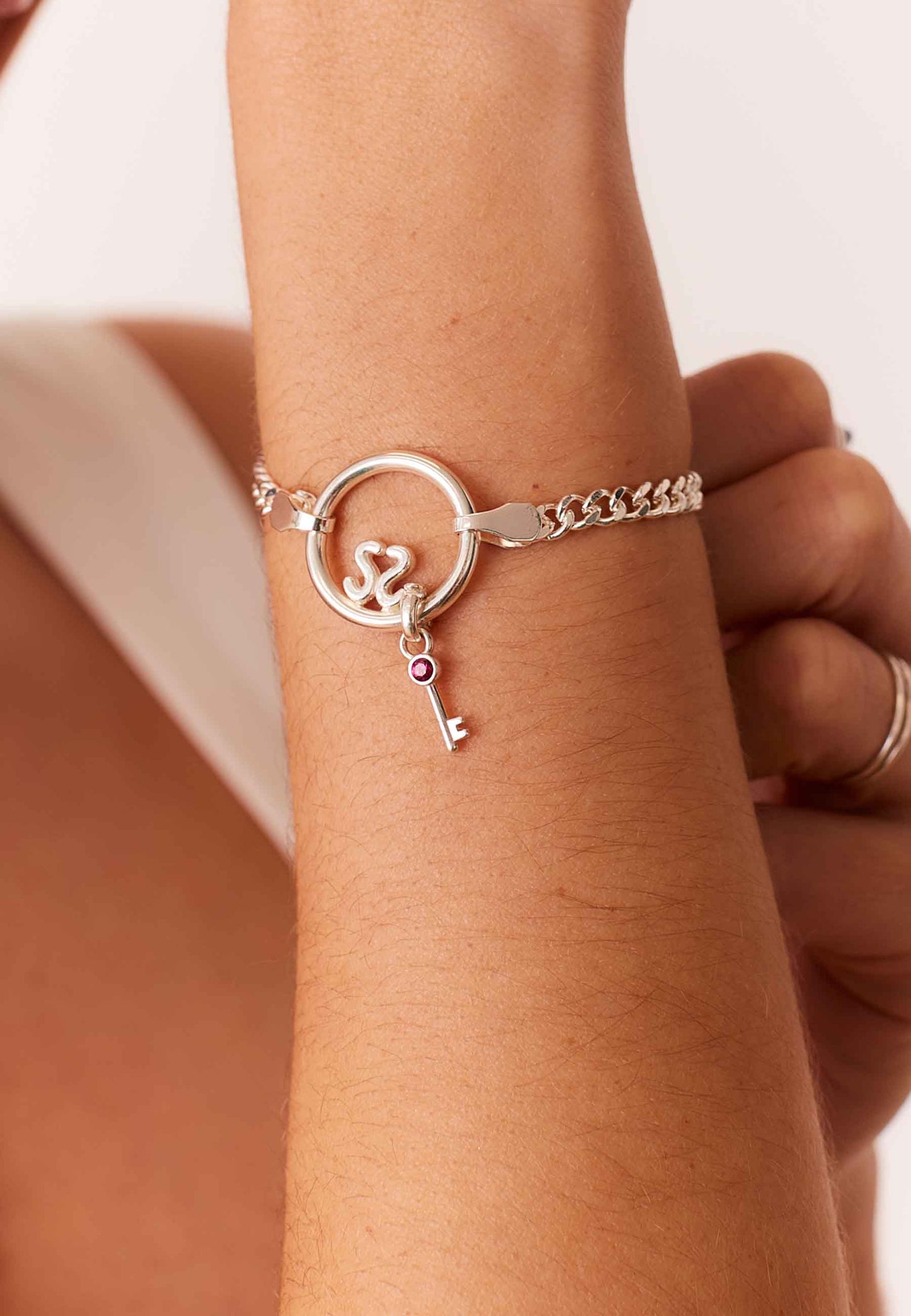 Der Charm in Form eines Schlüssels symbolisiert neue Möglichkeiten, Erfolg und das Öffnen von Wegen. Gefertigt aus 925er Sterlingsilber, besticht dieses elegante Design durch einen Rubin-Zirkonia, der einen lebendigen Farbakzent setzt und für Leidenschaft, Liebe und Lebensenergie steht.
