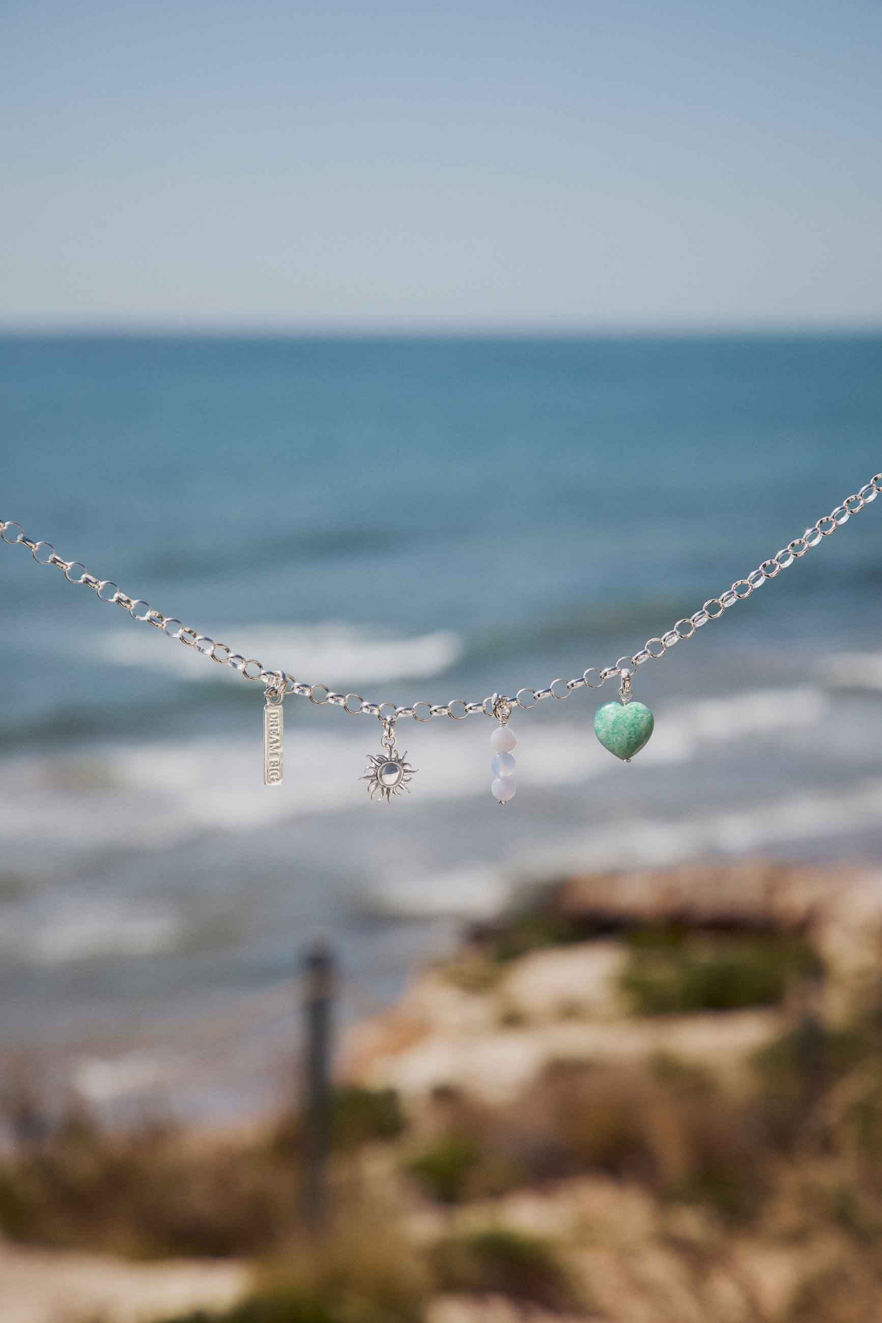 Der Charm Nitya mit seiner zarten Herzform aus natürlichem Amazonit ist ein Schmuckstück, das Süße und Authentizität ausstrahlt. Er wurde für die Ketten der Kollektion INSIGNIA entworfen und verleiht deinen persönlichen Kreationen eine besondere Note.
