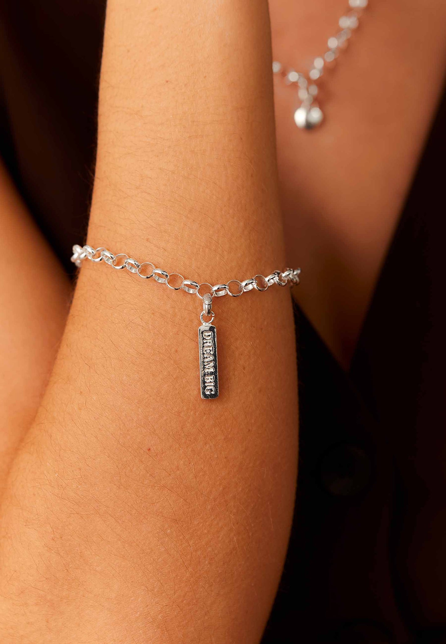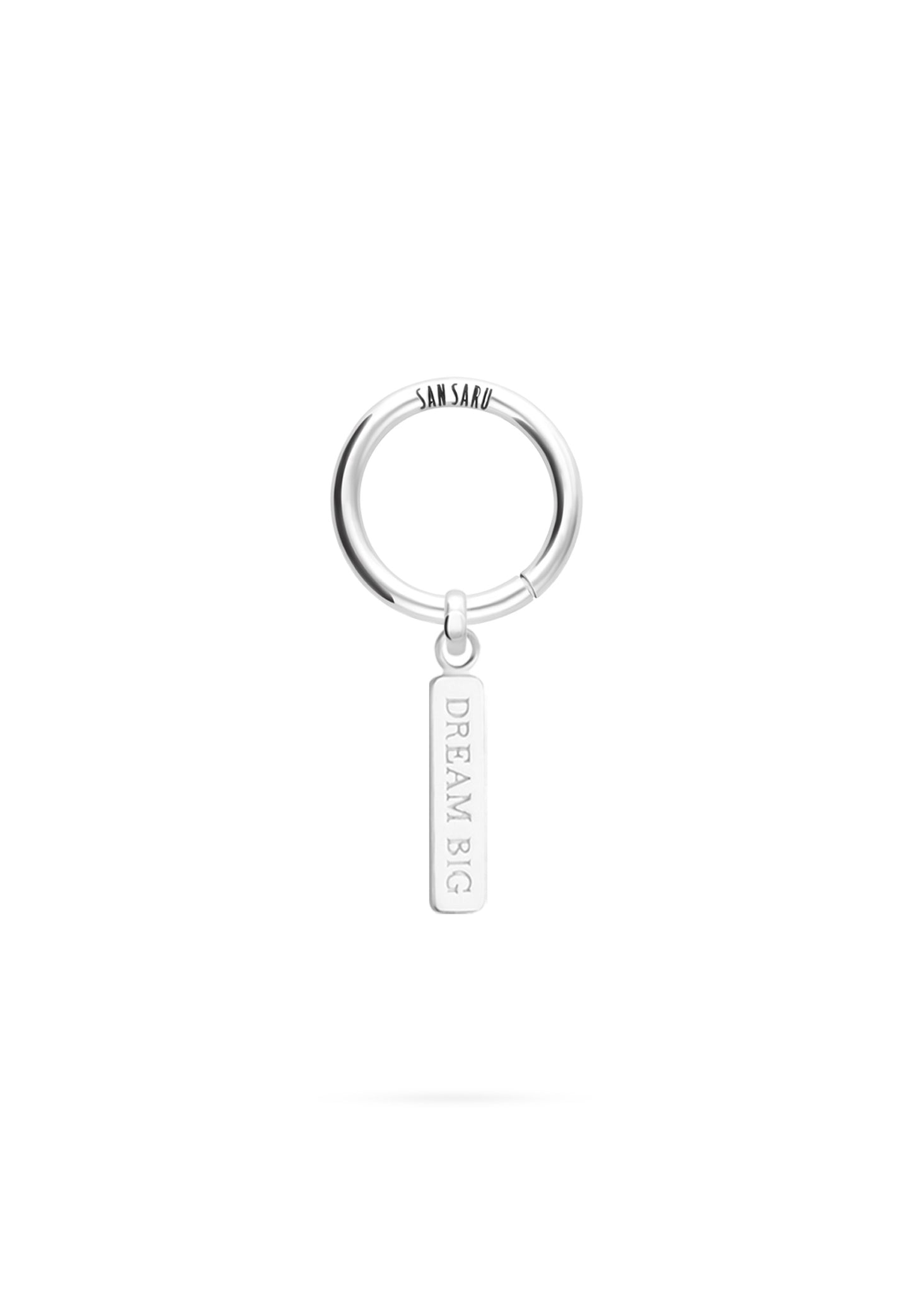 Der Charm Sapana ist ein rechteckiger Anhänger, auf dem die Botschaft „Dream Big“ eingraviert ist, einer der inspirierendsten Slogans von San Saru. Der aus 925er Sterling Silber gefertigte Anhänger passt perfekt zu den Ketten und Verschlüssen der Kollektion INSIGNIA.