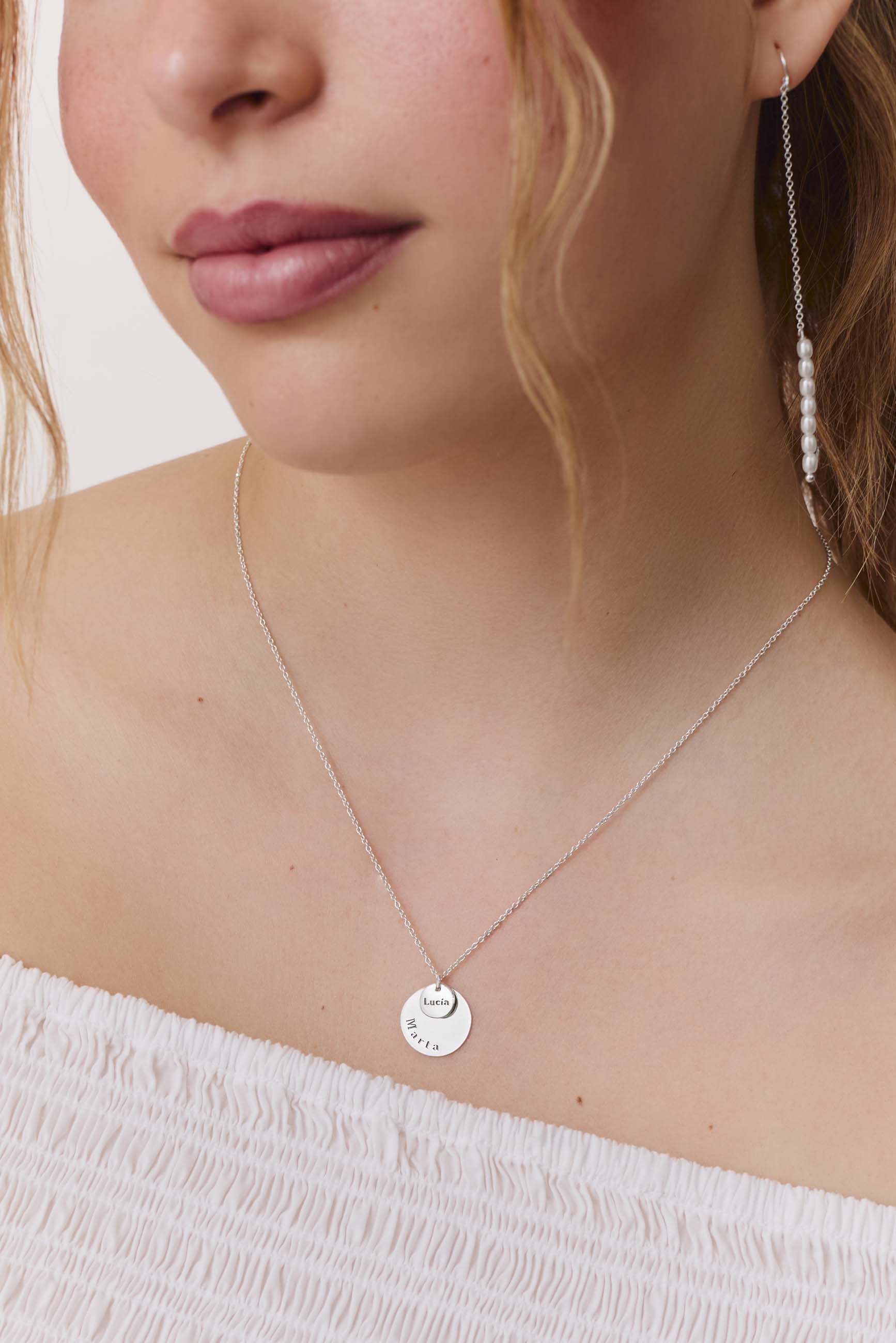 Möchtest du ein besonderes Geschenk machen? Unsere Halskette Gaura aus 925er Sterling Silber ist die beste Wahl. Diese Halskette hat einen besonderen Charme: zwei hängende Plättchen, die bei jeder Bewegung tanzen, eines größer als das andere, was eine charmante visuelle Harmonie schafft.