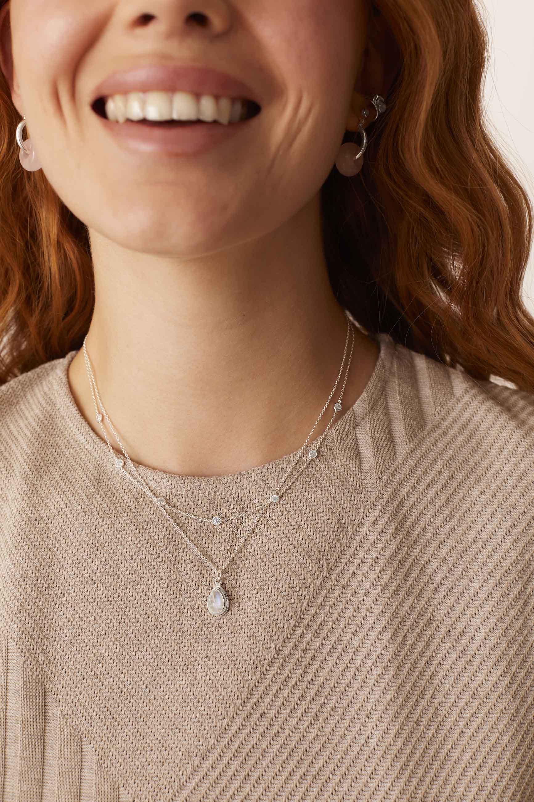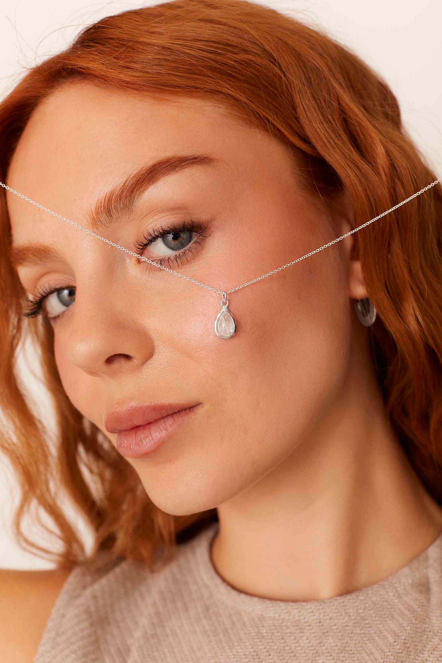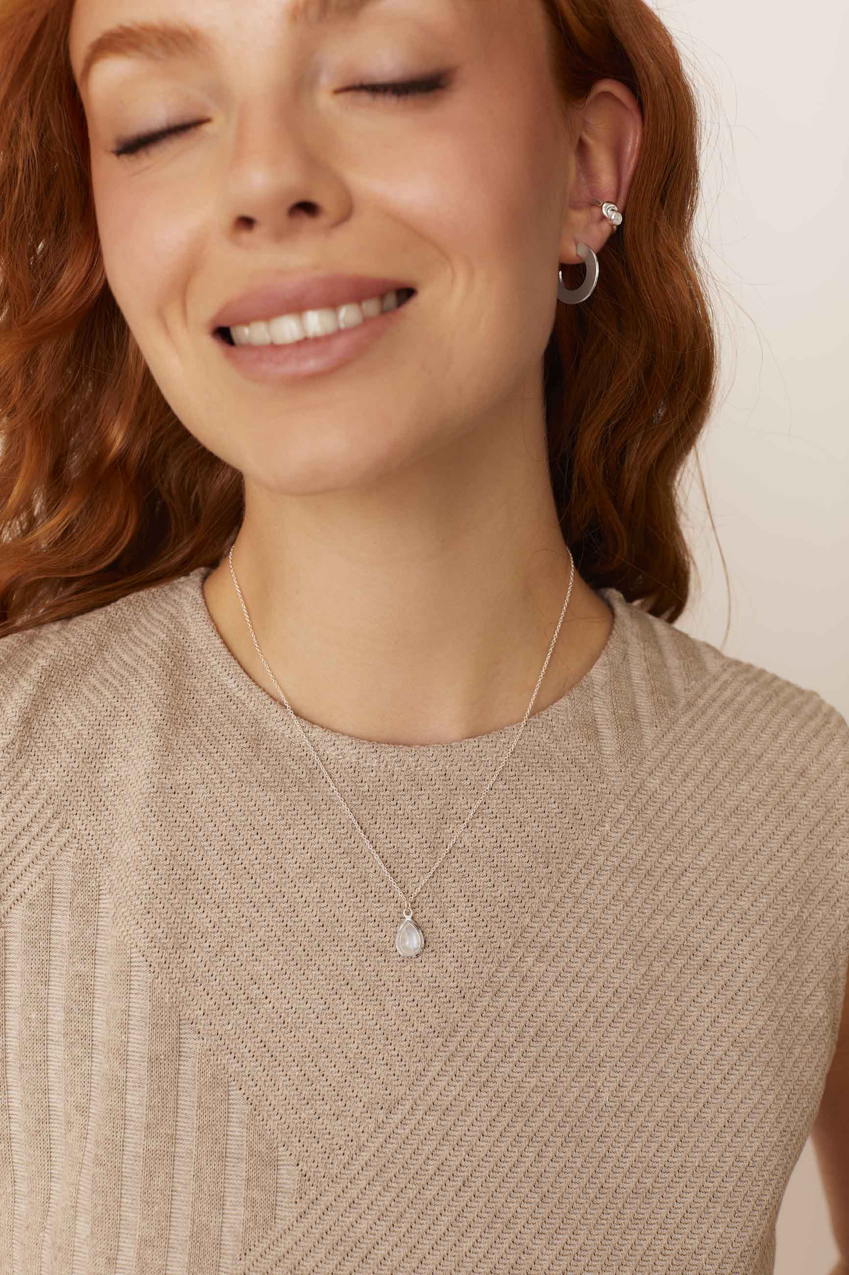 Die Halskette RAKA MONDSTEIN ist von einem Wassertropfen inspiriert. Sie ist aus 925er Sterling Silber und Mondstein gefertigt. Die Farbe dieses Edelsteins ist sehr besonders, sie sieht transparent aus, spiegelt aber die Töne der Umgebung wider - ein einzigartiger und überraschender Effekt!