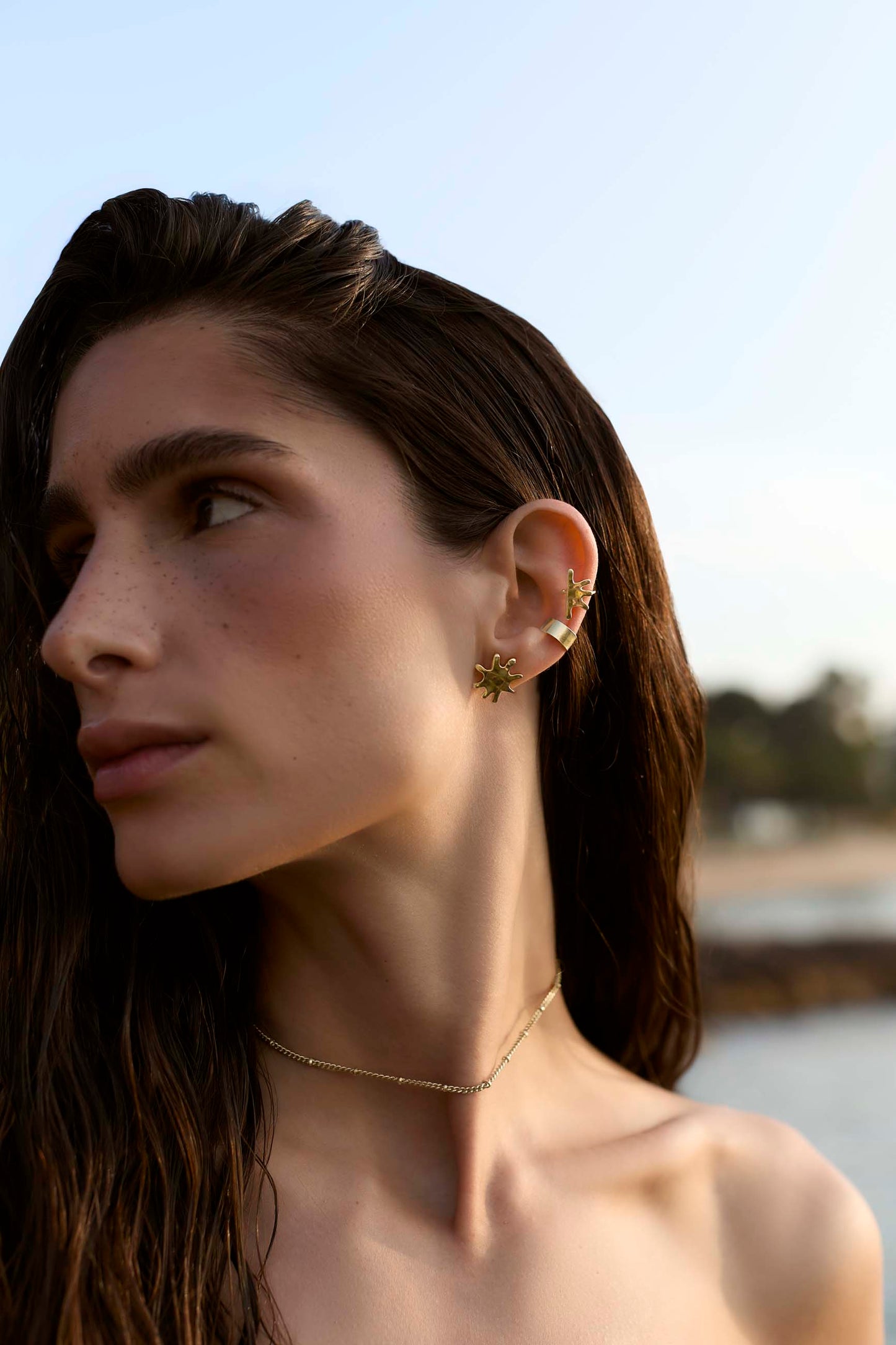Durch die Kombination aus Stecker und Ear Cuff entsteht ein auffälliges Design, das jeden Sommerlook mit einem goldenen Akzent aufwertet.