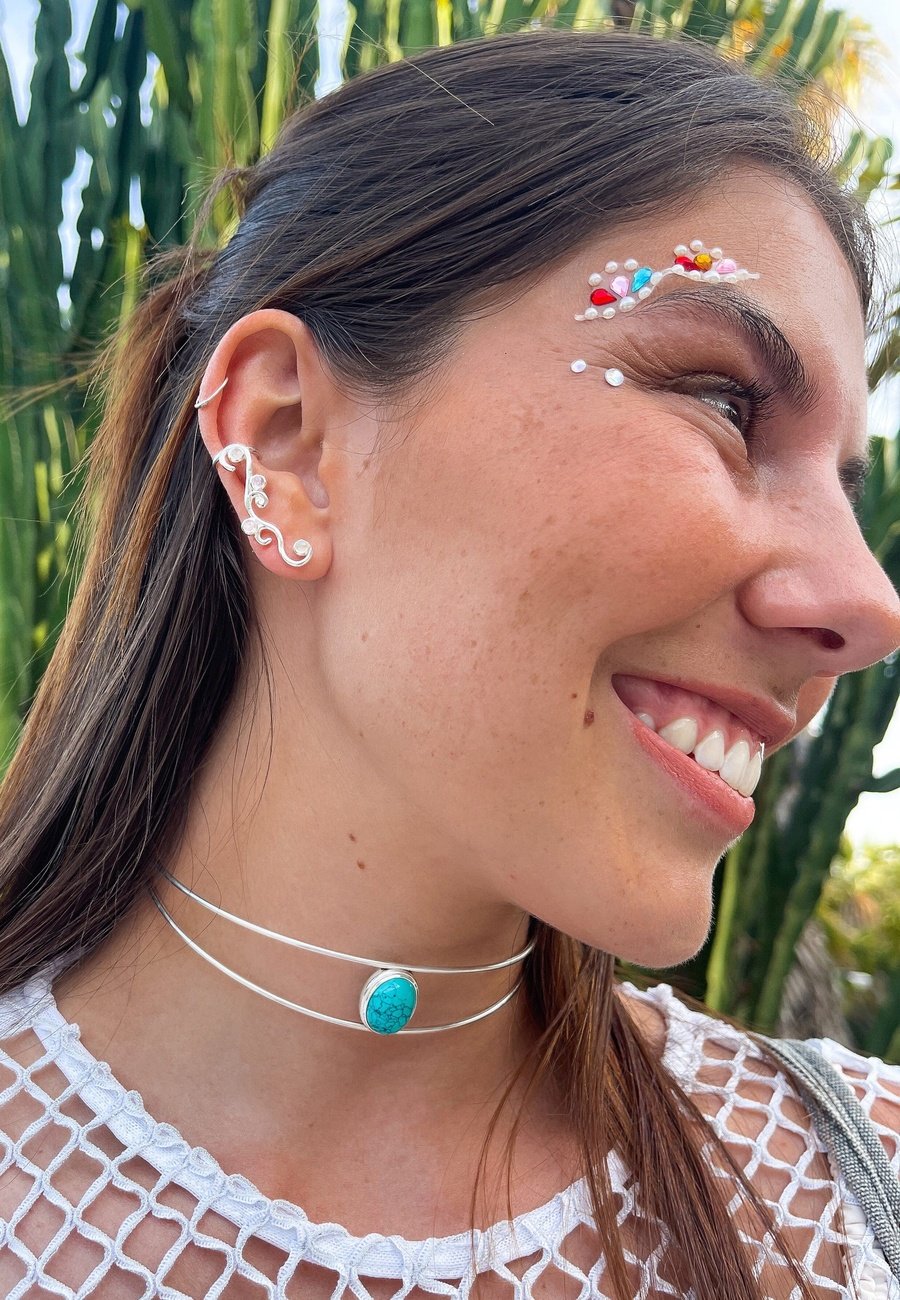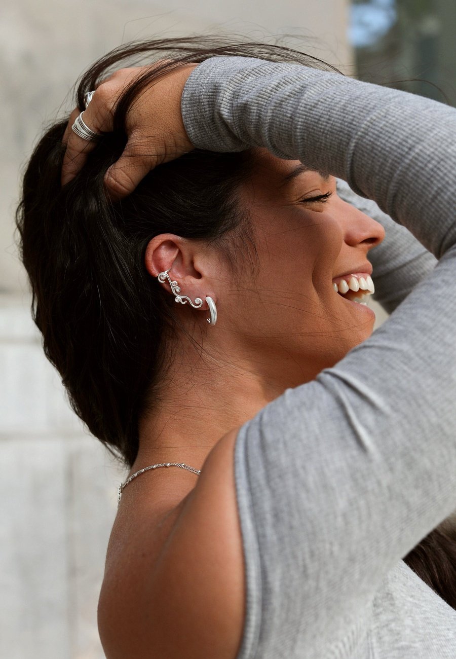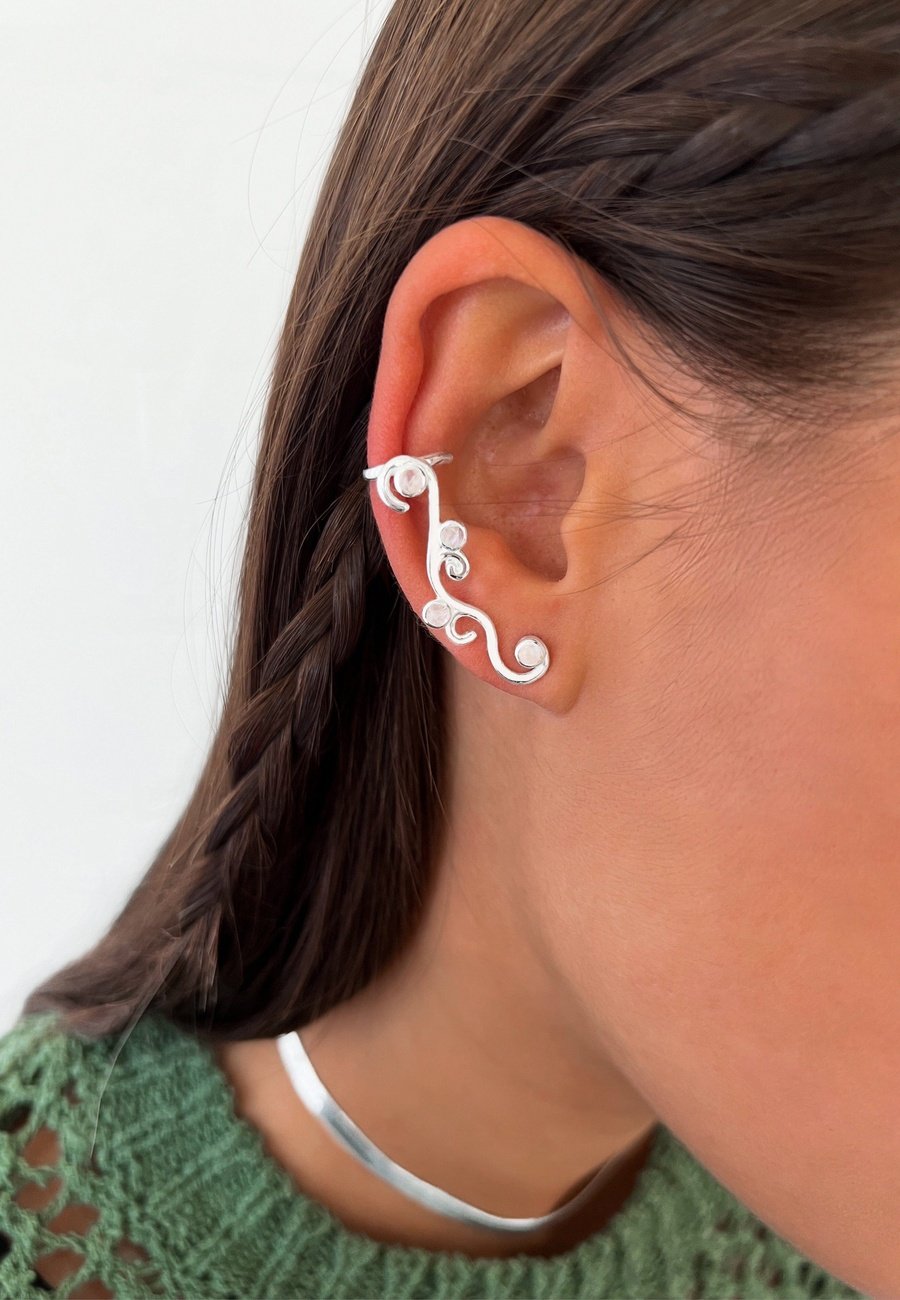 Der CHAMELEE ist ein Ohrkletterer aus 925er Sterling Silber mit Mondstein. Das Design des CHAMELEE ist atemberaubend. Er ist so konzipiert, dass er im ersten Loch des Ohrläppchens getragen wird, und der Ohrring folgt der Form deines Ohrs bis zum Knorpel. Am Knorpel wird sie wie eine Ohrmanschette getragen, um zusätzlichen Halt zu bieten.