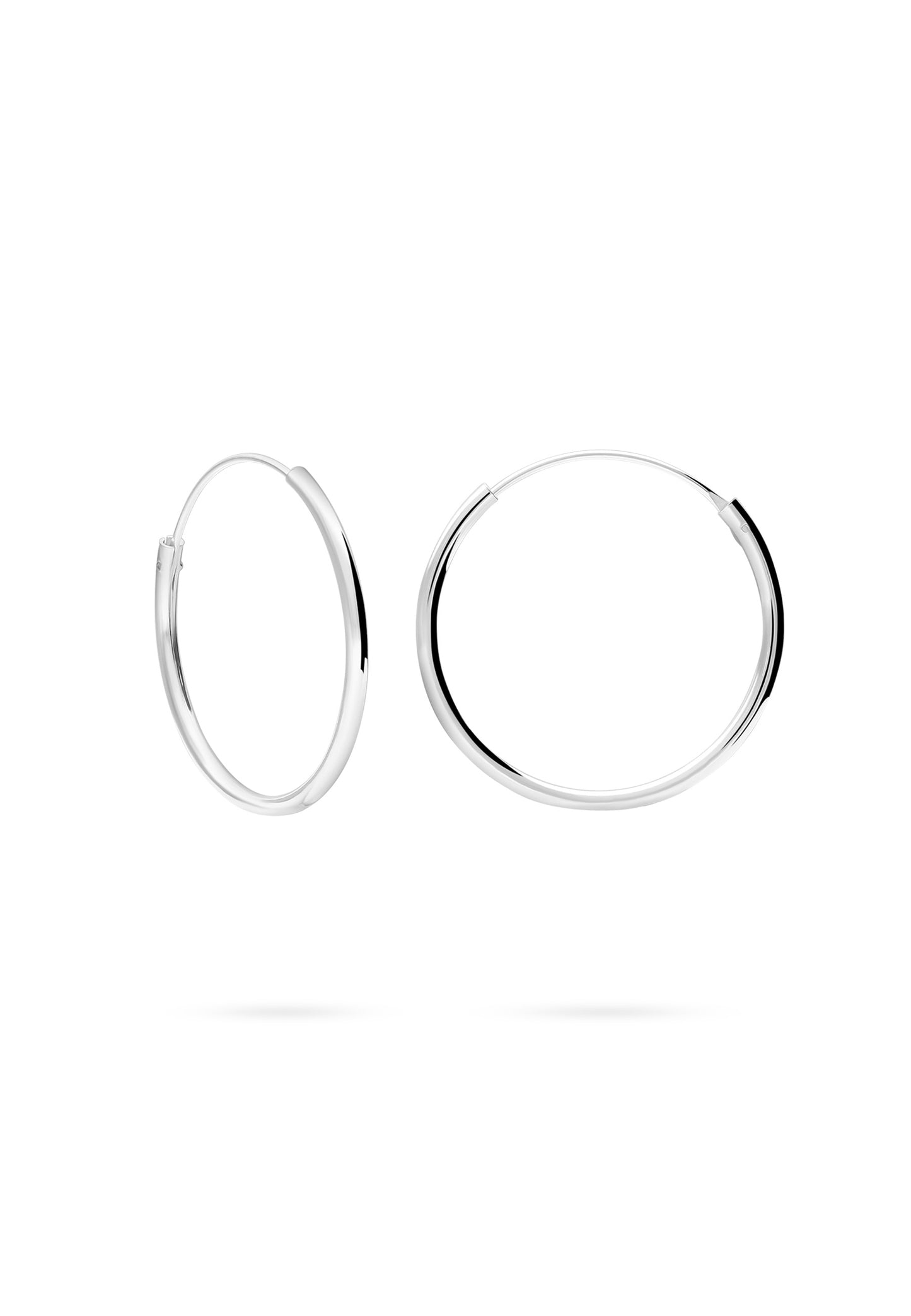 Die JIVANA Ohrringe (25mm) sind große glatte Creolen aus Silber. Sie haben kein Relief, keine Formen außer dem Ohrring und keine Farben außer der vom Sterling Silber.