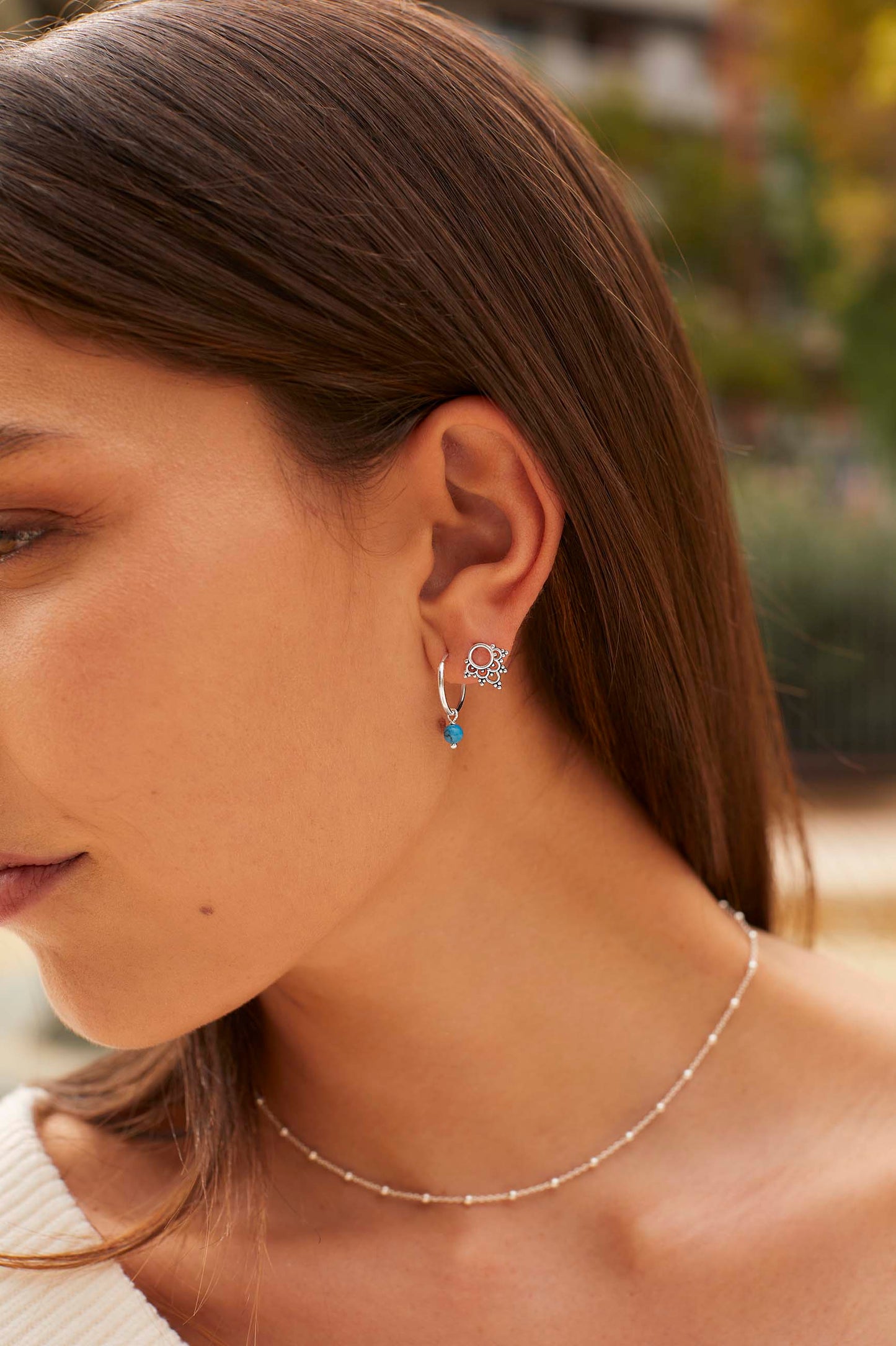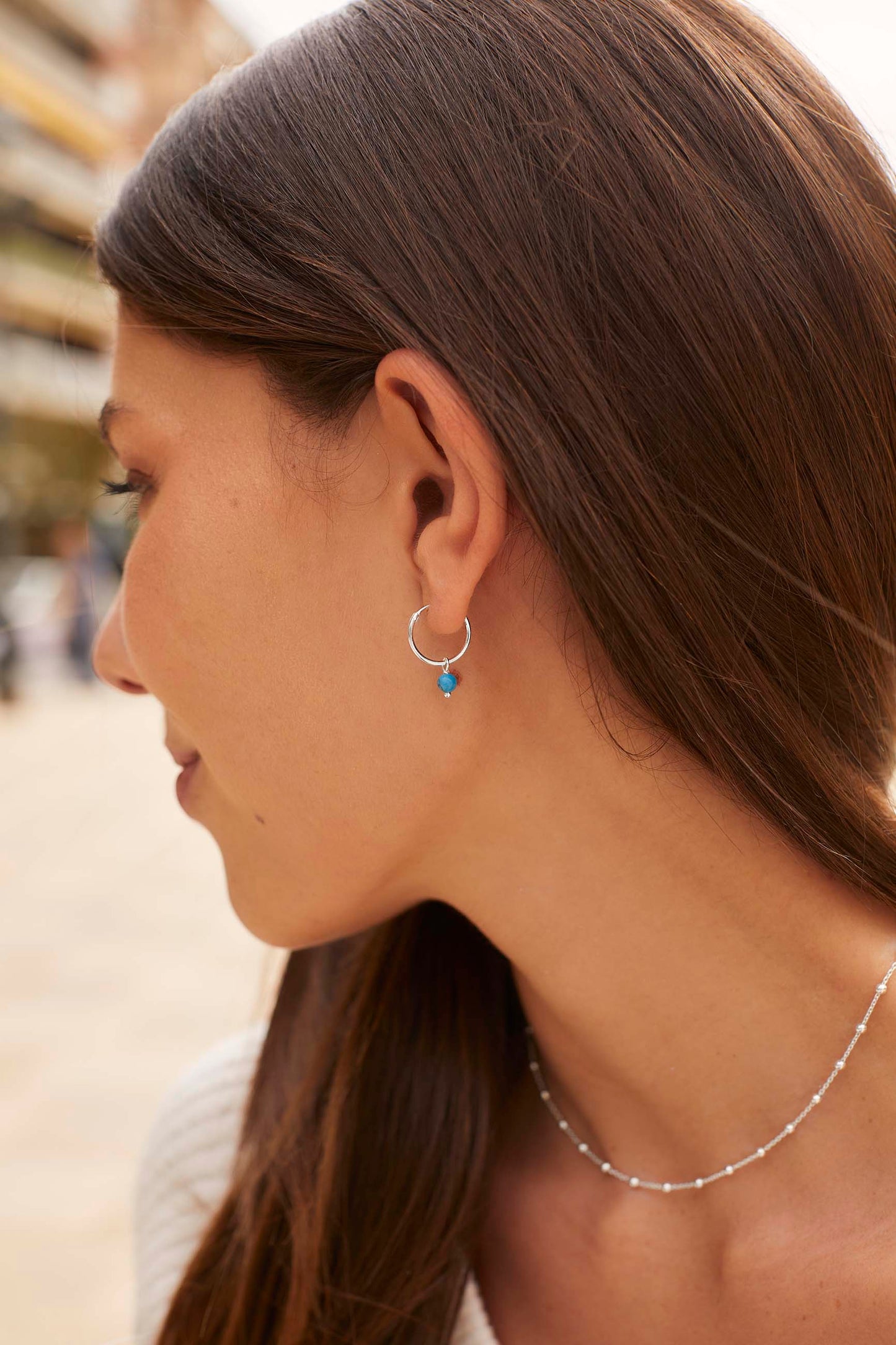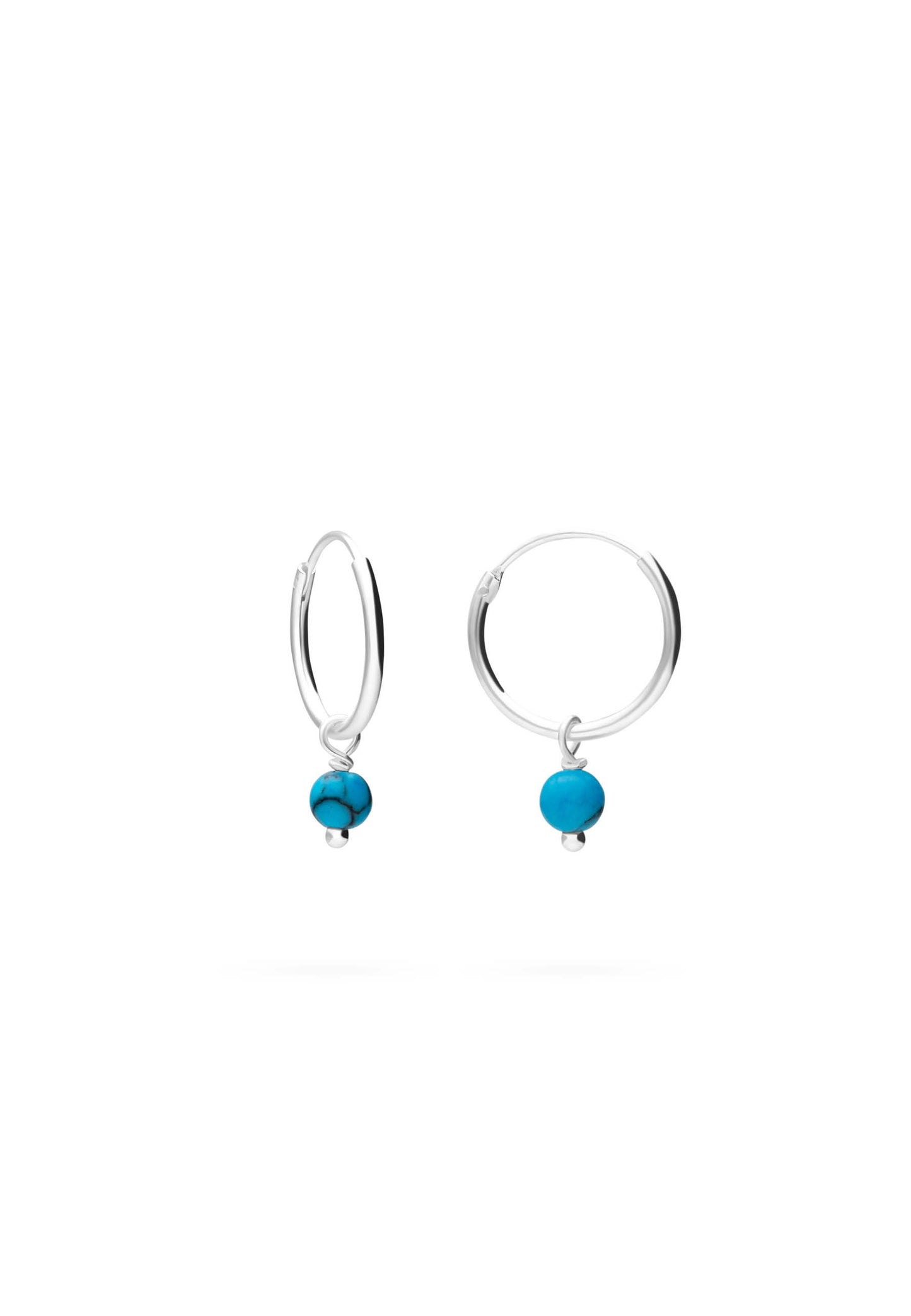 Die NITIKA sind feine Creolen von dem ein kleiner runder Türkisstein herabhängt. Dieses schlichte und elegante Design lässt sich gut mit größeren, auffälligen Formen-Ohrringen oder Creolen kombinieren.