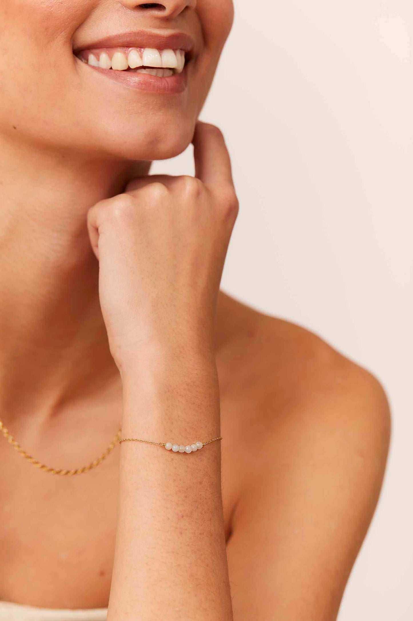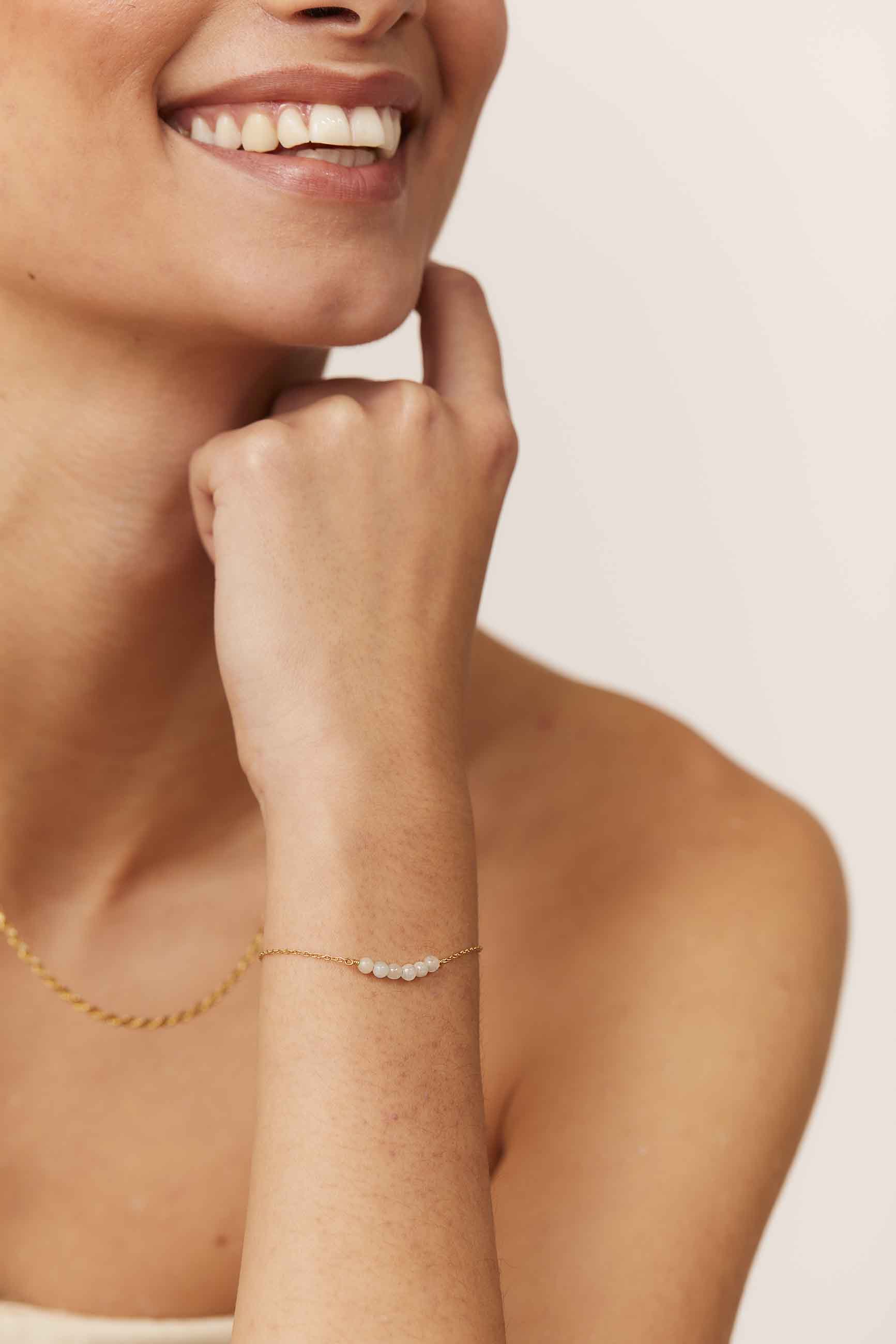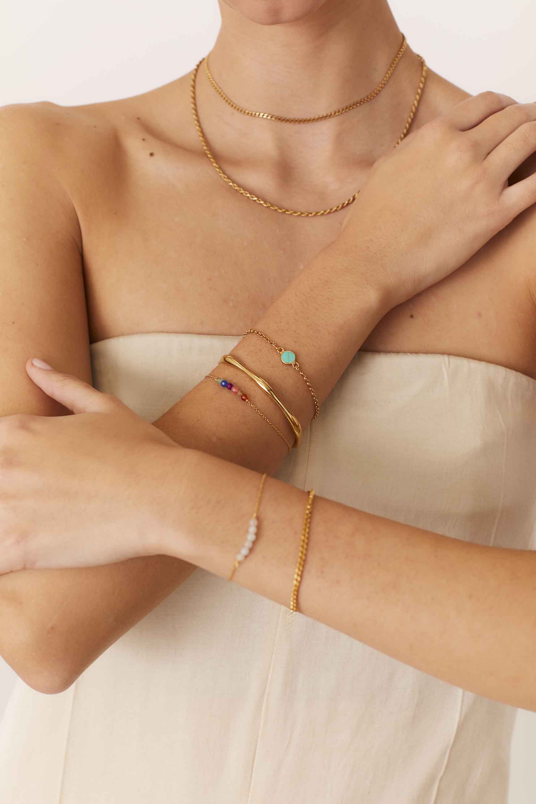 Das UMAH ist aus 925er Sterling Silber gefertigt und mit 22K Gold vergoldet. Die Mitte des Armbands besteht aus 6 kleinen Amazonitsteinen, die dem Schmuck einen Hauch von Farbe verleihen. Du wirst es lieben!