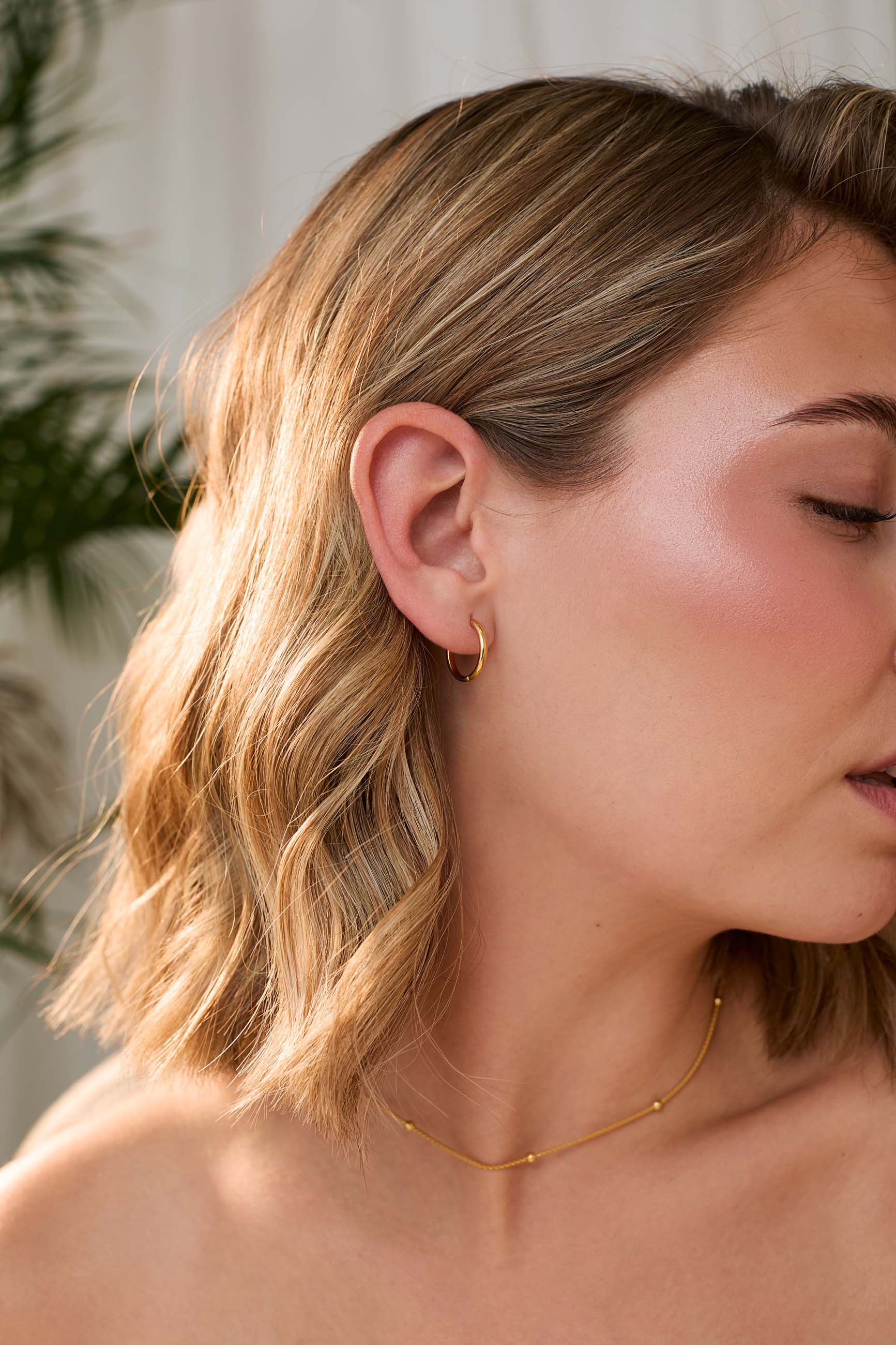 The 16 mm JABARI earrings are a pair of smooth and shiny hoops, made of 925 Sterling Silver and plated in 22k gold. They have that perfect thickness that’s not too thin but not too bold either. A simple yet elegant design that works with any style.