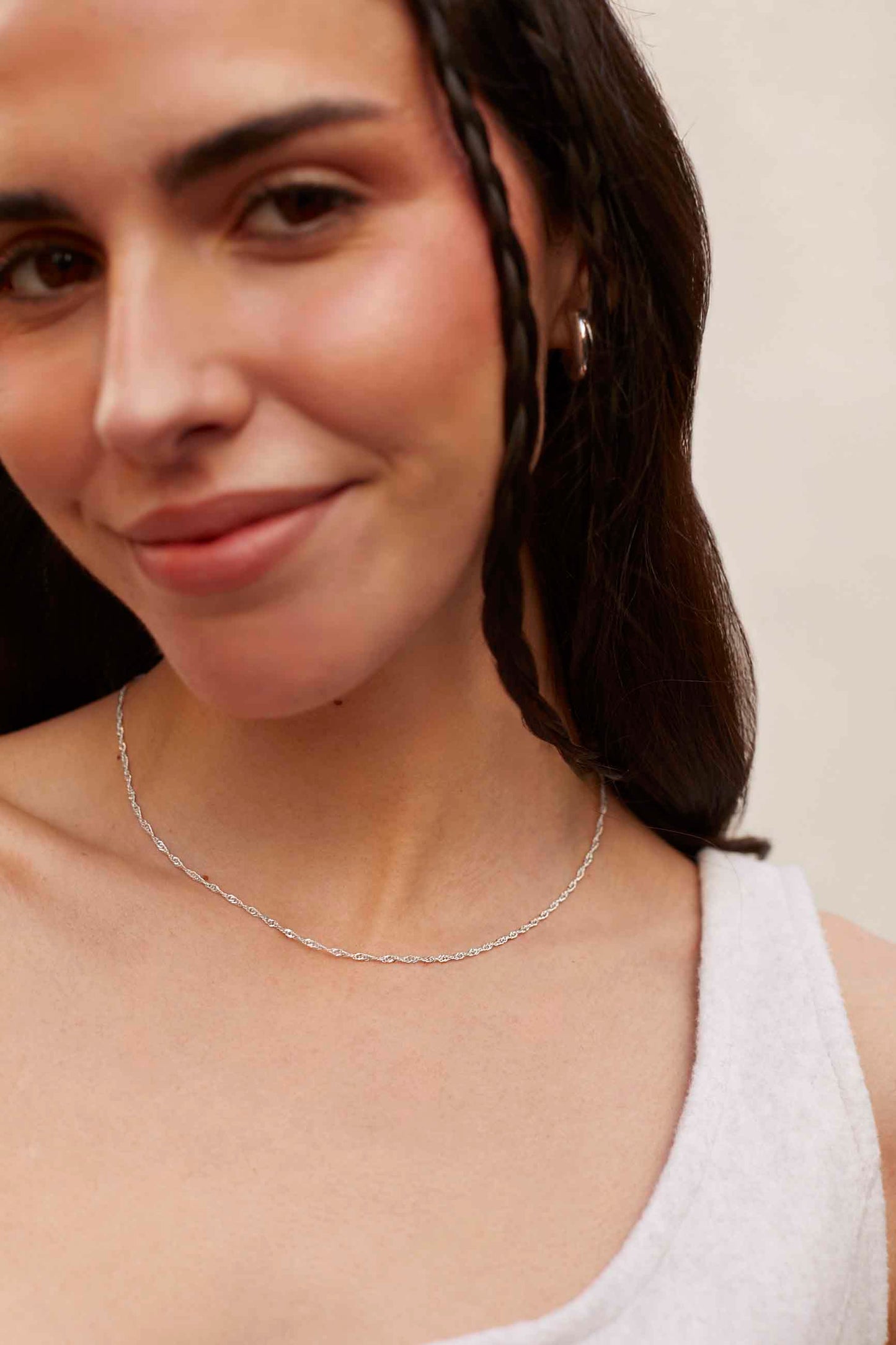 Our Singapore chain necklace made of 925 Sterling Silver. Its design of twisted, rounded, and flattened links captures and refracts light in a unique way, giving you exceptional brilliance with every movement.