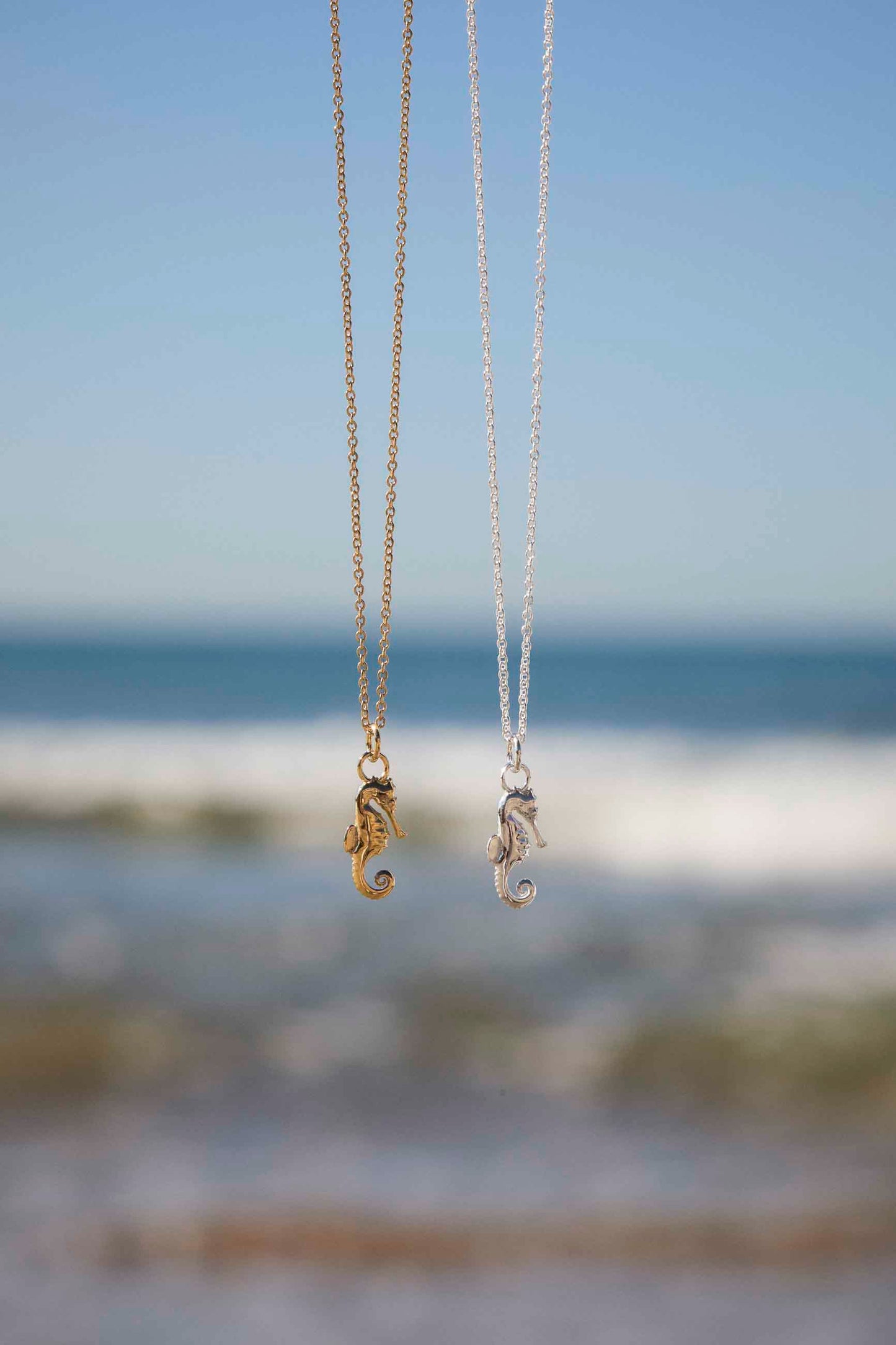 The SLOKA necklace is a 925 Sterling Silver choker made of a fine chain and a seahorse-shaped pendant.
