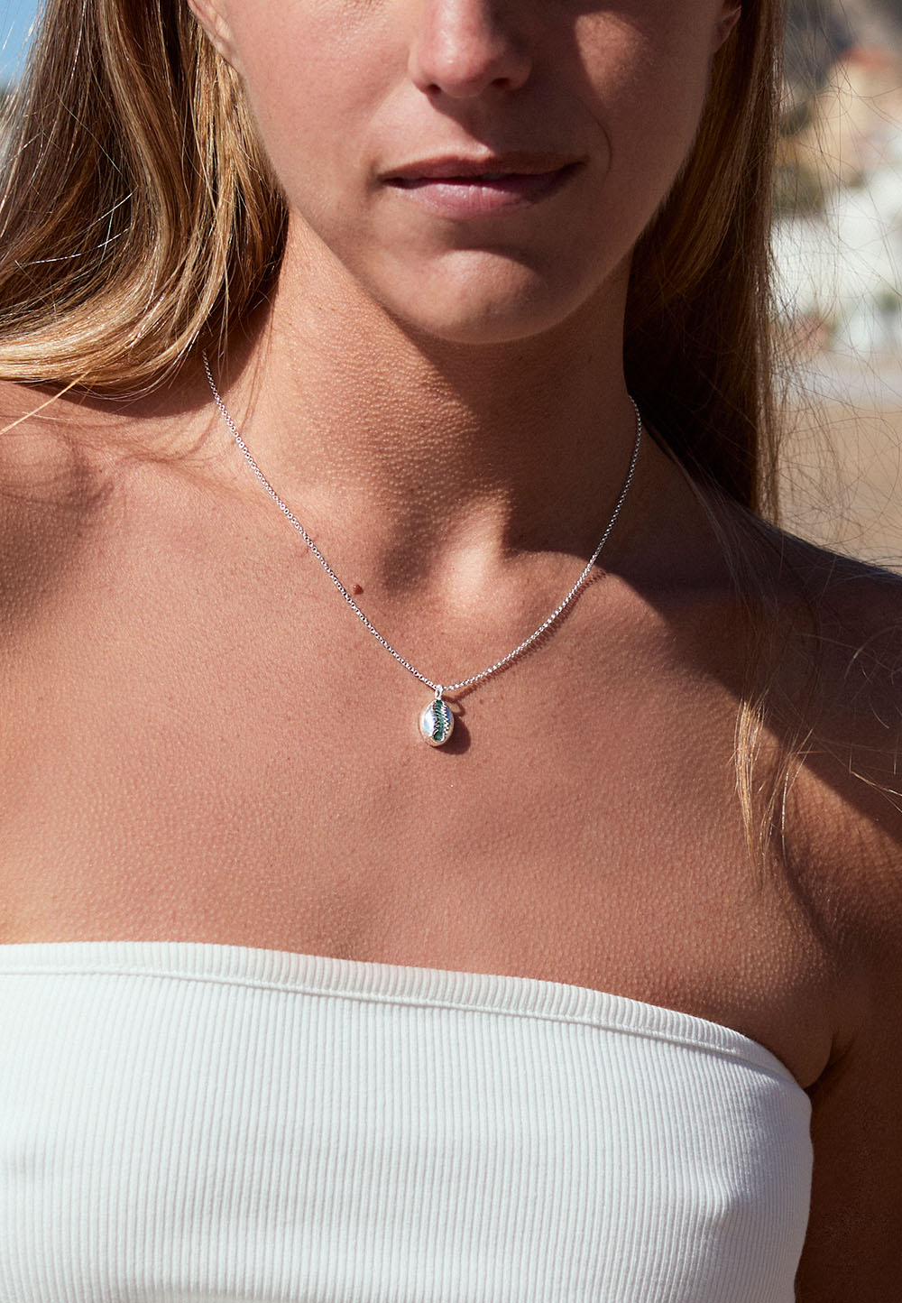 This charming 925 sterling silver necklace features a delicate shell-shaped pendant with an Amazonite stone inside that radiates freshness and serenity. Perfect to wear this summer and combine with the Sels ring. An elegant and modern set that will add a touch of style to your summer looks. Enjoy the season with this unique accessory!