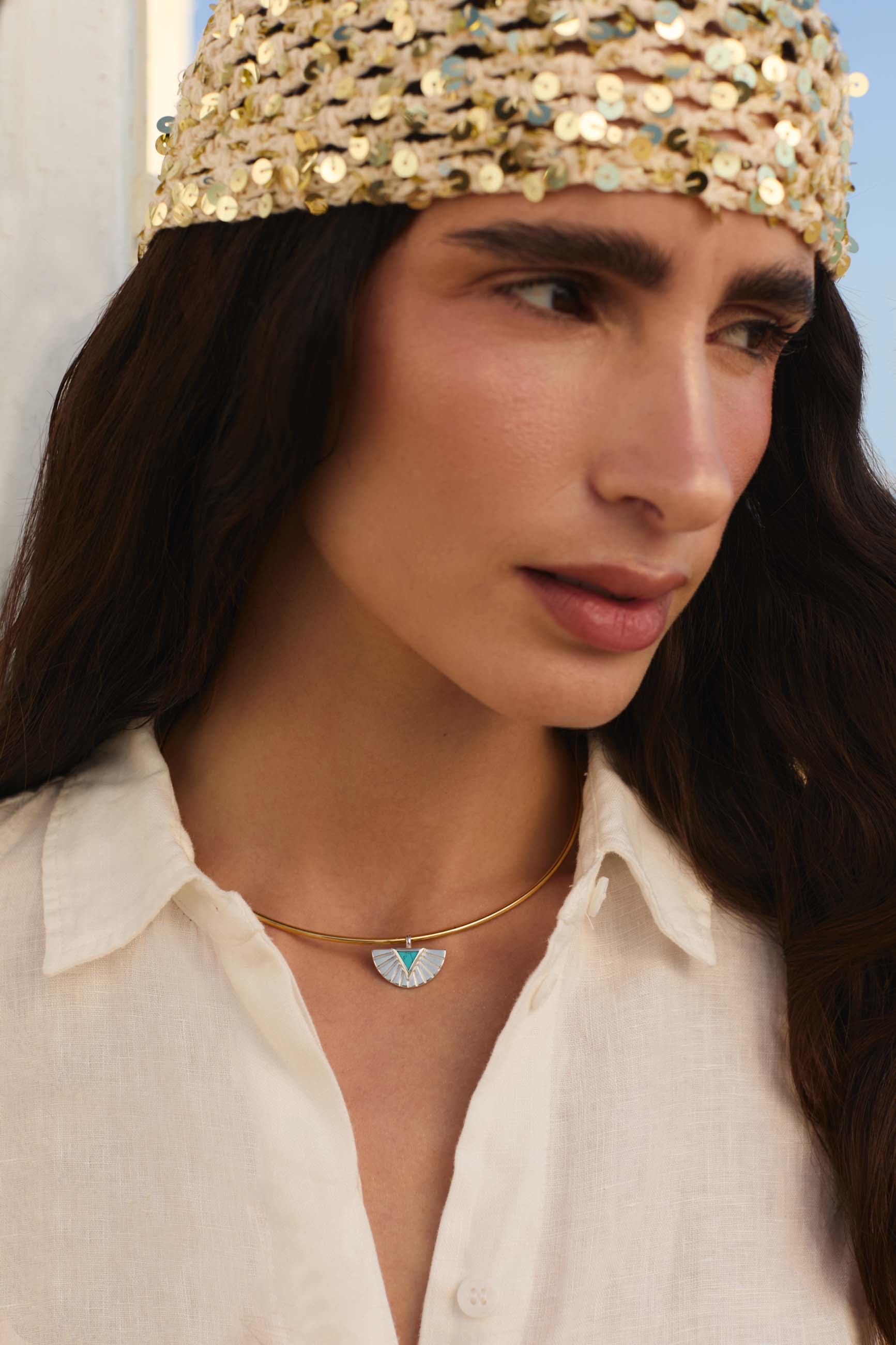 ARADH is a smooth and rigid necklace that stands out for having an Egyptian style pendant with a turquoise stone in the middle. It's gorgeous!