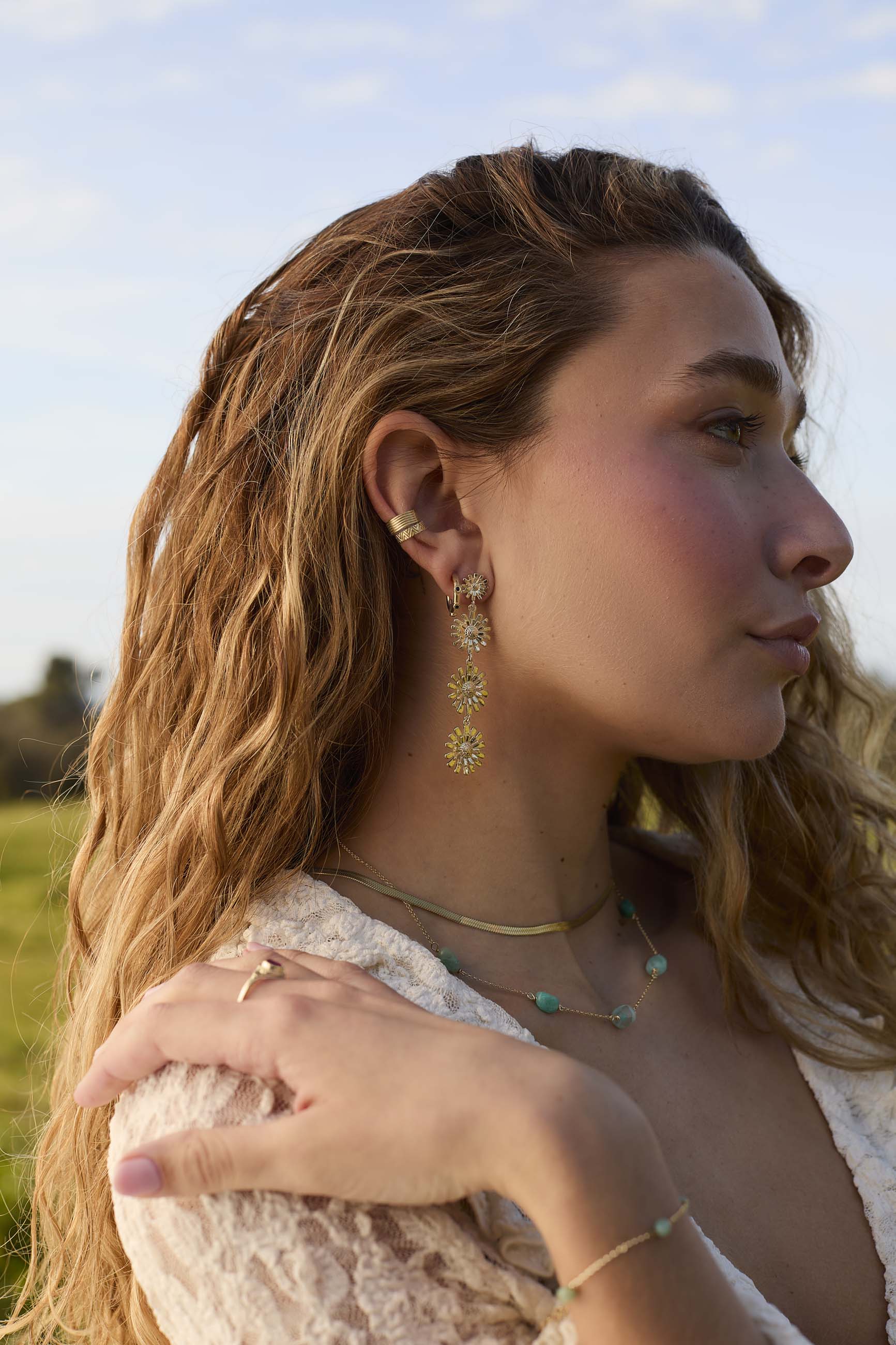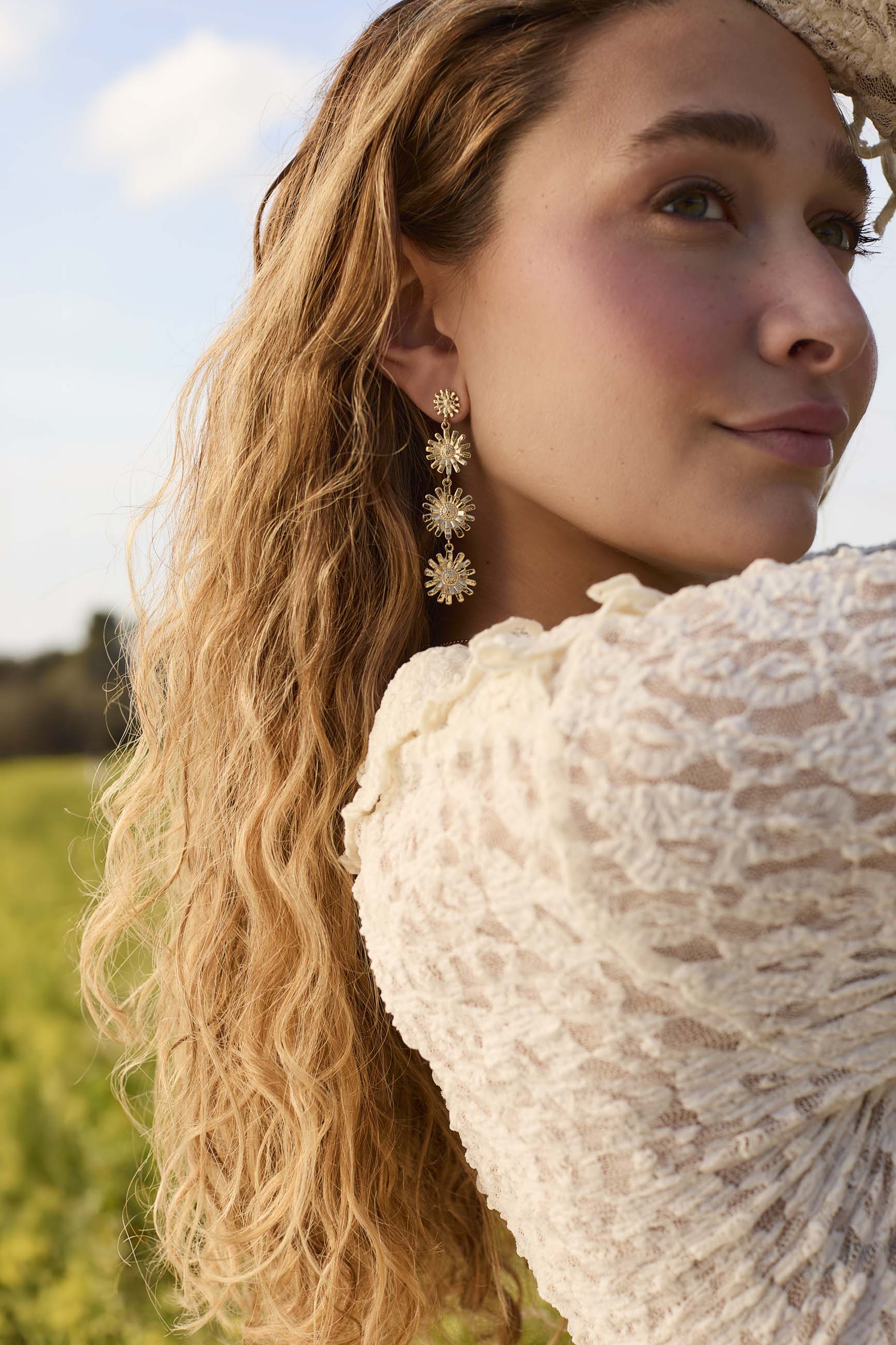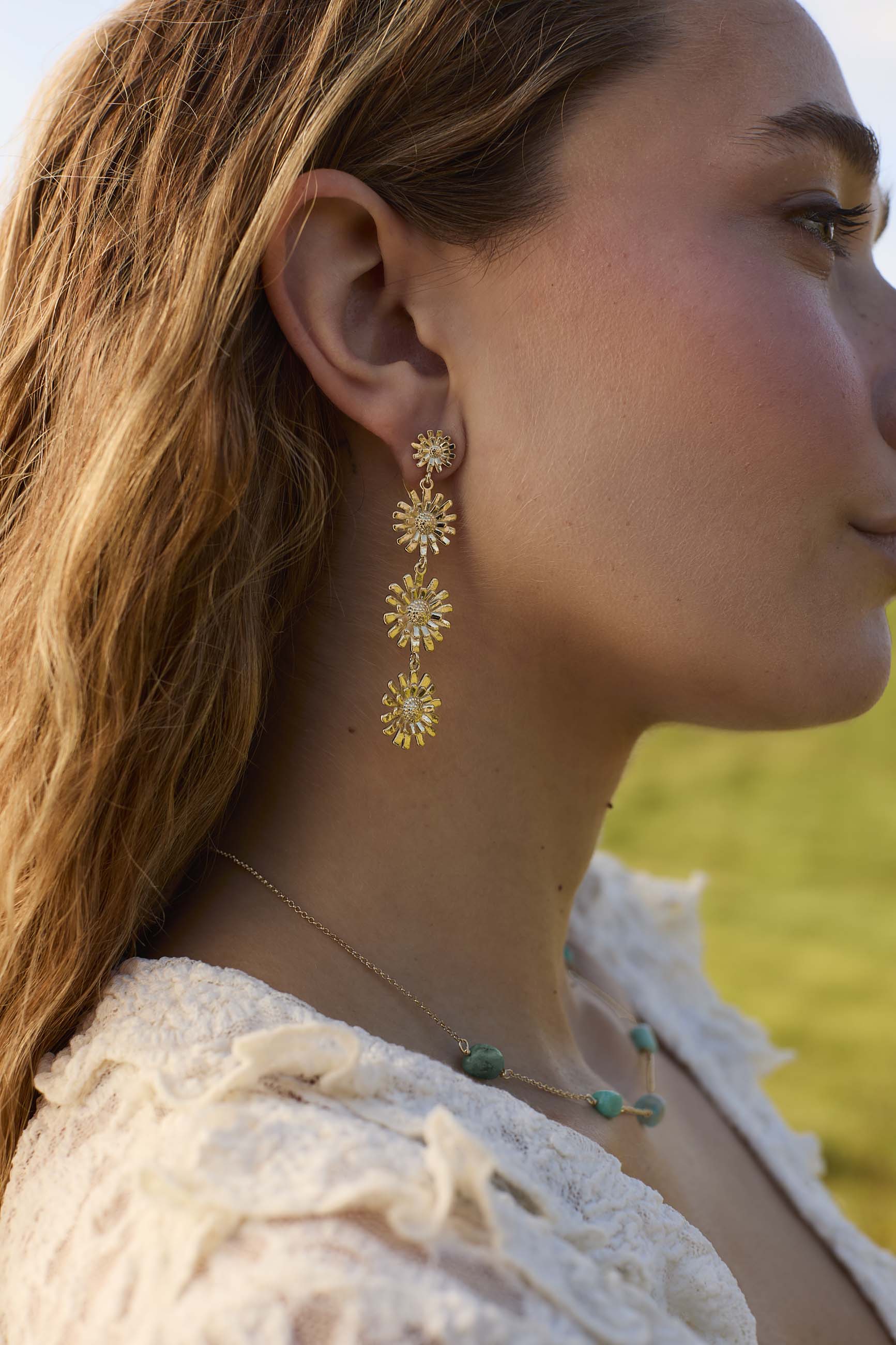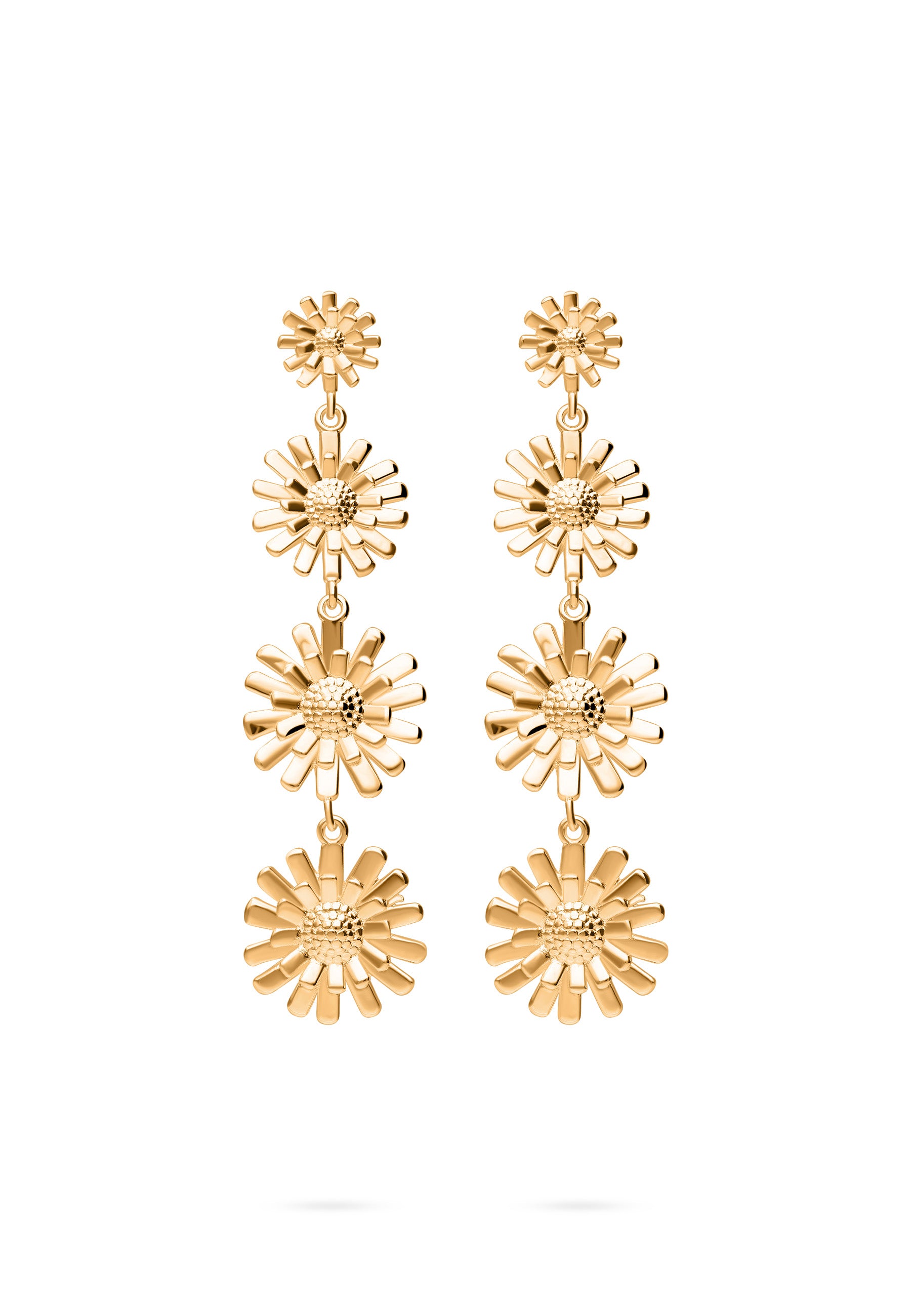 Long earrings, four daisy flowers hanging consecutively and ascending in size, there is no better way to show off an outfit than with these floral earrings.