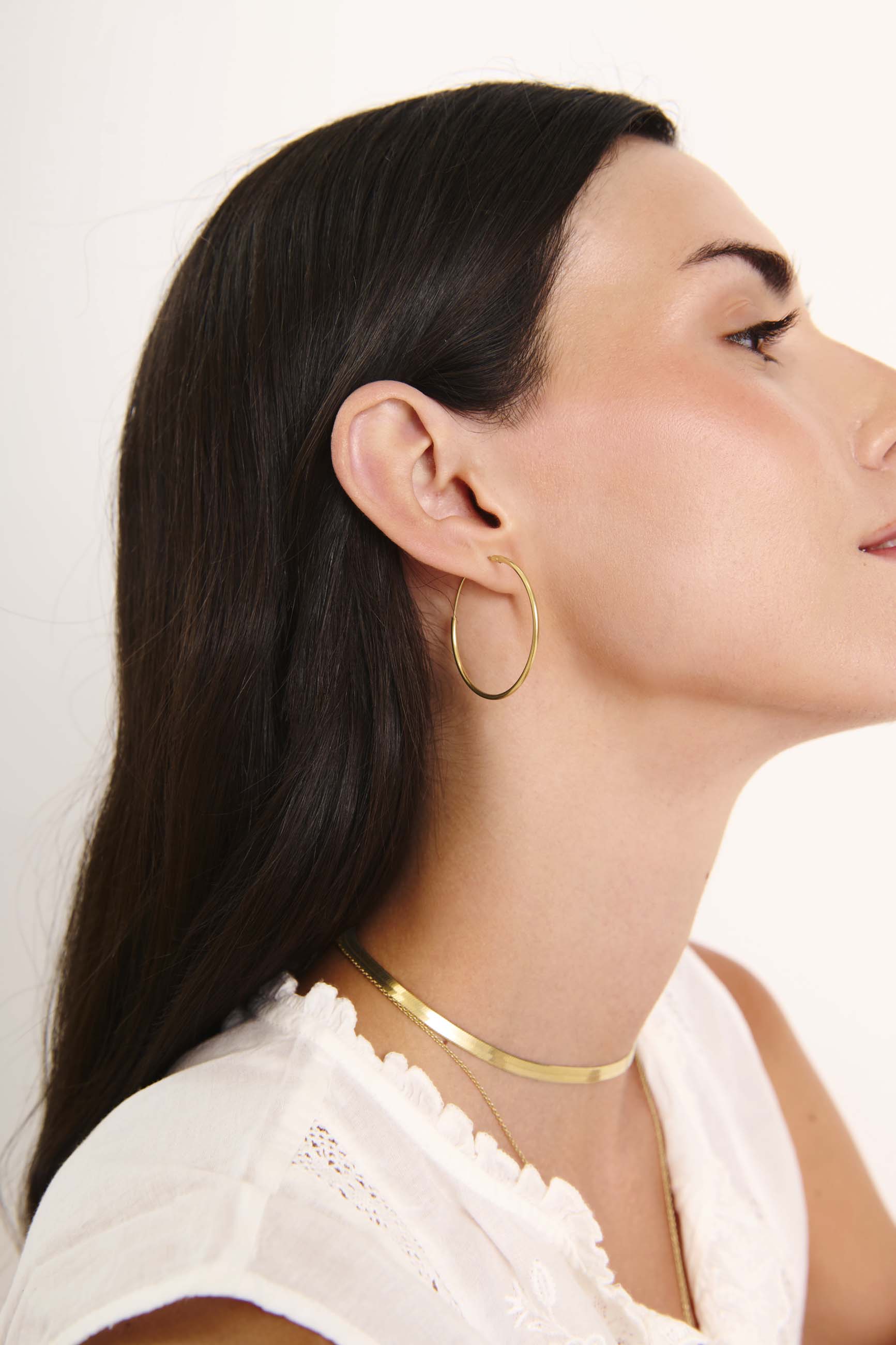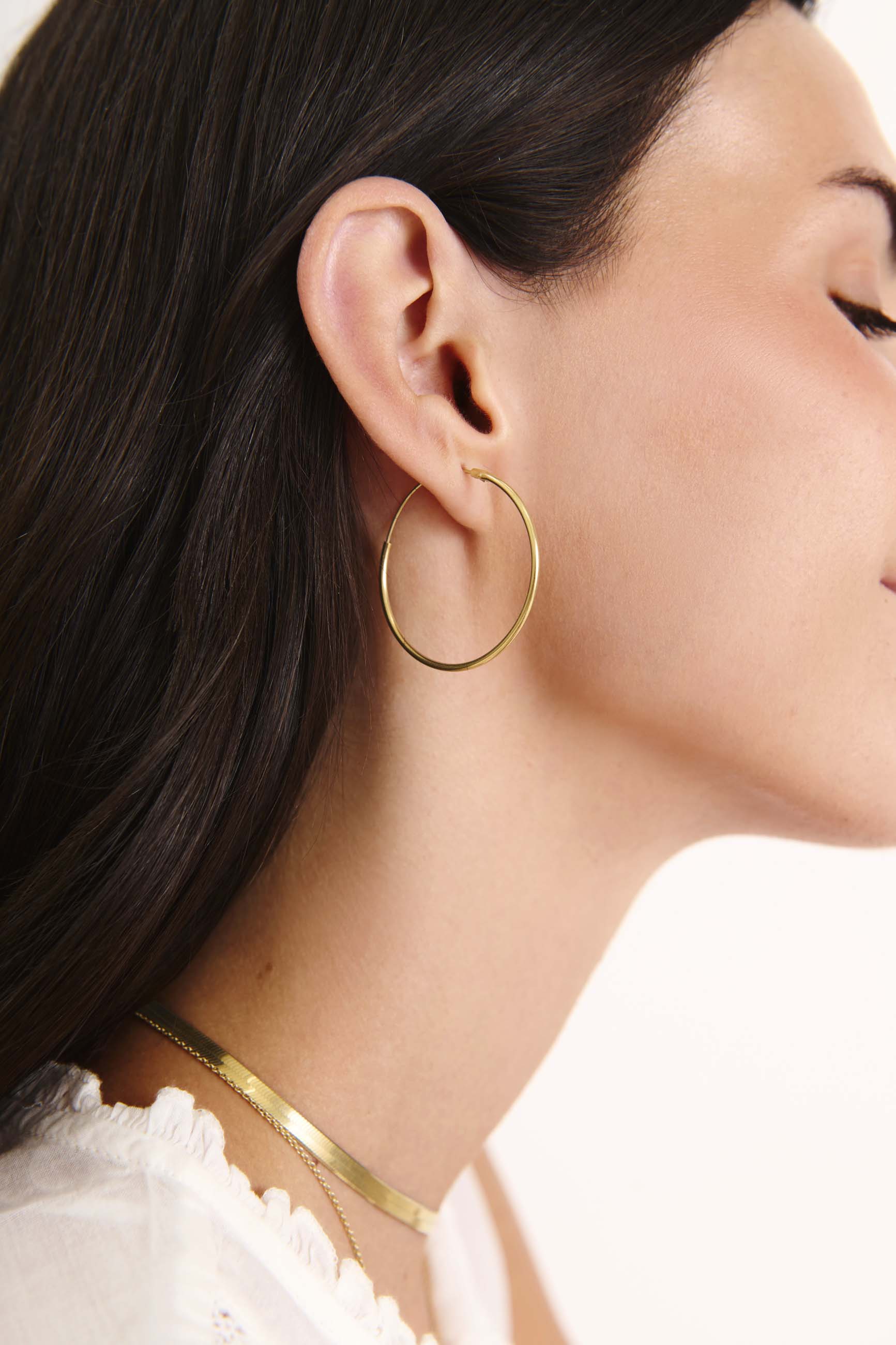 The JIVANA GOLD (35mm) are plain, fine and basic hoops. They are the largest plain gold hoops we have.