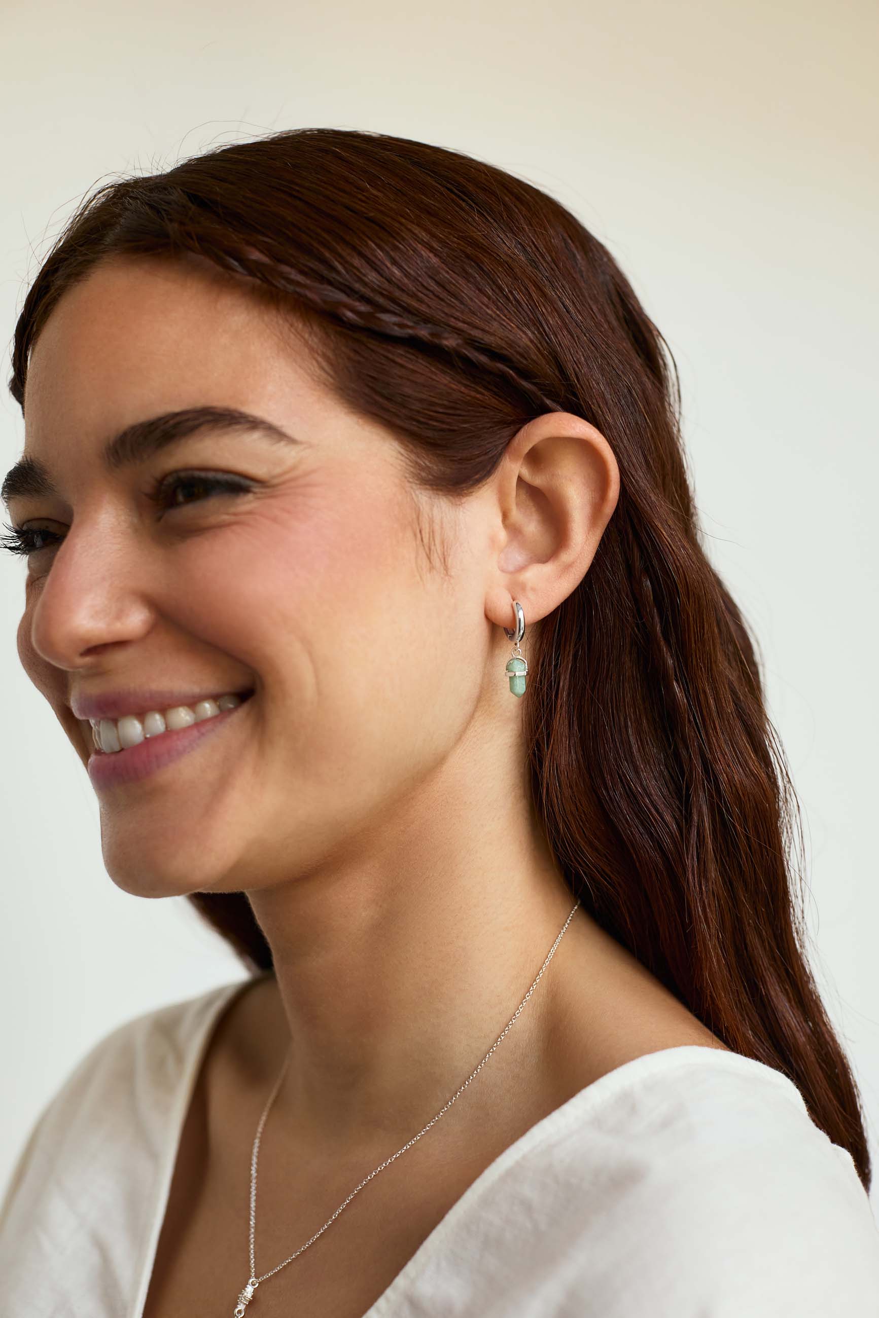 The SURYA earrings are a small 12mm hoops with a beautiful Amazonite stone.