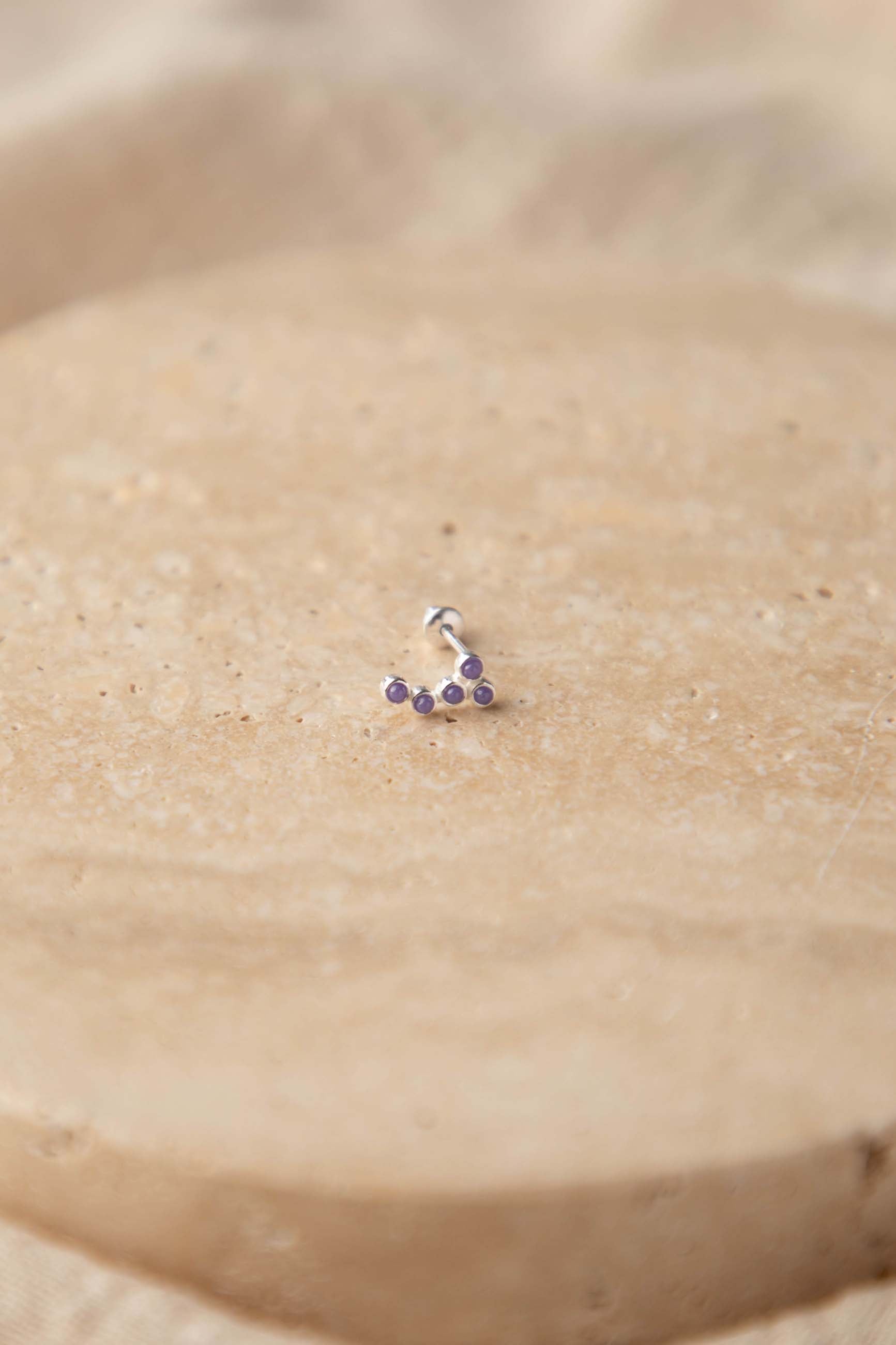 Our exclusive 925 sterling silver piercing, a piece that combines elegance and a mystical touch. This single piercing is adorned with amethysts arranged to form a charming constellation. Each amethyst shines with a beautiful purple hue, bringing an aura of mystery and sophistication to your style.