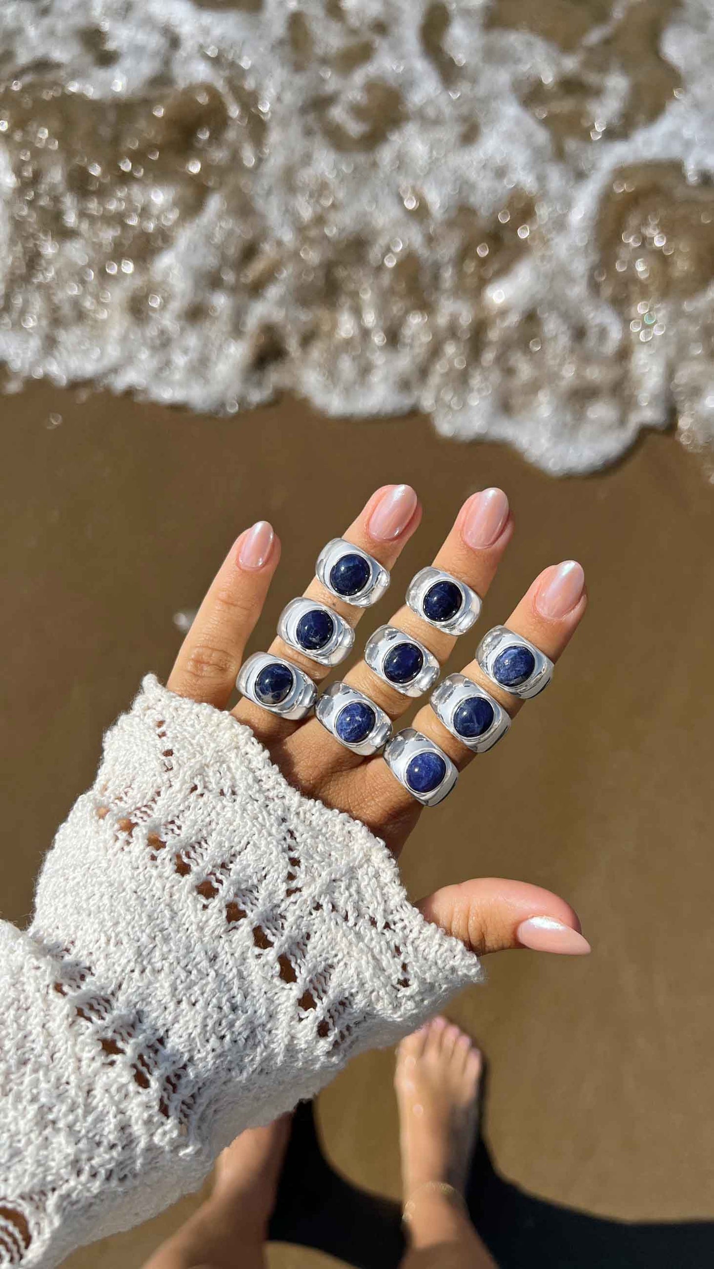 This maxi ring is simply stunning. Made of 925 sterling silver and with a wide and sturdy design, it stands out for its center stone, a round soldiolite with an authentic blue and unique shades that make it really special.