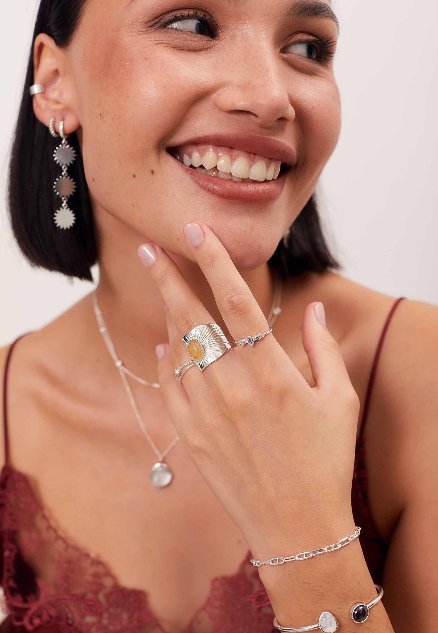 The JYOTSANA is made of 925 Sterling Silver and features an elongated blue topaz stone, accompanied by zirconia and moons on each side. It's spectacular!