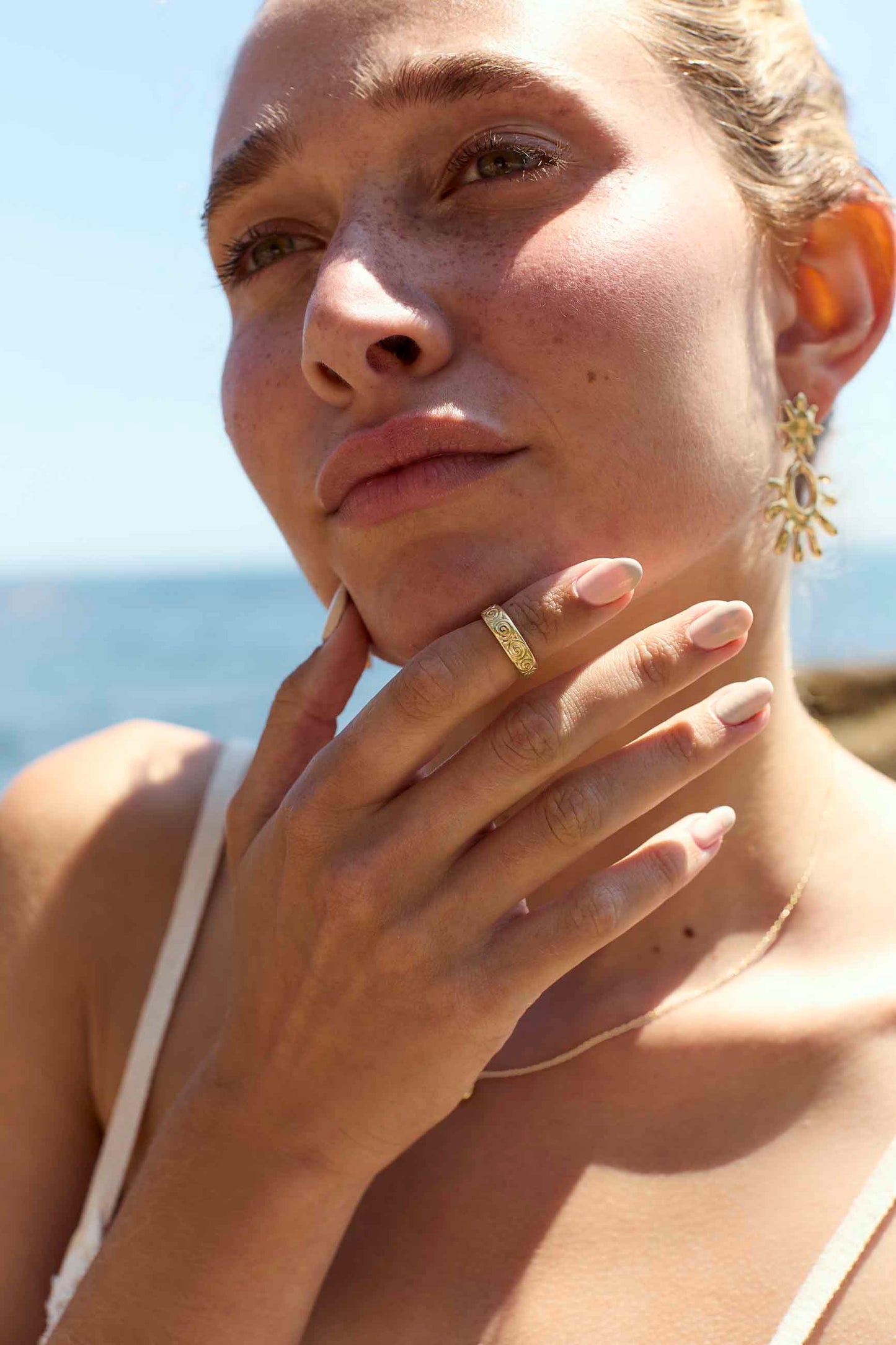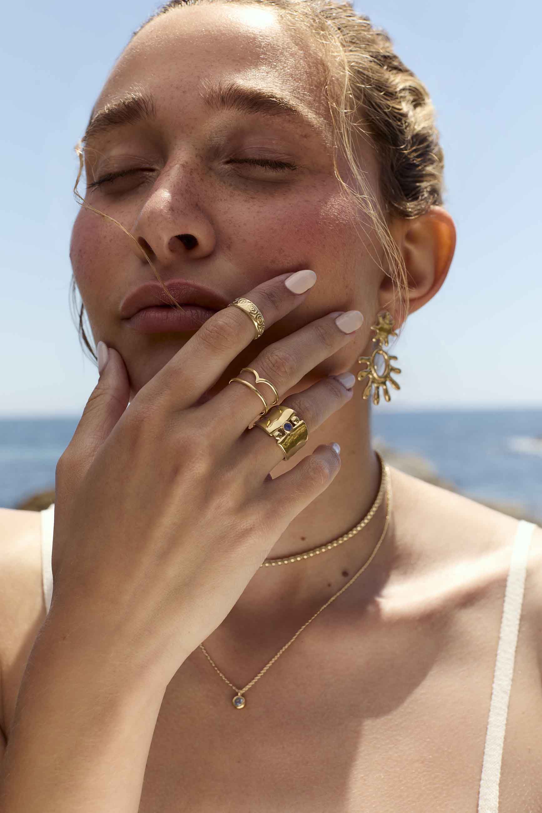 Inspired by the movement of the sea, it features organic shapes and a marine aesthetic that make it a must-have for summer. The golden finish adds warmth and sophistication to any look.