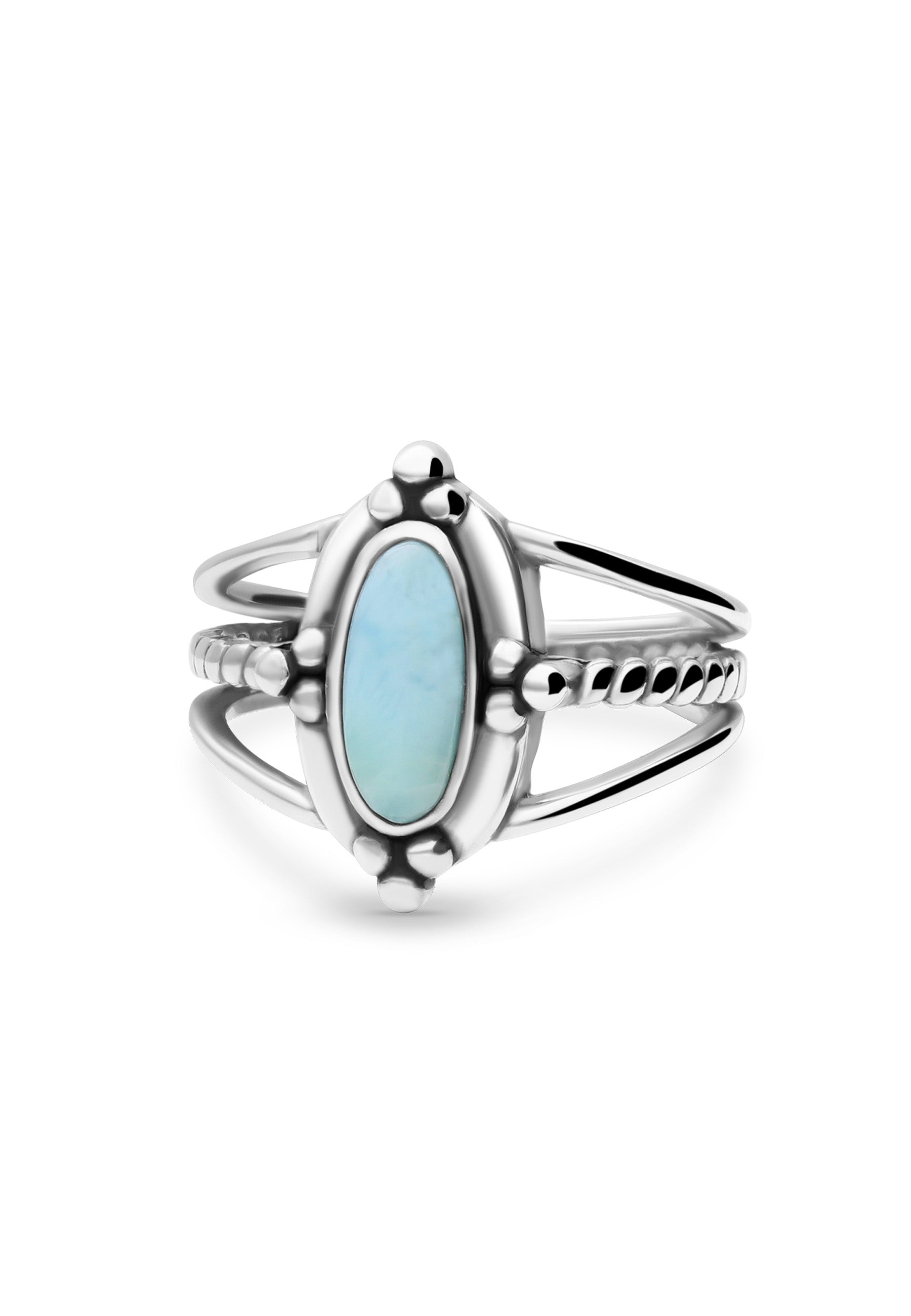 In the center of the ring, and above the three lines, is a beautiful oval larimar stone. This gemstone, with its soft blue hue and serene appearance, adds a touch of natural charm and timeless elegance to the ring's design.